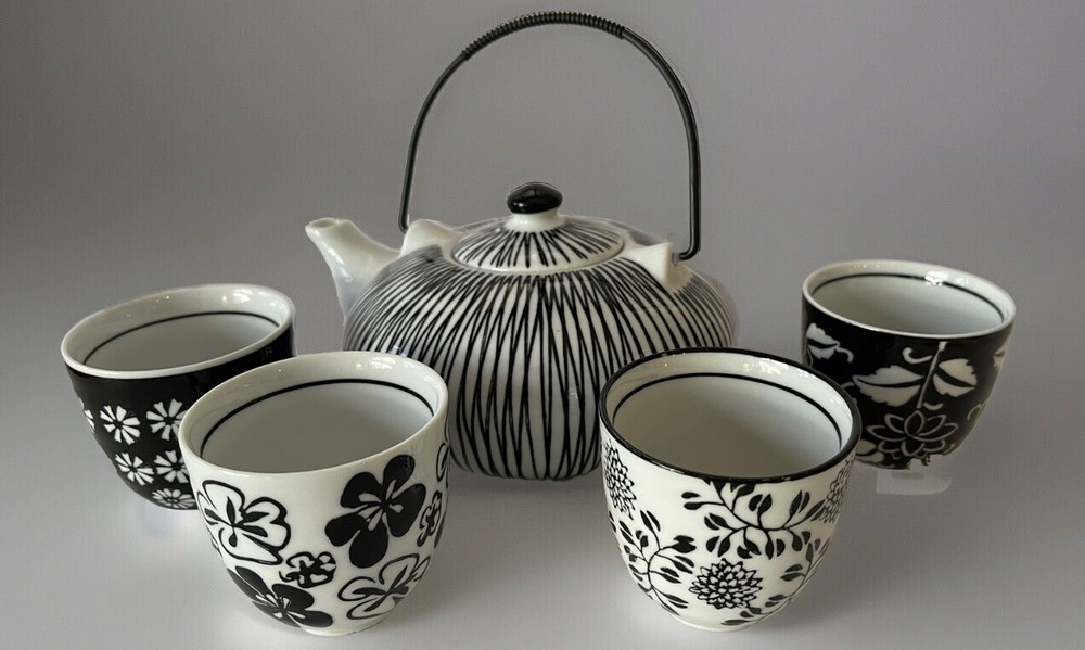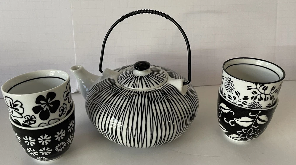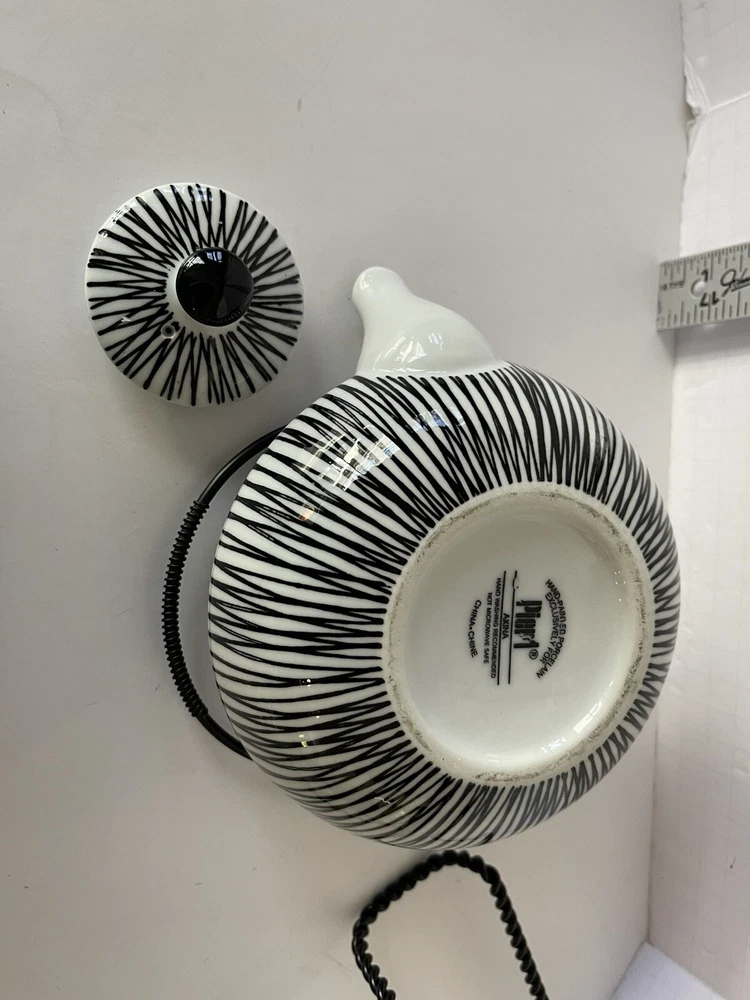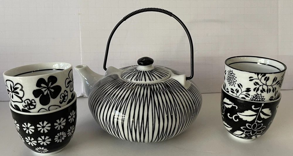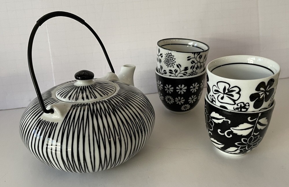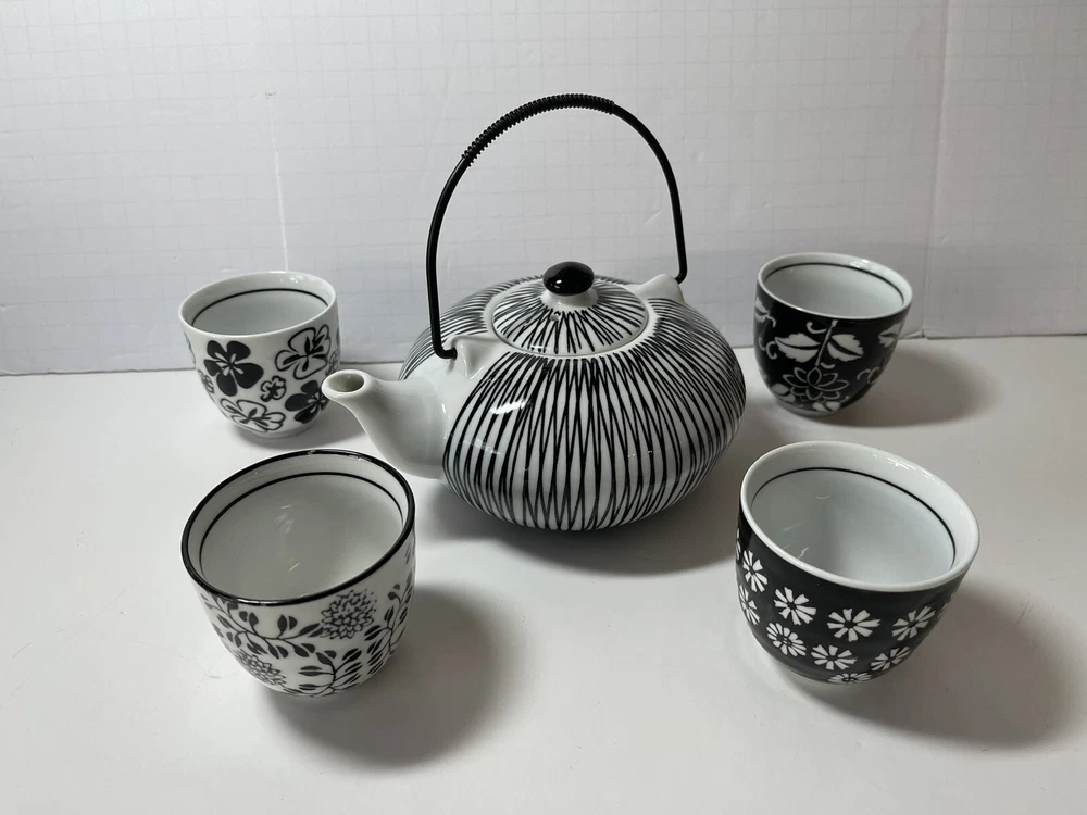 Pier 1 Imports teapot set: 1 Akina white with black diamond striping pattern Teapot and a metal handle. Four coordinating cups: white and black designs to complement the design of the teapot. All five pieces are made of porcelain and is handpainted. Looking at the cups and the teapot, they look unused. I did find one tiny chip on the bottom of one of the cups. The chip is not noticeable unless she picked the cup up and examine it closely under a light.