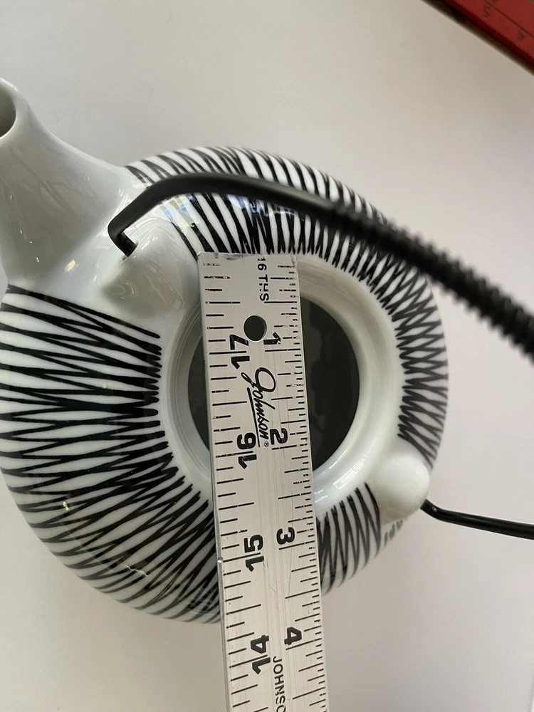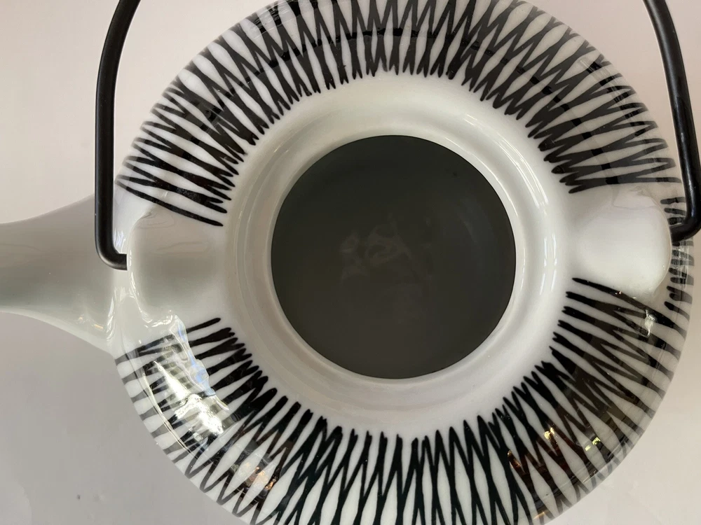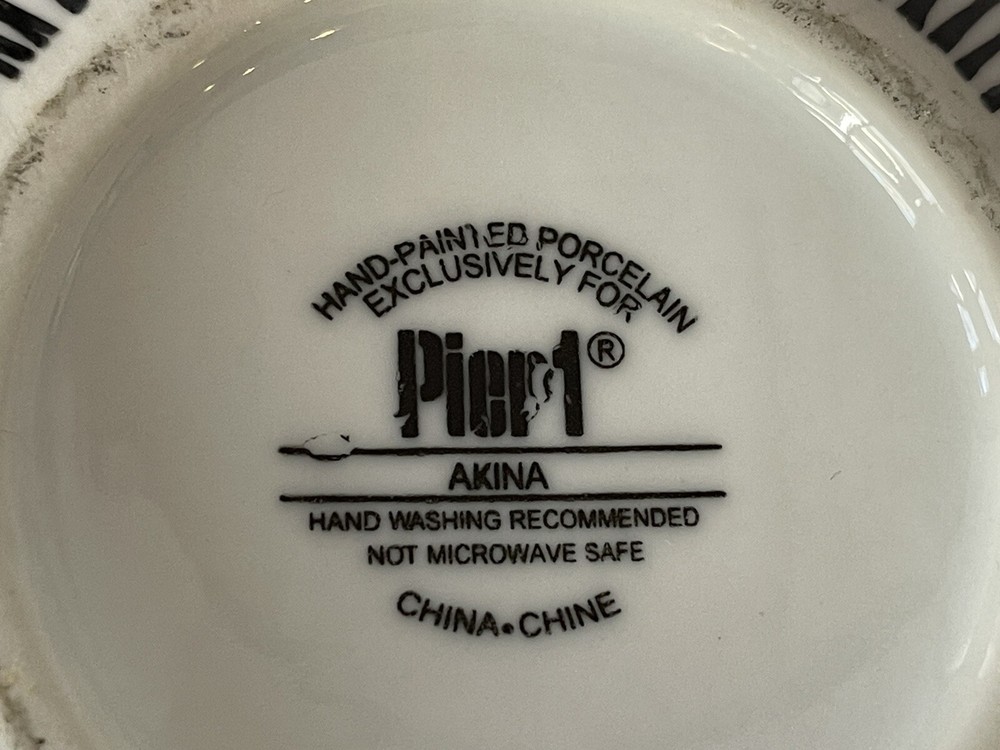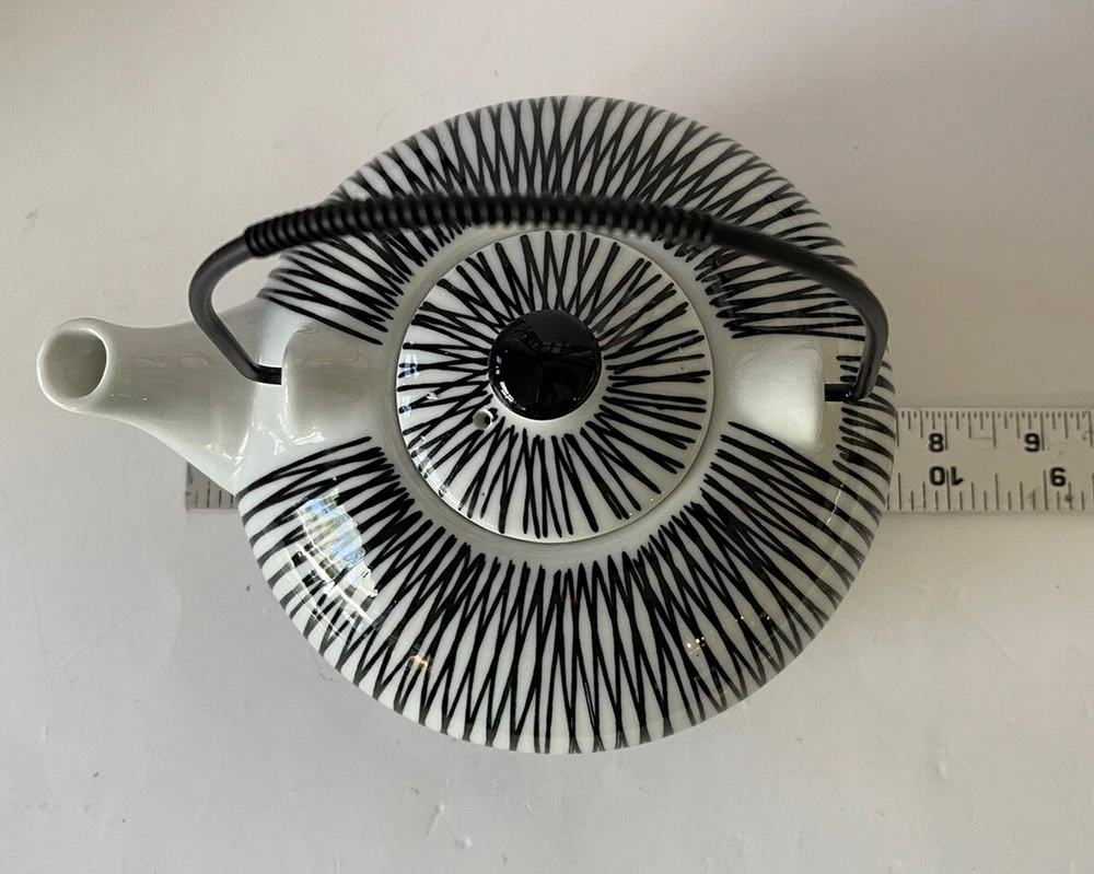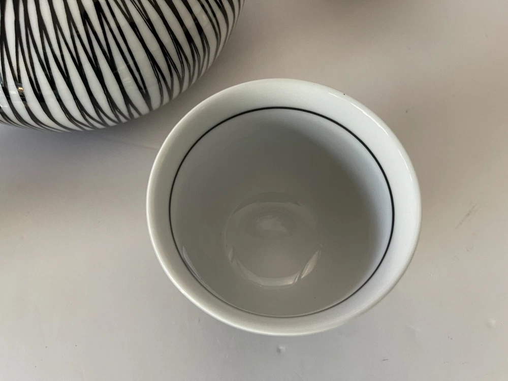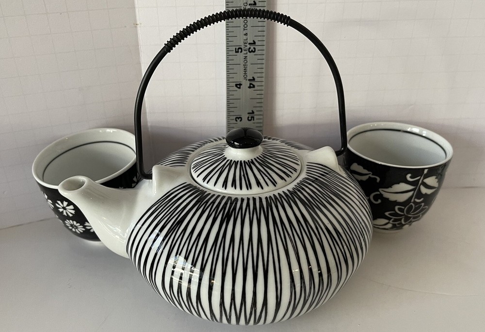 Pier 1 Imports teapot set: 1 Akina white with black diamond striping pattern Teapot and a metal handle. Four coordinating cups: white and black designs to complement the design of the teapot. All five pieces are made of porcelain and is handpainted. Looking at the cups and the teapot, they look unused. I did find one tiny chip on the bottom of one of the cups. The chip is not noticeable unless she picked the cup up and examine it closely under a light.