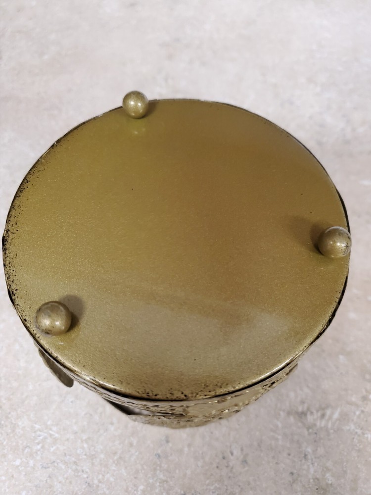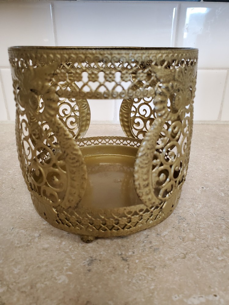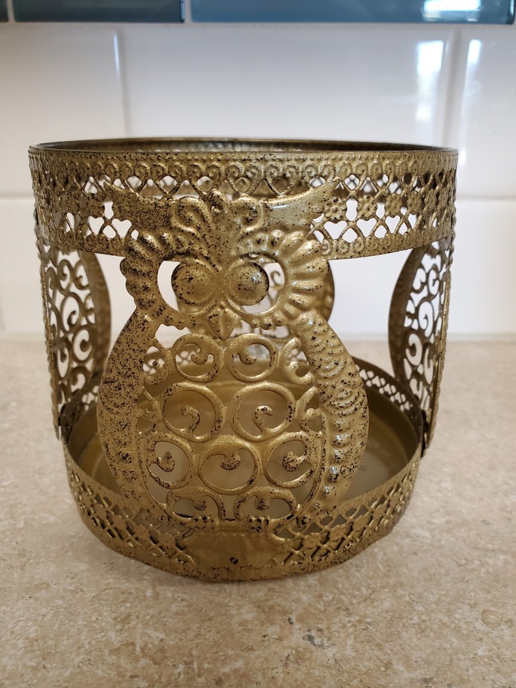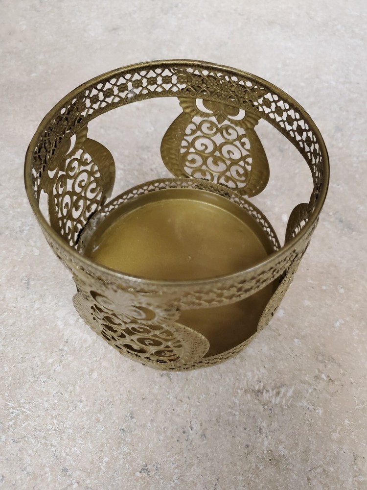 This is a Pier 1 Owl Candle Holder made of gold tone metal with a round shape and a size of 4.25 inches in height, length, and width. It has a tri-foot design suitable for votive candles and features an owl pattern. The candle holder does not come in its original box and is suitable for indoor use, ideal for any room as a decorative piece. It weighs 4.8 oz and is an original piece. Pier 1 was founded San Mateo, California in 1962 as Cost Plus Imports. They began importing goods from Asia and sell them at a lower price than competitors. In 1966,the company moved it's headquarters to Fort Worth, Texas and changed its name to Pier 1 Imports.