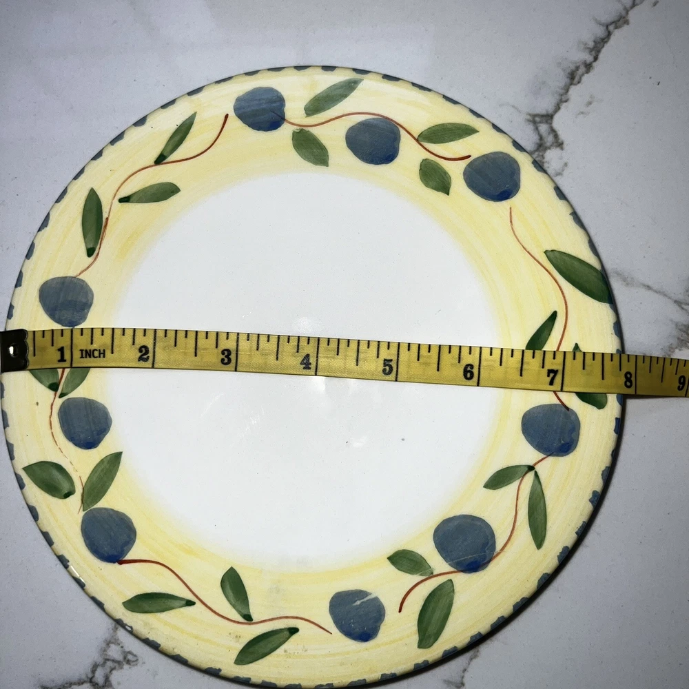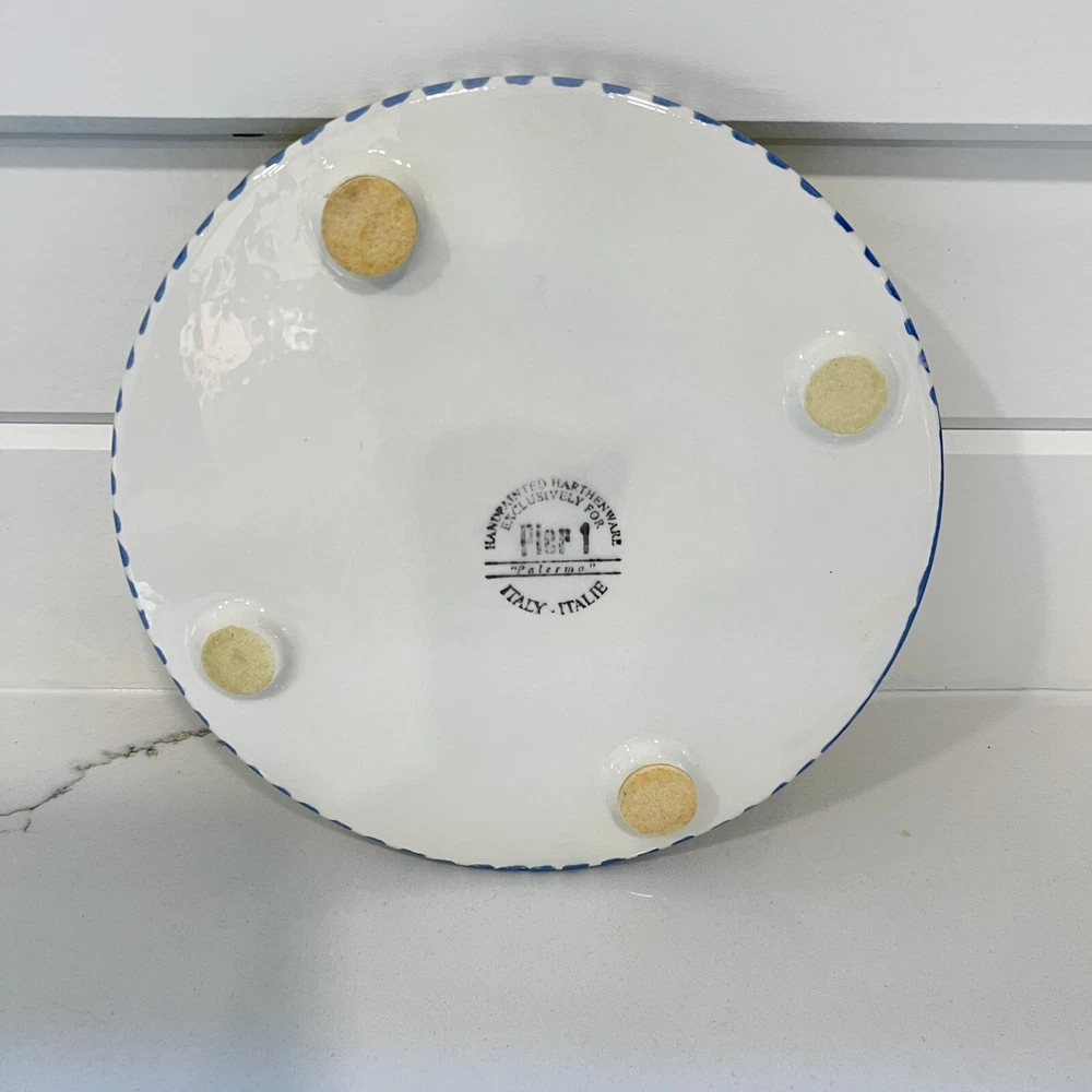 10Add a touch of Italian artistry to your kitchen with this beautiful Pier 1 PALERMO Trivet Hot Plate. The round plate measures 8 inches in diameter and is made of ceramic with a glossy finish. It features a hand-painted floral pattern in yellow, blue, and green colors, making it a perfect addition to any occasion's dinnerware. This original piece is from Italy and is licensed by Pier 1. It is machine washable up to 100°F and is printed with the brand's backstamp. The plate is part of the Palermo product line, which adds a unique touch to any kitchen. The trivet is handmade with the production technique of earthenware, making it a one-of-a-kind piece. Retired pattern.