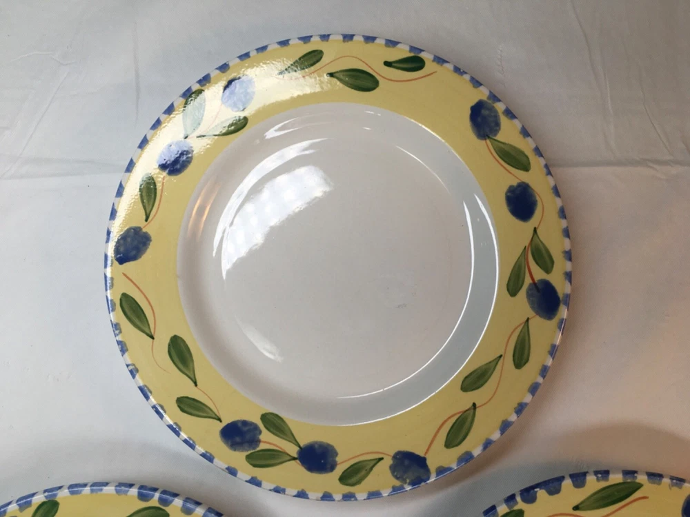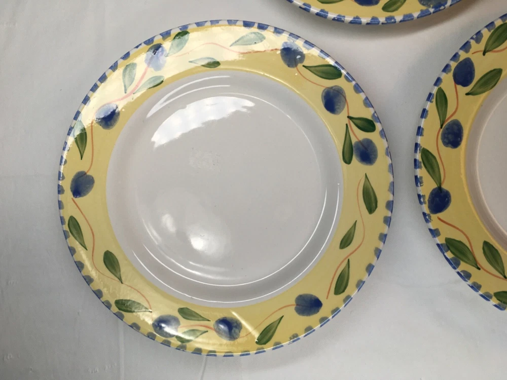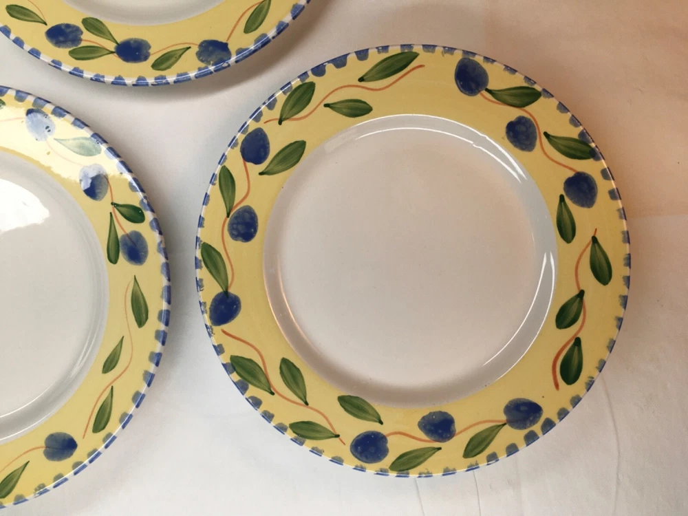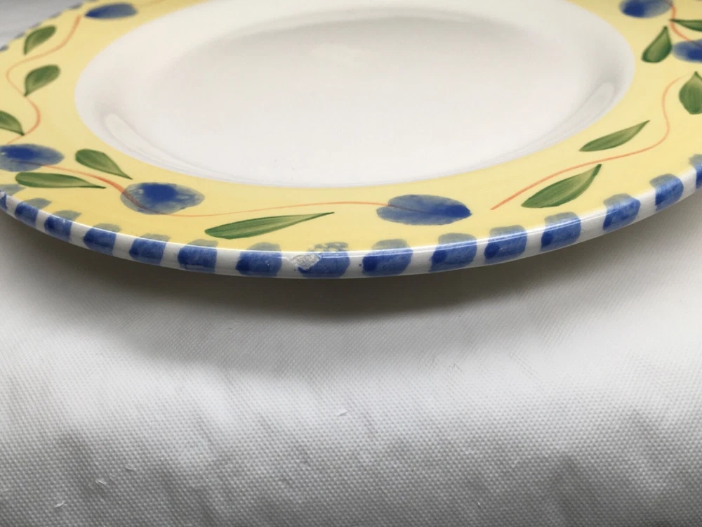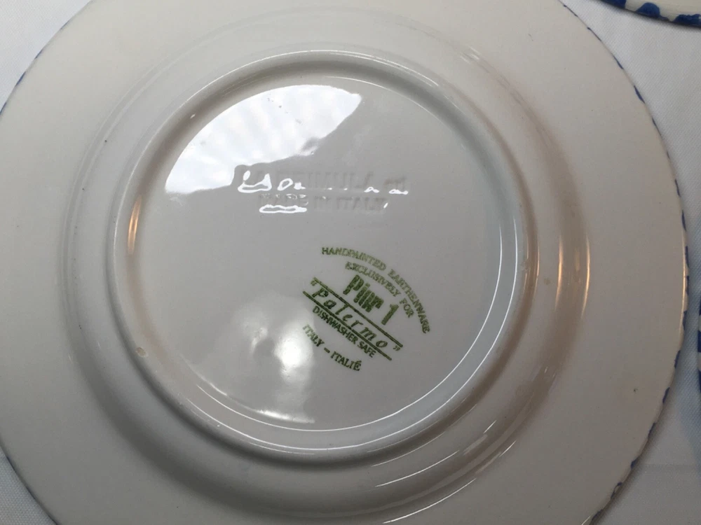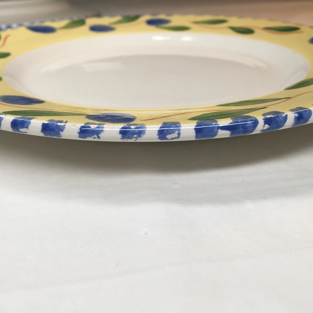 | Features | Decorative, blue olives on yellow band trim., Pier 1 Palermo made by La Primula Italian Pottery Company., discontinued and hard to find |