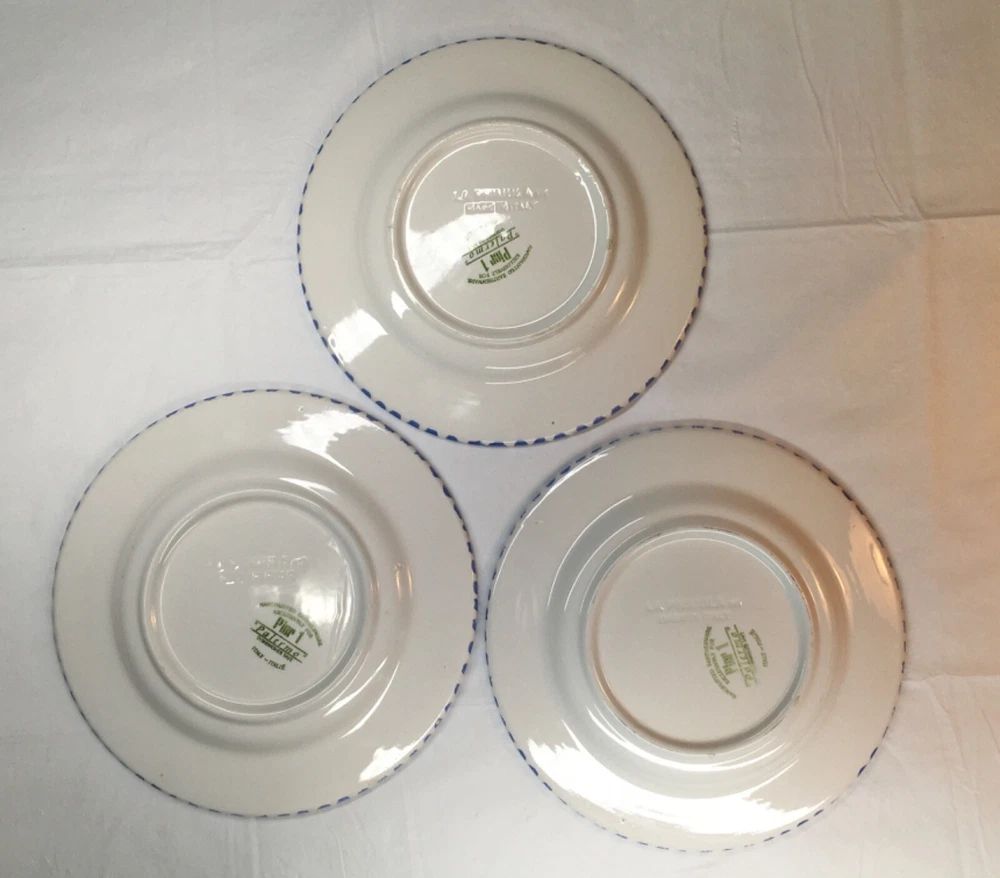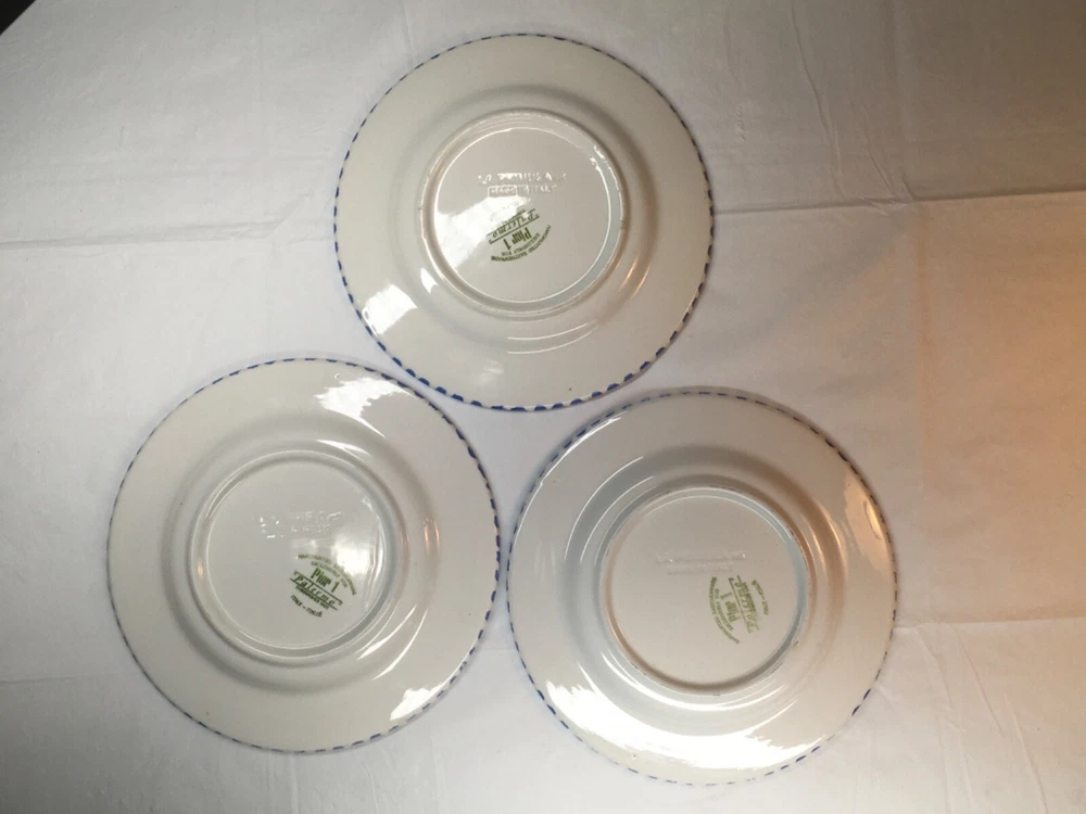 Lot of 3 ceramic dessert plates OR salad plates OR bread plates, use as desired, they measure 7 & 7/8" wide. Shallow chips can be repaired OR touched-up with ceramic epoxy. Shipping includes Handling.