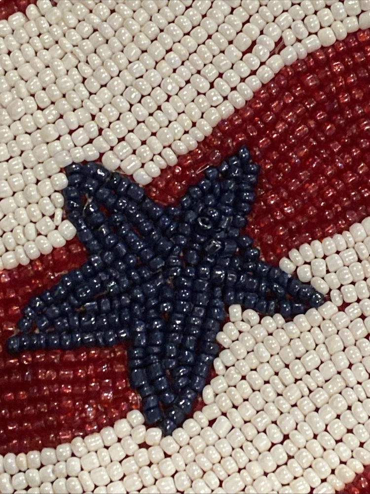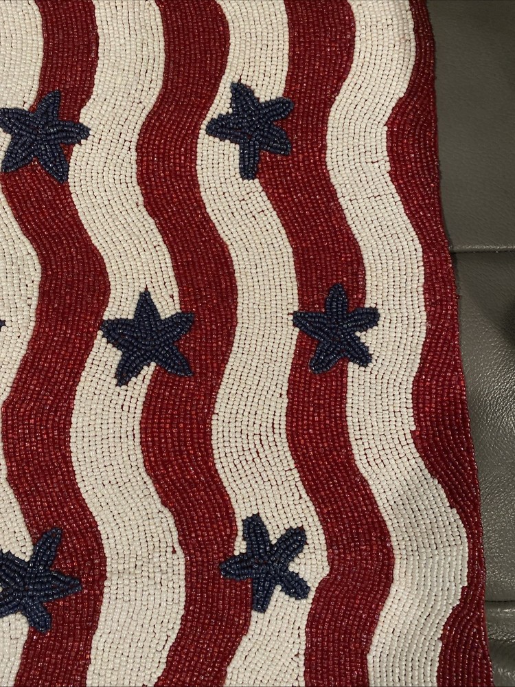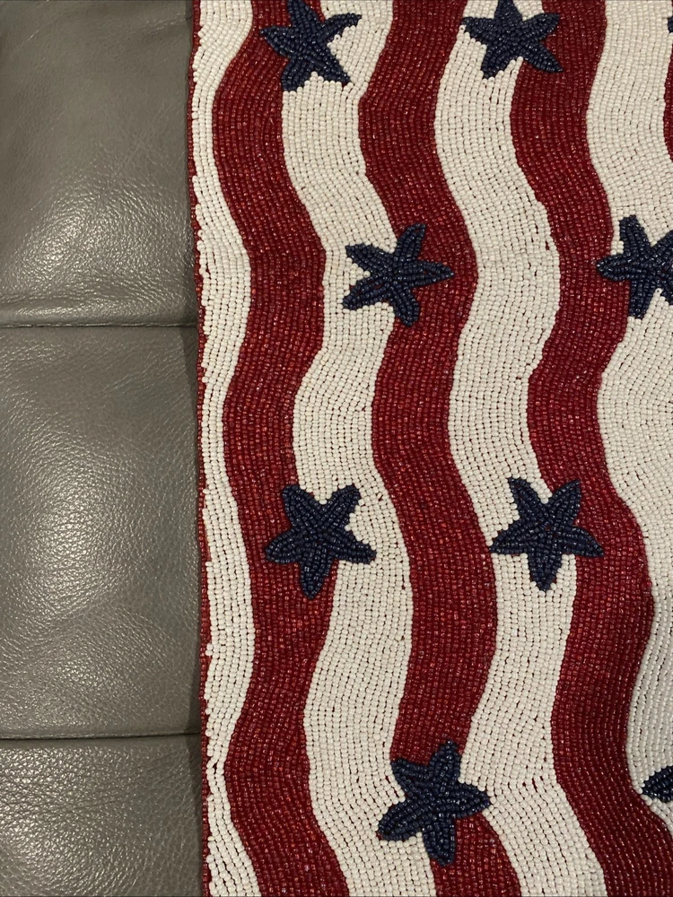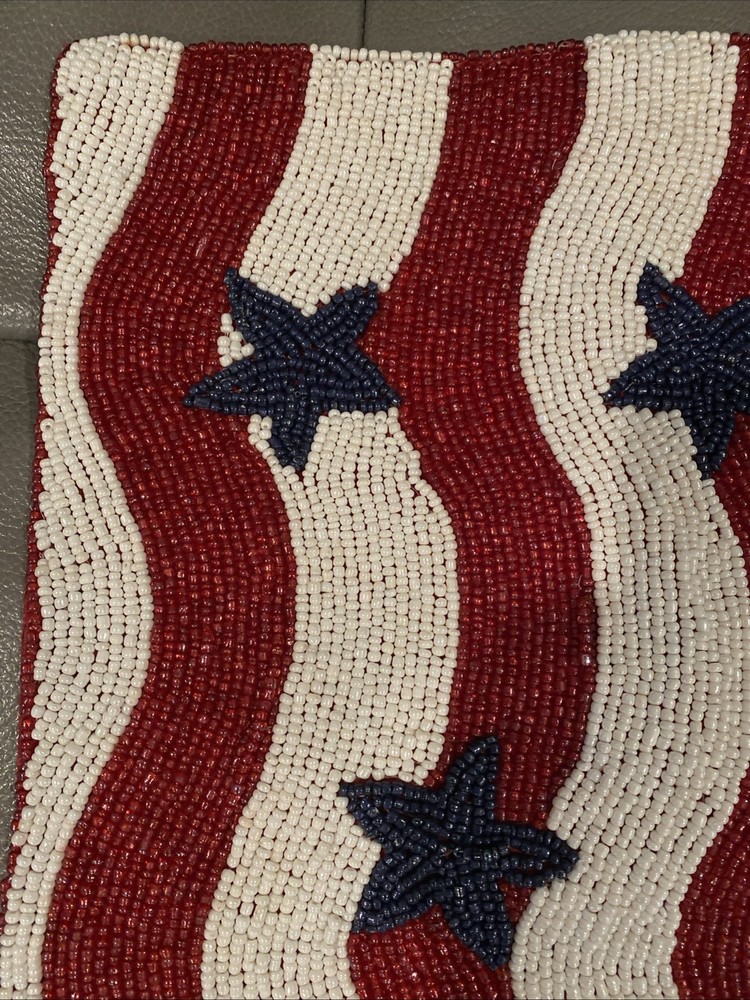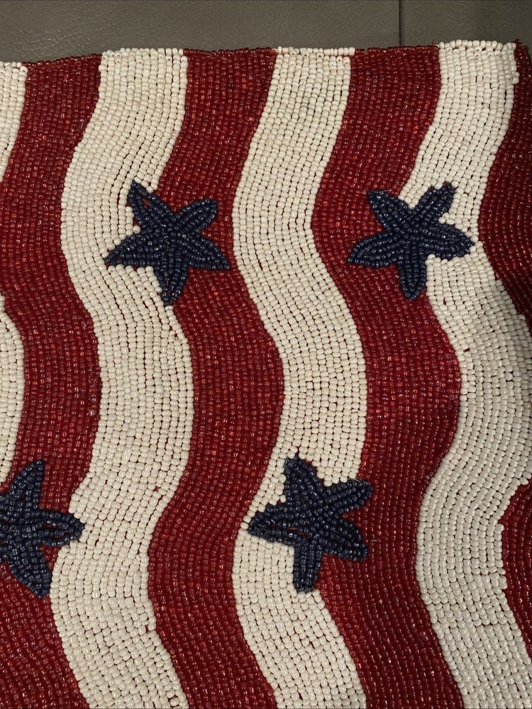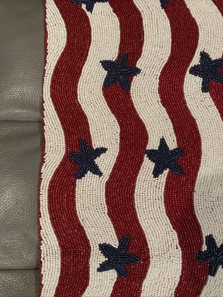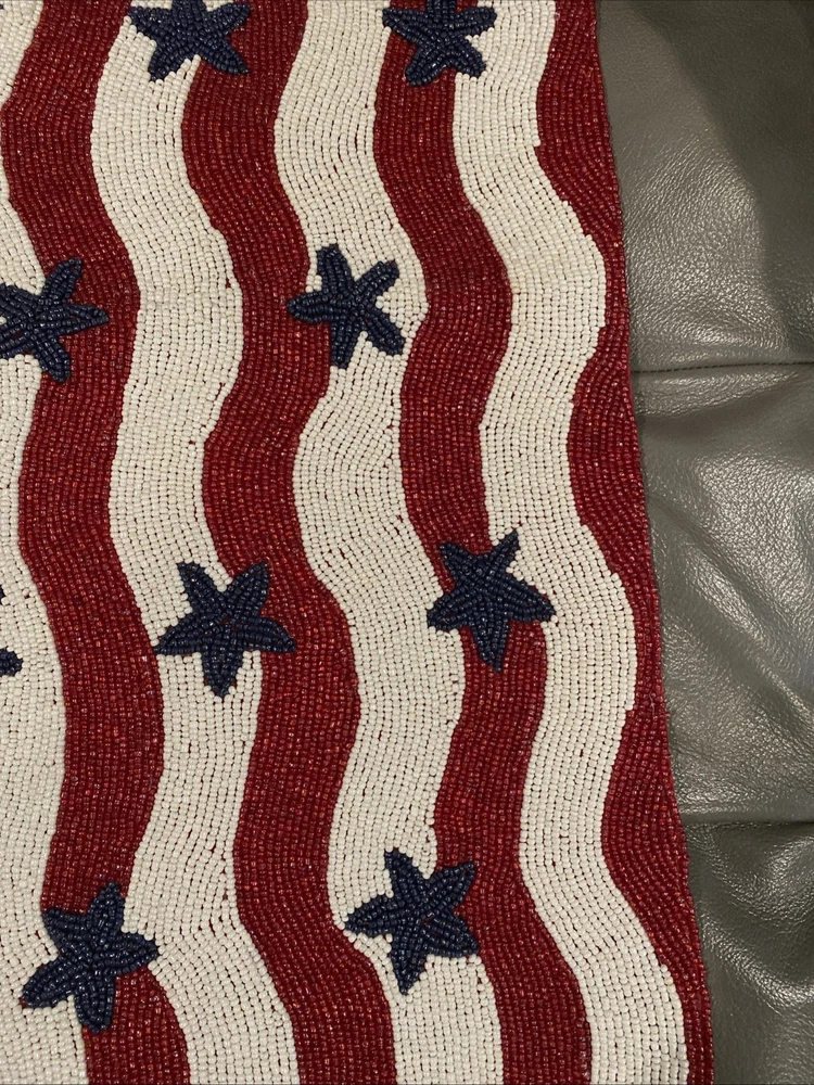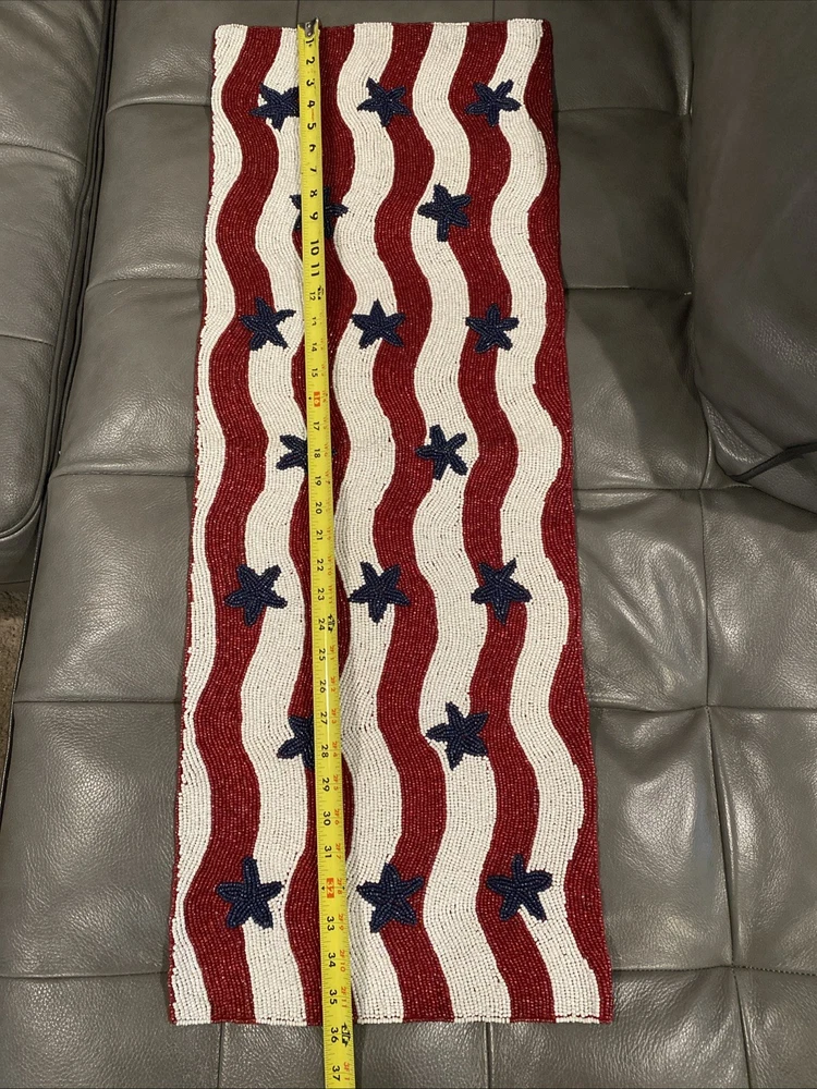 Pier 1 Imports Patriotic Hand Beaded Table Runner 36”x13” Stars & Stripes USA, in really good condition, with original sticker. Please check all the photos for details as they are part of the description.