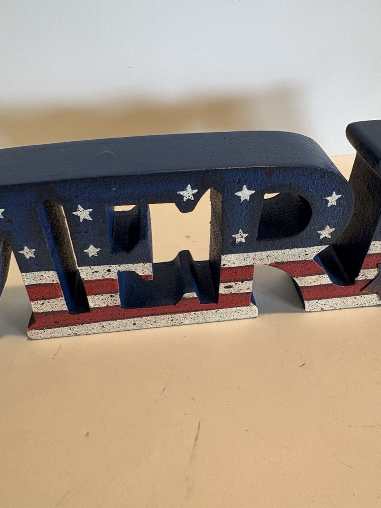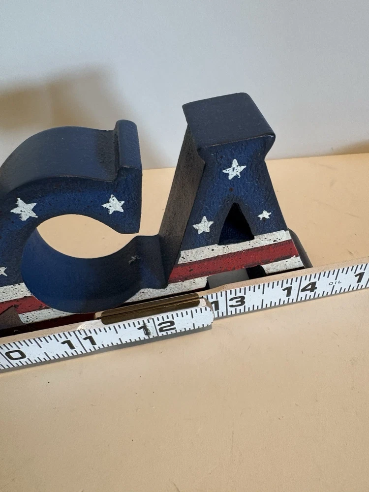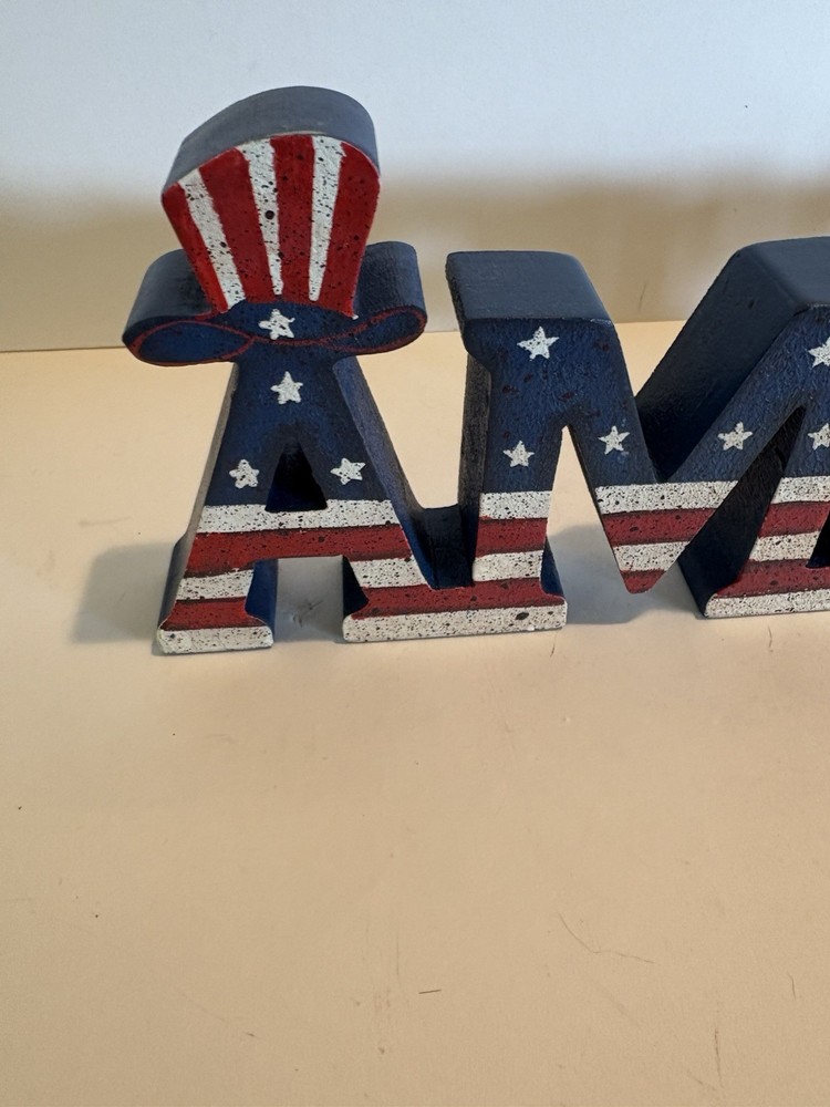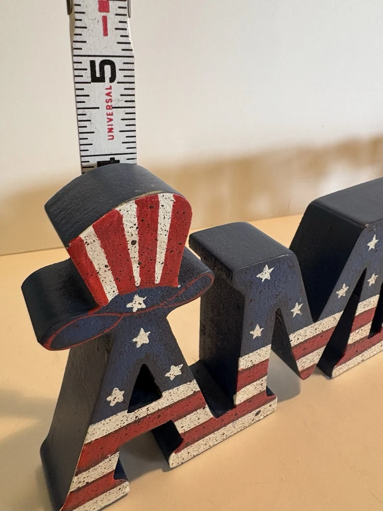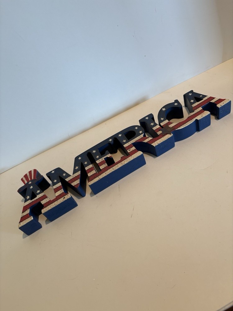 The Pier 1 Patriotic Wooden "America" Decor Sign features a rectangular design with an American flag motif, perfect for adding a patriotic touch to any room in your home. Made of wood and standing at 4 inches tall, this decorative sign from Pier 1 Imports includes a wooden base for easy display. The red, white, and blue color scheme and American flag subject make it a unique and stylish addition to your home décor, weighing 11 oz and ready for free-standing mounting in any room.