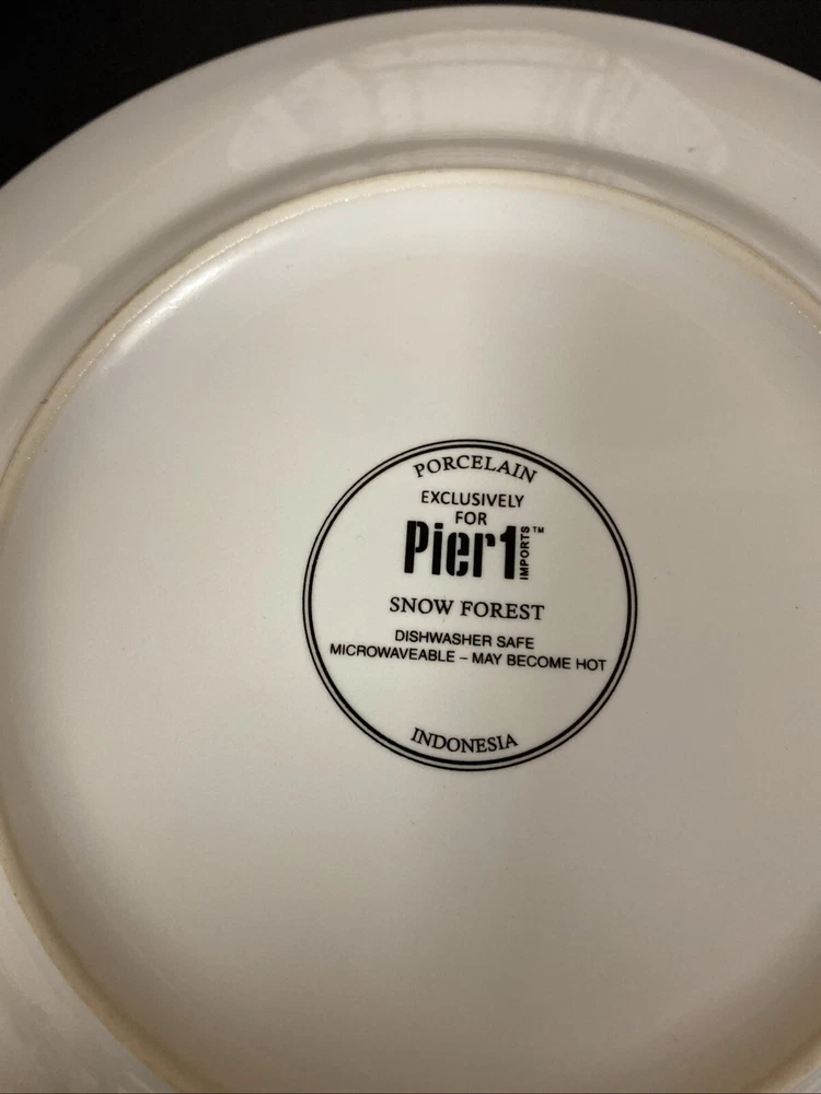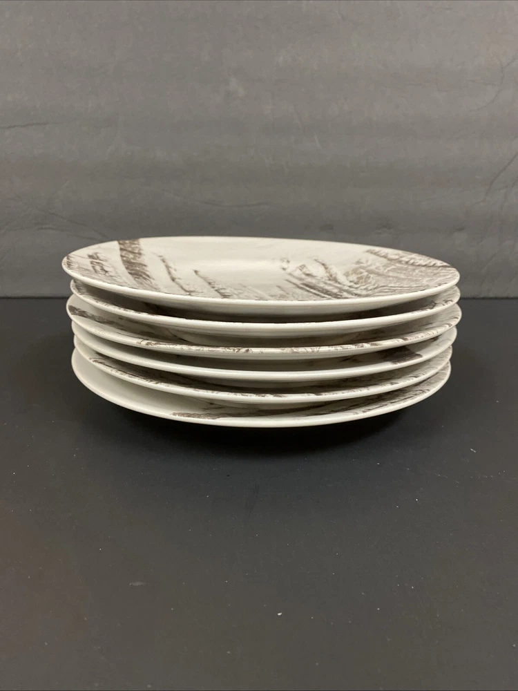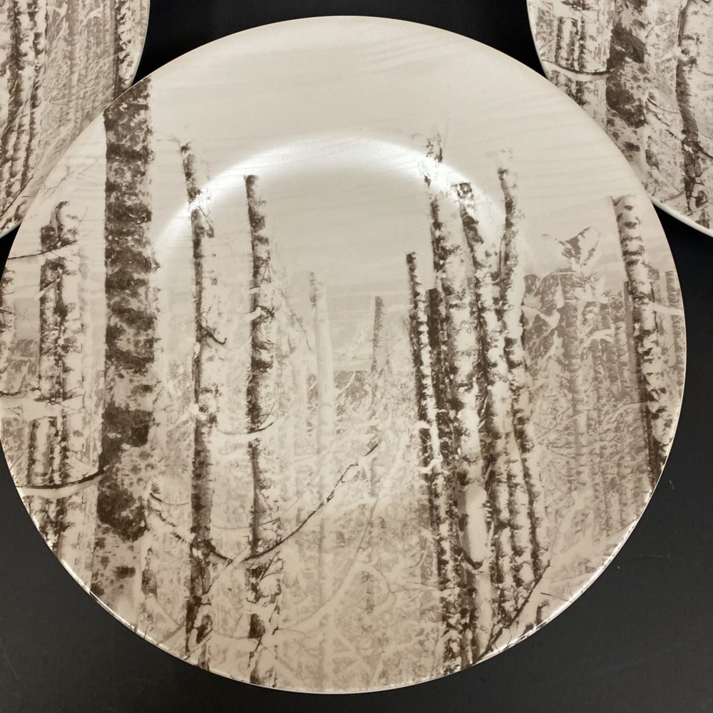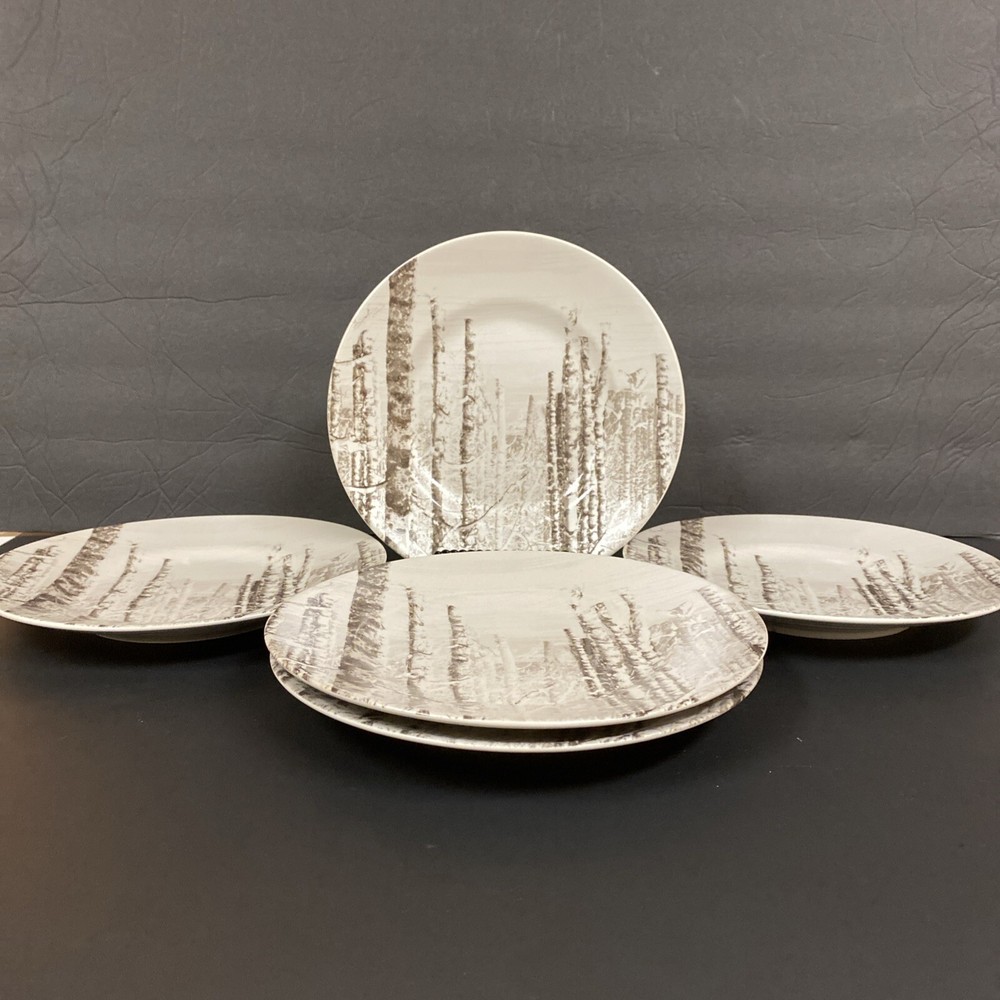 Pier 1 Imports "Snow Forest" salad/dessert plates. Each plate in this six-piece set features a charming woodland pattern with a serene birch tree theme, perfect for seasonal gatherings or everyday elegance. Crafted from high-quality porcelain with a semi-matte finish, these plates measure 8.75 inches in width and are designed to stack seamlessly for a space-saving dinnerware solution. Pre-owned with no nicks chips or cracks. Please review all photos carefully as part of the description.
