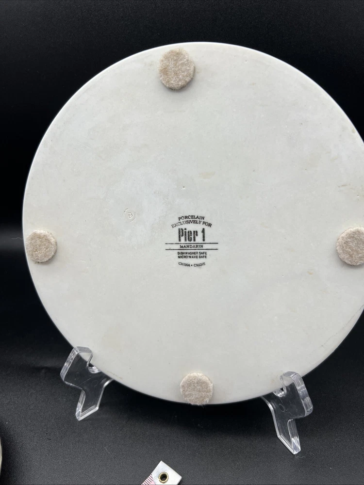 The Pier 1 Pier One Import Blue and White Round Mandarin Trivet Hot Plate is a vintage 2008 American Directoire style piece from the Blue White product line. This 8-inch ceramic plate features a floral pattern in blue, with a glossy finish. It is designed as a decorative and functional hot plate, suitable for all occasions and adult use, with hand wash care instructions. The trivet hot plate is an original item from Pier 1, adding a touch of elegance to any table setting with its classic design.o