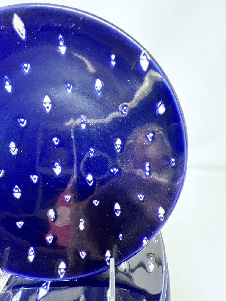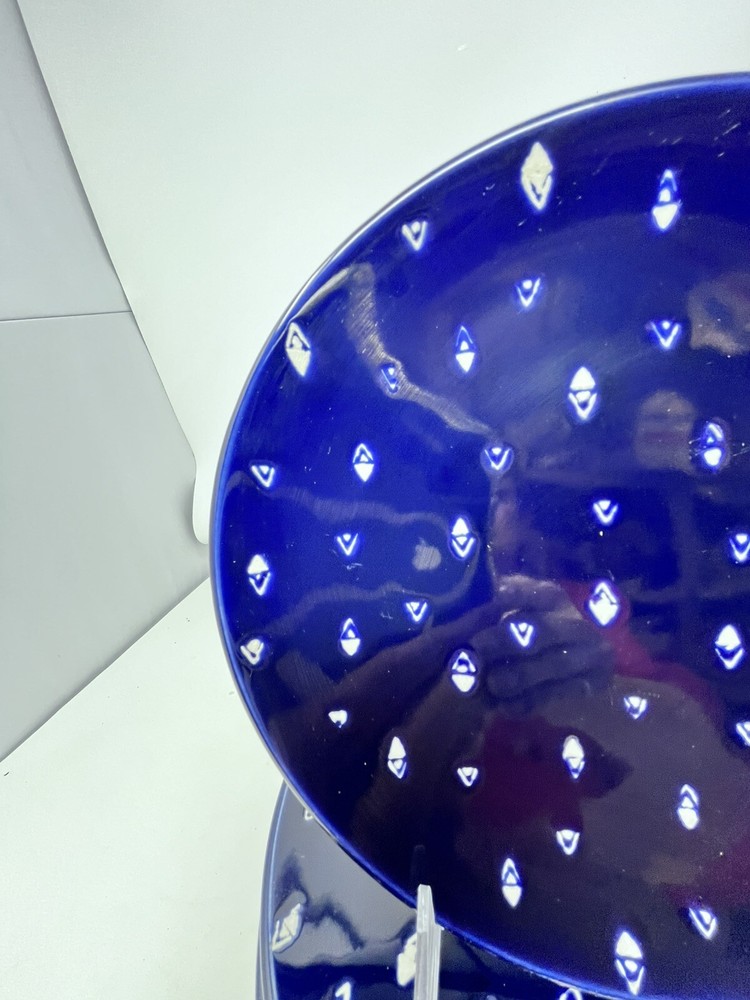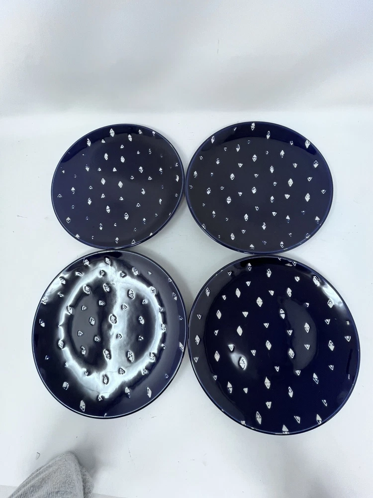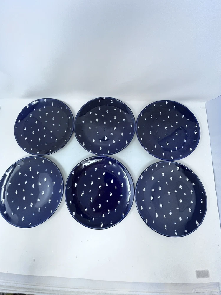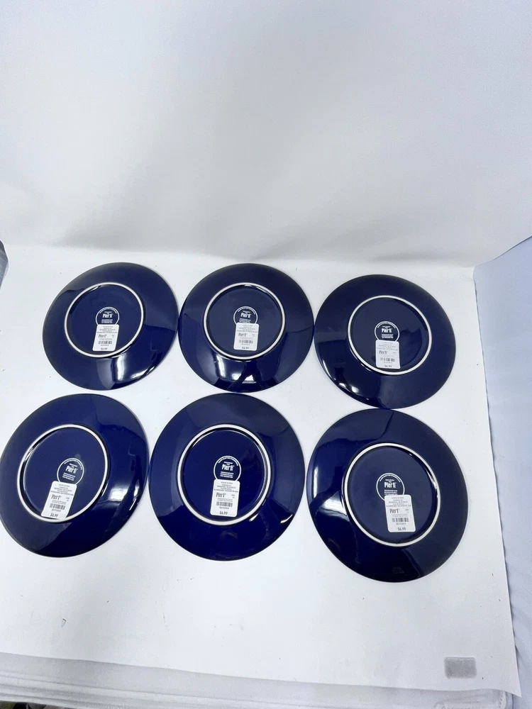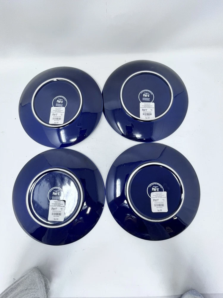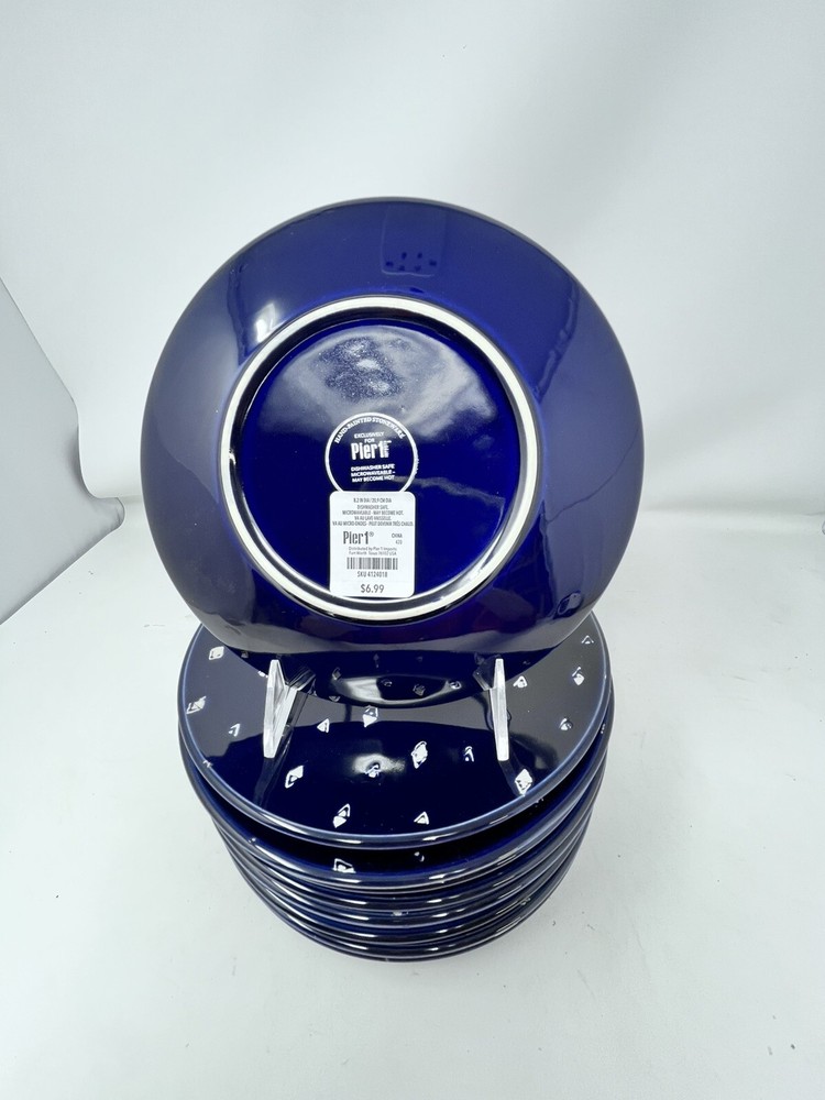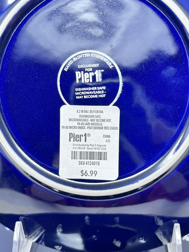 Add a touch of sophistication to your dining table with this beautiful Pier 1 Pier One Imports Cobalt Dessert/Salad Plate. The round plate has a diameter of 8 1/4 inches and features a stunning cobalt blue color that is perfect for all occasions. Made of high-quality stoneware and ceramic, this contemporary original plate is both durable and stylish. This salad plate is part of the Pier One product line and is an original, licensed reproduction. The glossy finish and art pottery production style make it a unique addition to any collection. The plate is printed with a backstamp and weighs 13.5 ounces. Order now and add this exquisite piece to your collection! Vintage items may have flaws in glazing or minor crazing due to age. All are in great condition with no chips or cracks. Please check out my other listings for coordinating item. Price is per piece or set as described.