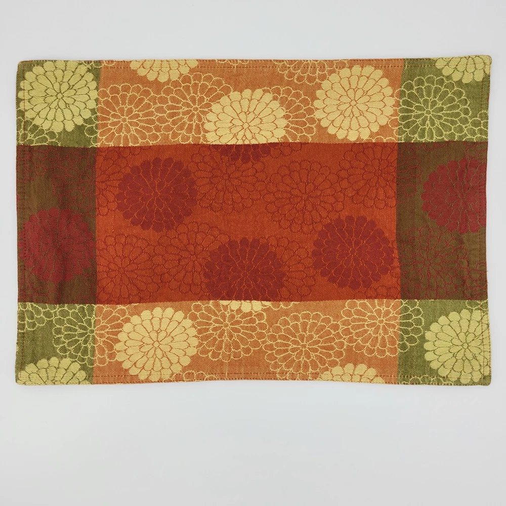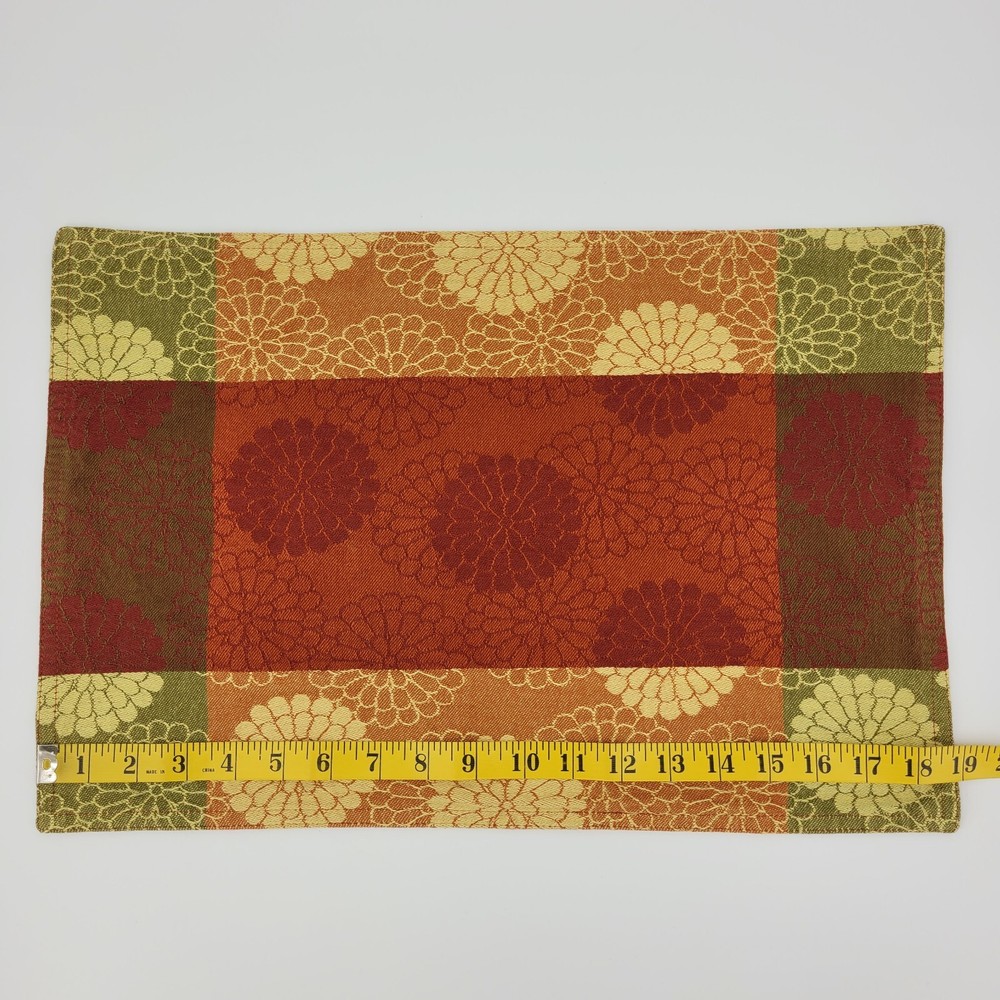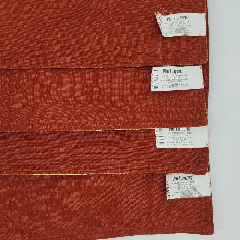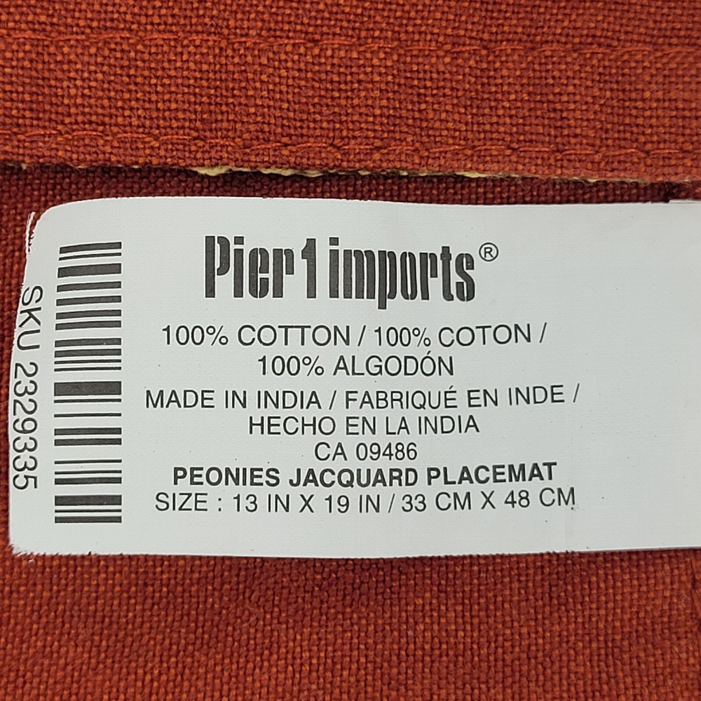 These Pier 1 Placemats are a Set of 4 and are in pre-loved condition. It's a Set of 4 Pier 1 Jacquard Peonies Plaemats in red, green, yellow, and orange with solid red back. Machine washable and measure 13"x19" Feel free to ask questions and please see the pictures for details and measurements. Pre-loved condition these Placemats have been used and washed. Some signs of use. Tiny stain and top stitching flaw on one placemat. Noted in pictures. See Pictures! I do not accept returns. Please use measurements, description and pictures for determining size and condition prior to purchasing. Will ship folded in a polymailer. Thanks!