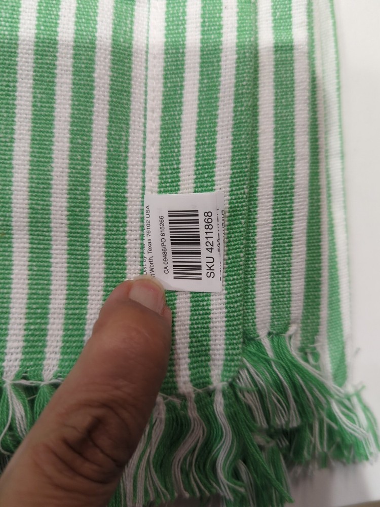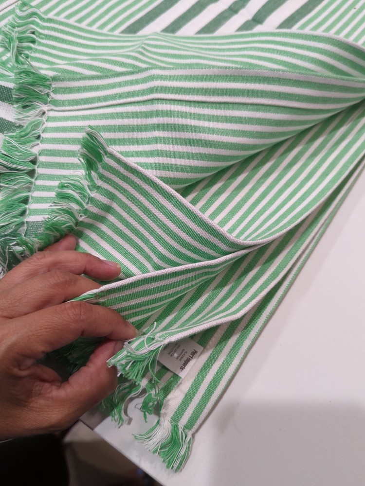 Set of 6 Heavy duty Pier 1 imports Deep Green stripes with fringe 100% cotton placemats These placemats are a great basic to dress up into a formal meal, or for something casual. Easily adds texture and visual interest to any table. DII offers delightful Kitchen Linens including dishtowels, dish cloths, aprons, potholders and oven mitts. You can trust DII when selecting functional, stylish and affordable home accessories. Let DII products become a valuable part of your life." Dimensions: 19"W x 13"D x 0.2"H Reinforced edges Green and white fringe Material: Cotton From a smoke free pet free home. Perfect for a gift!! Machine wash Made in India