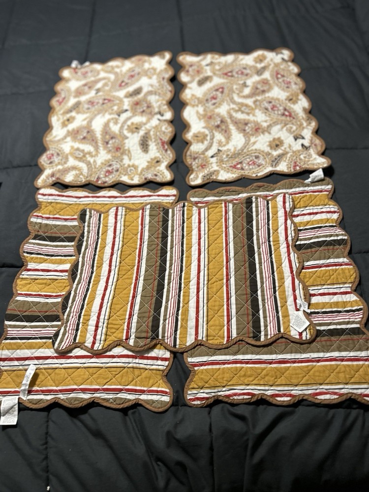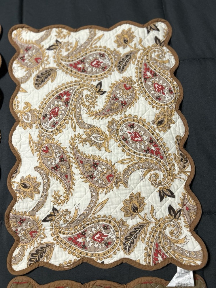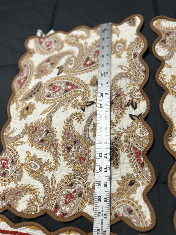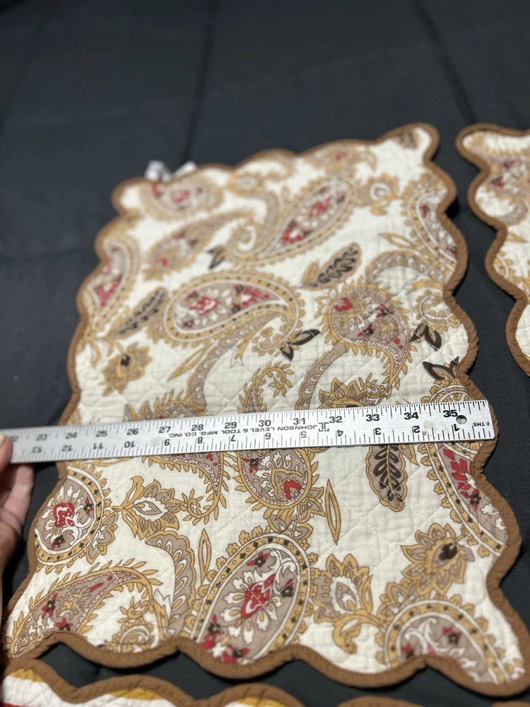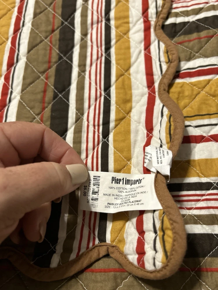 The Pier 1 Placemats Set adds a touch of bohemian fashion to your dining table with its multicolor paisley and striped design. Made from 100% cotton, this set of 5 rectangular placemats features tulip edges for a stylish finish. Perfect for multipurpose occasions, these placemats bring a touch of sophistication to your dining experience. See all the pics Beautiful pieces Discontinued Set/5