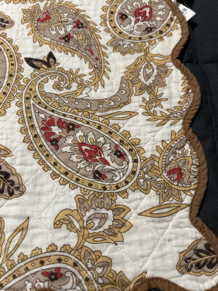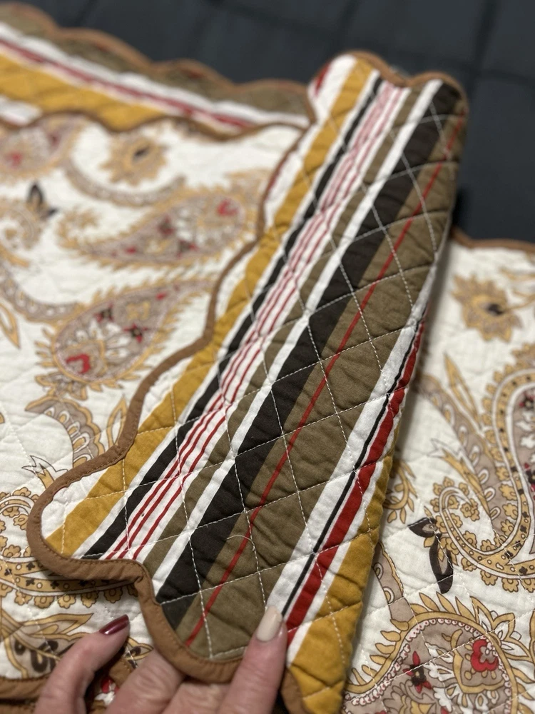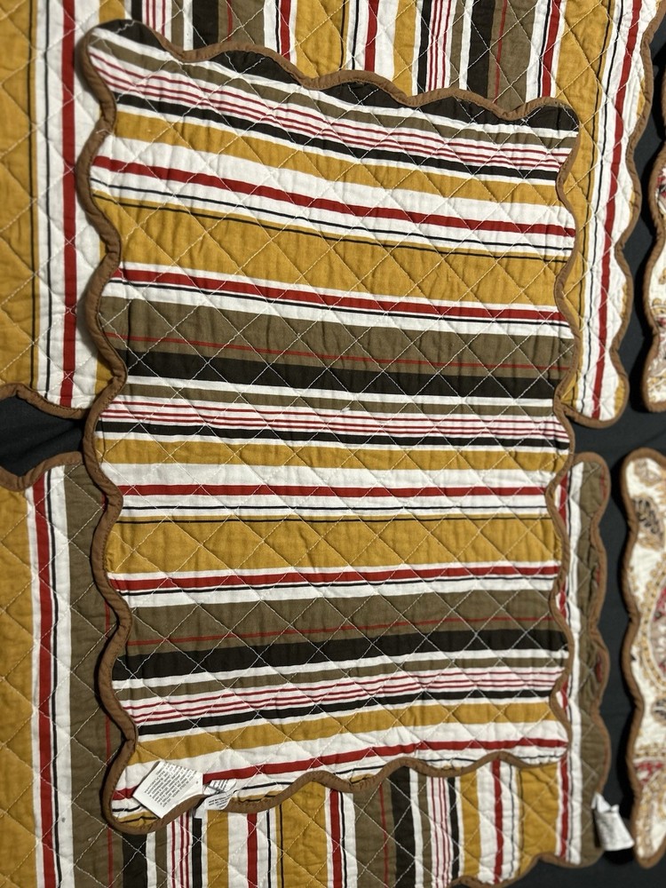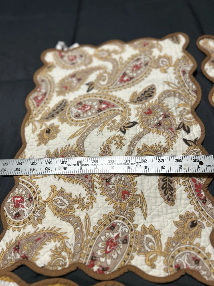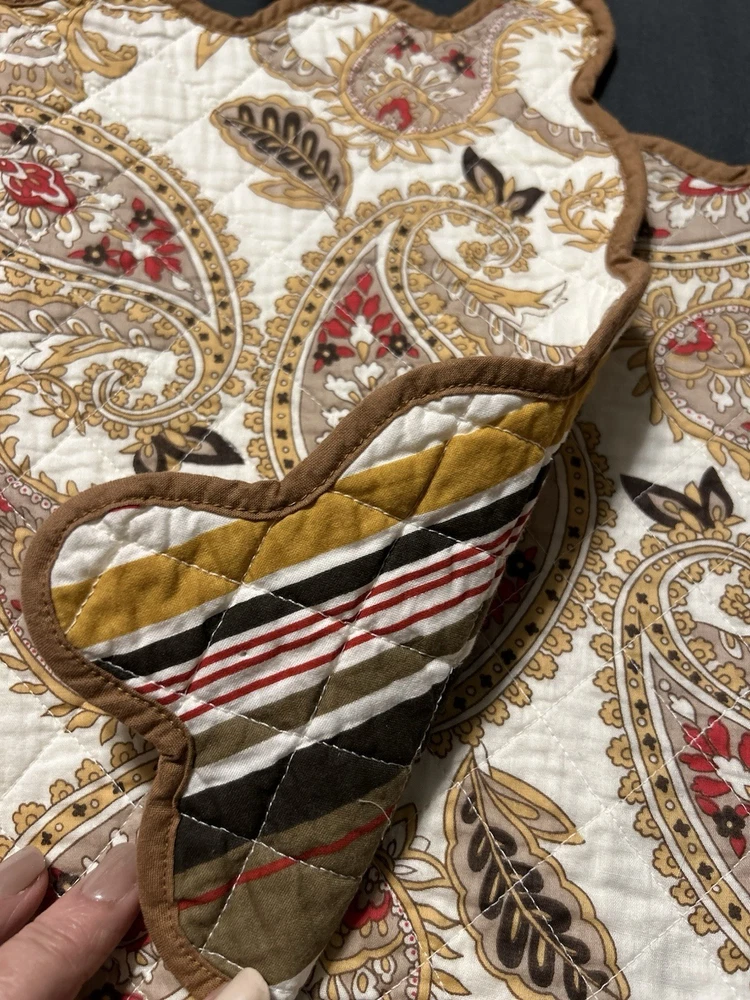 The Pier 1 Placemats Set adds a touch of bohemian fashion to your dining table with its multicolor paisley and striped design. Made from 100% cotton, this set of 5 rectangular placemats features tulip edges for a stylish finish. Perfect for multipurpose occasions, these placemats bring a touch of sophistication to your dining experience. See all the pics Beautiful pieces Discontinued Set/5