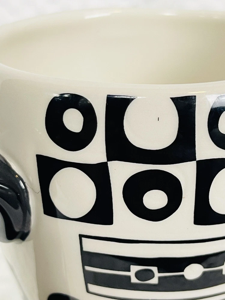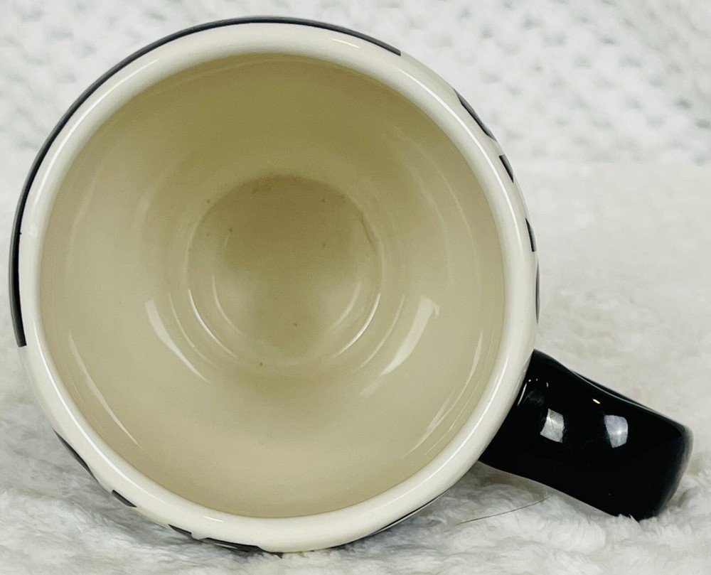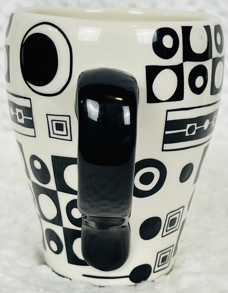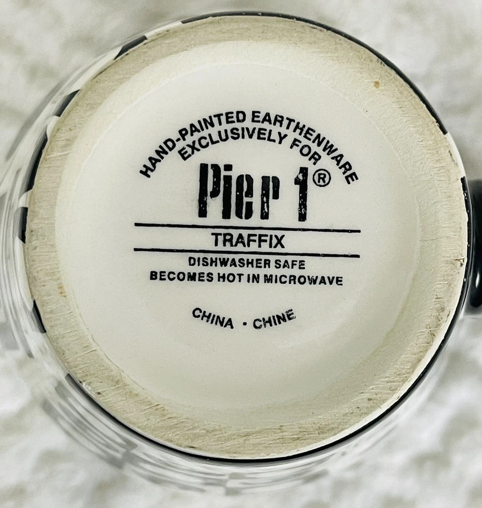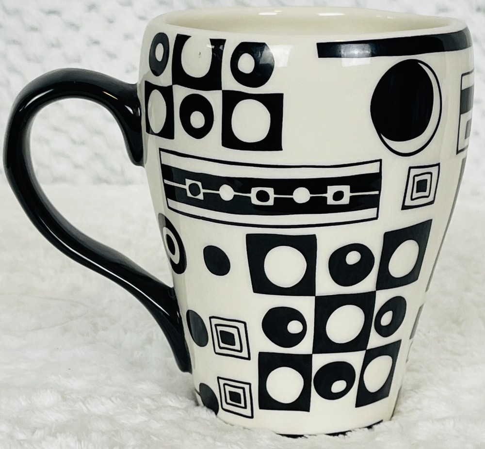 Pier 1 Porcelain Hand Painted Earthenware Black & White Art Design Coffee Mug This coffee mug from Pier 1 features a stunning abstract black and white art design that is hand painted on porcelain earthenware. It has a height of 5 inches and a weight of 13 ounces, making it a perfect addition to your collection of mugs. The mug is made in China and belongs to the Pier 1 franchise. This collectible item is not just a mug, it's a work of art that can be displayed as a part of your kitchen or home decor. Its unique design and material make it a perfect gift for any art or coffee lover. Two flaws shown in pictures.