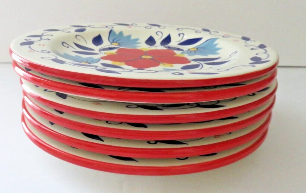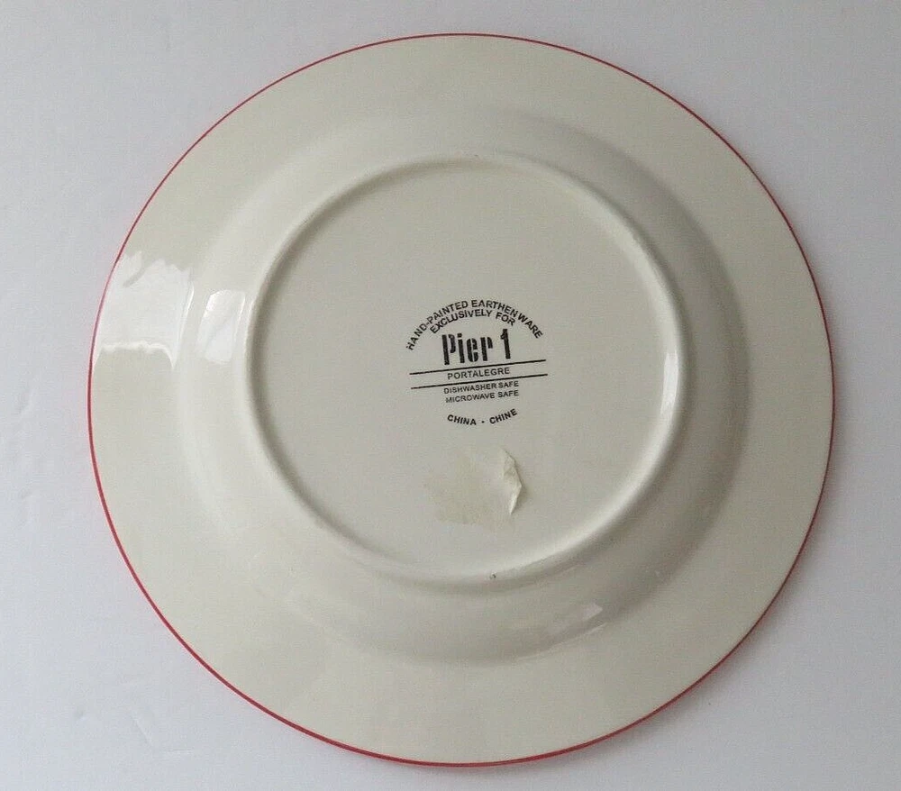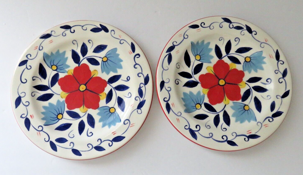 Pier 1 Portalegre Earthenware Salad Dessert Plate 8" Vintage Excellent like new condition. Clean. No damage. These are Pier 1's Portalegre dessert/salad plates. They are vintage from the 1990s, hand-painted with a leaf vine border, floral and orange trim. They are both microwave and dishwasher safe. Original sticker remnants on some plates. I have 6 to sell, in lots of 2 (3 lots). Price is per lot. Please view all photos as they are part of the description. Once purchased - will ship to you within 2 business days via USPS Ground Advantage Mail, careful packing will definitely be a priority. Non-Smoking home. Thank you for viewing this item. Check out my other treasures: https://www.ebay.com/str/musthavesbuyitnow . See some fun plushies that I have listed: https://www.ebay.com/usr/theplushieseller