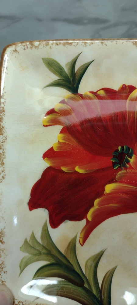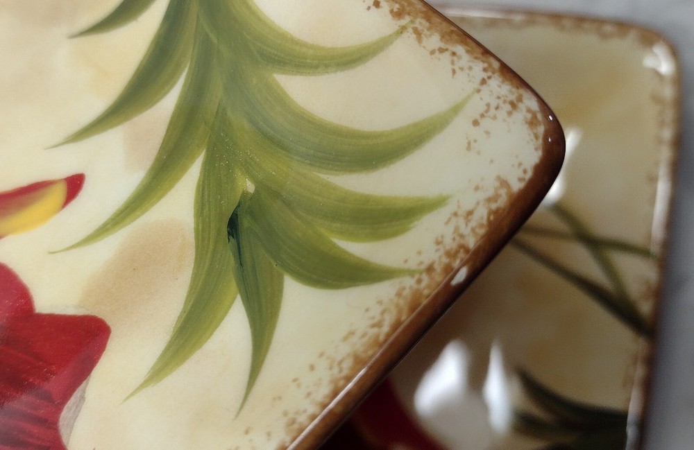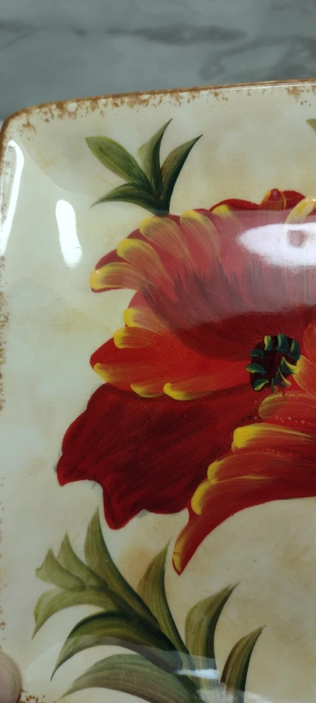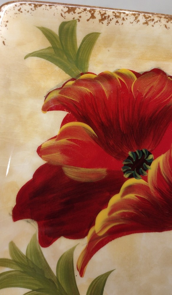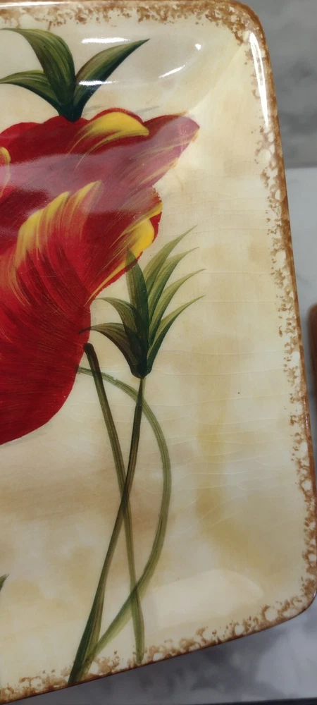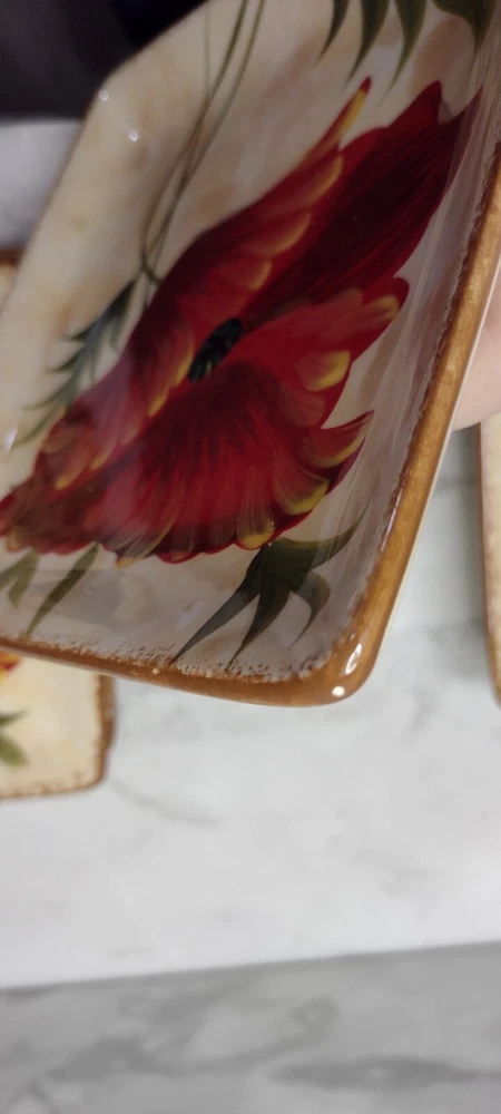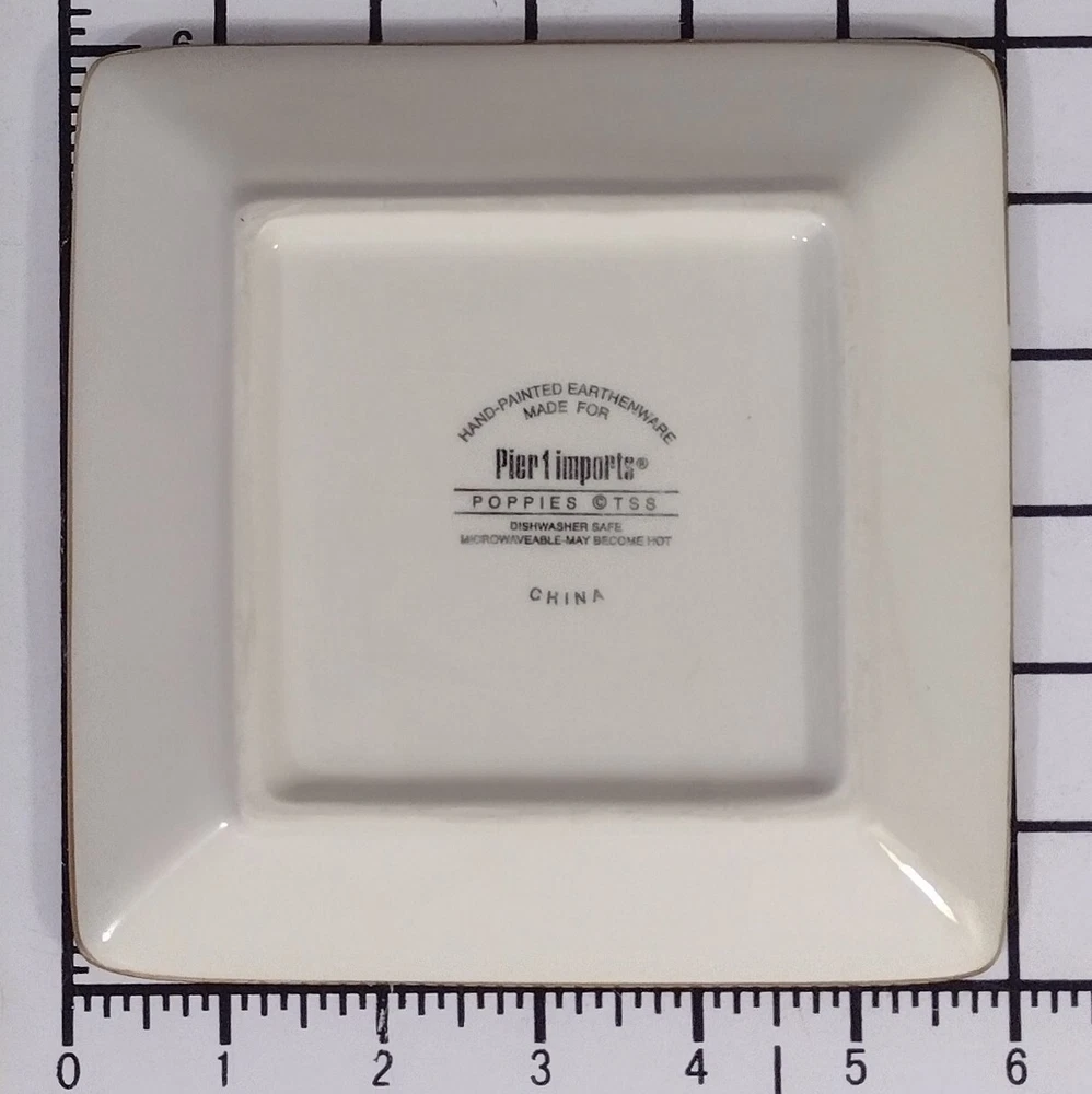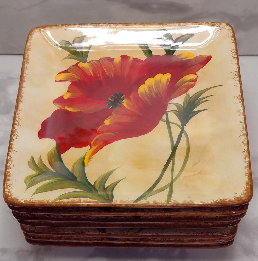 Pier 1 Red "Poppies" Appetizer Plates, Set of 7 Beautiful plates! Two have very tiny chips. They all have some light crazing. Please see photos for details. Size: 6" square I double box all my dish shipments and package them with the greatest care. To receive an upfront shipping discount, put all the items from my store in your cart before purchasing. If you decide to make more than one separate purchase with the "buy it now" option, I will calculate the shipping discount when I ship your items and refund any overpaid shipping. Thanks!