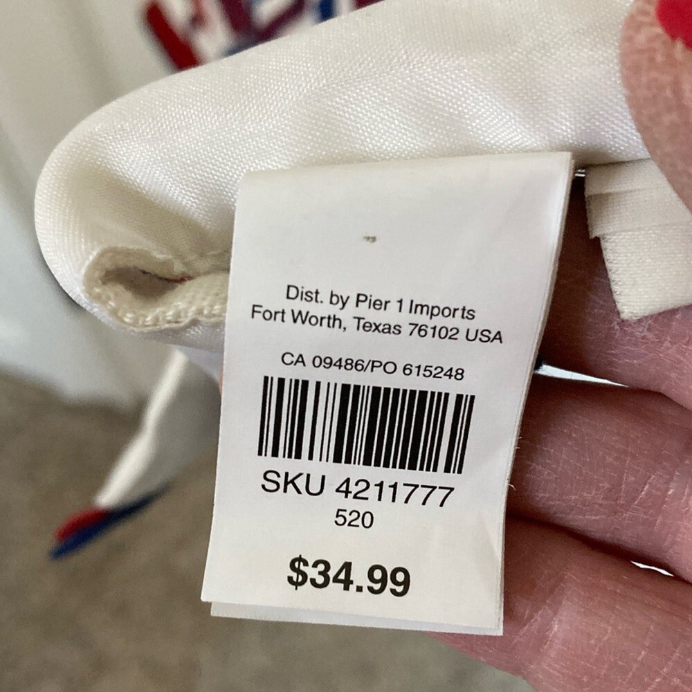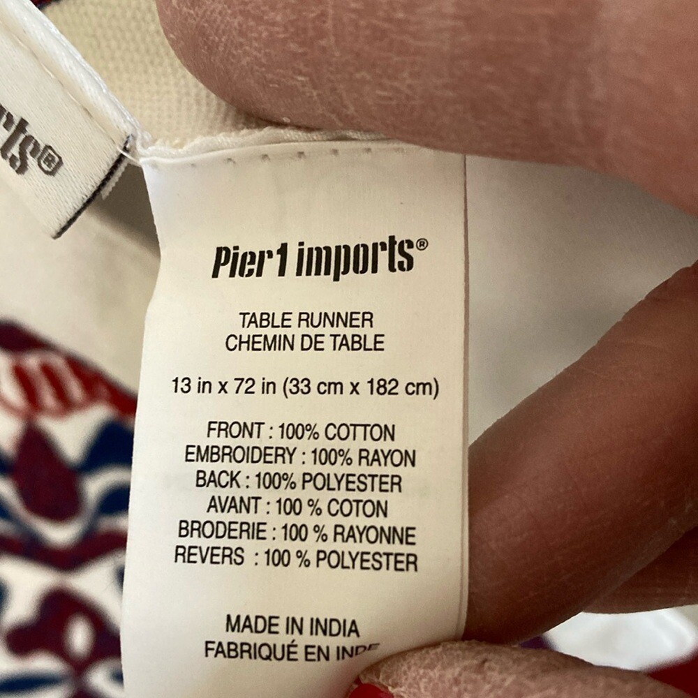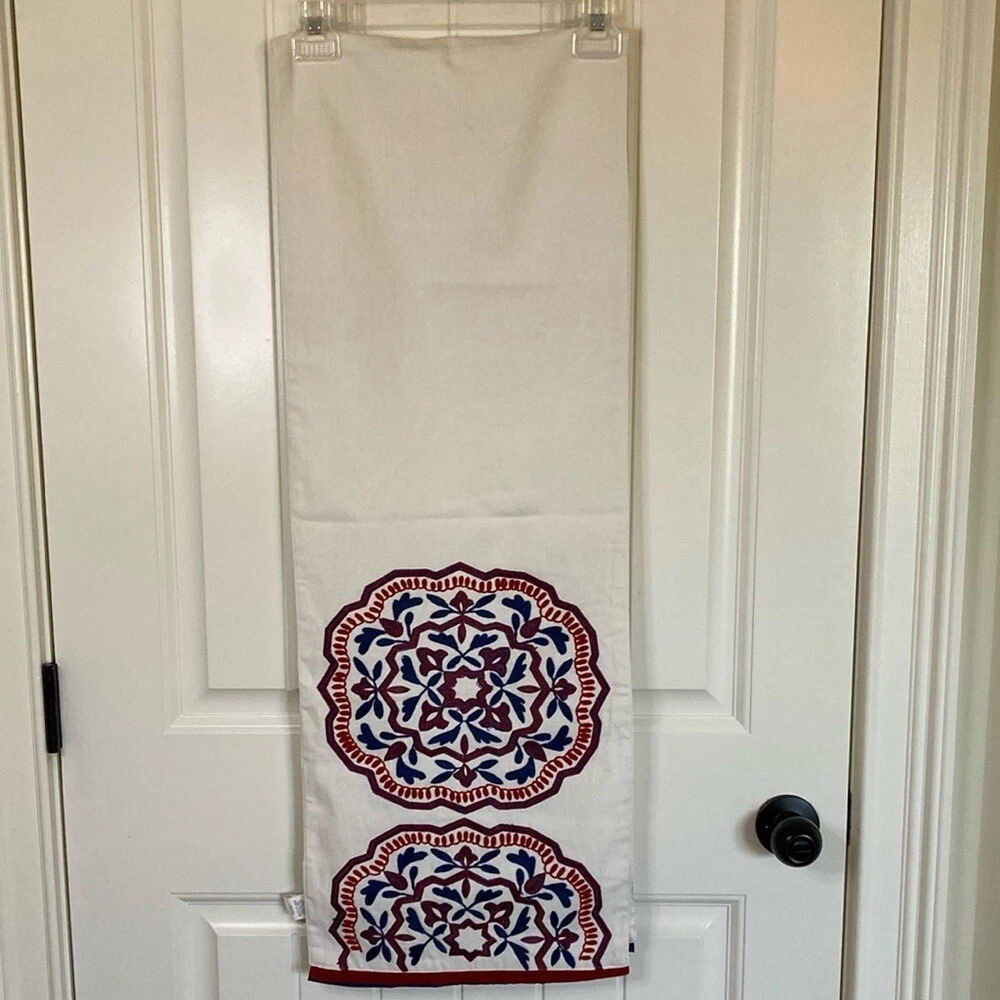 Pier 1 Red White Blue Patterened Embroidery Table Runner NWT Americana Nautical Cotton, Rayon, Polyester 13" x 72" Add a touch of elegance to your home with this Pier 1 throw. Featuring a striking red and blue pattern on both ends and solid in the middle, it's perfect for any living space. Never used, NWT Nice for summer, beach, July 4th, Americana or Nautical theme
