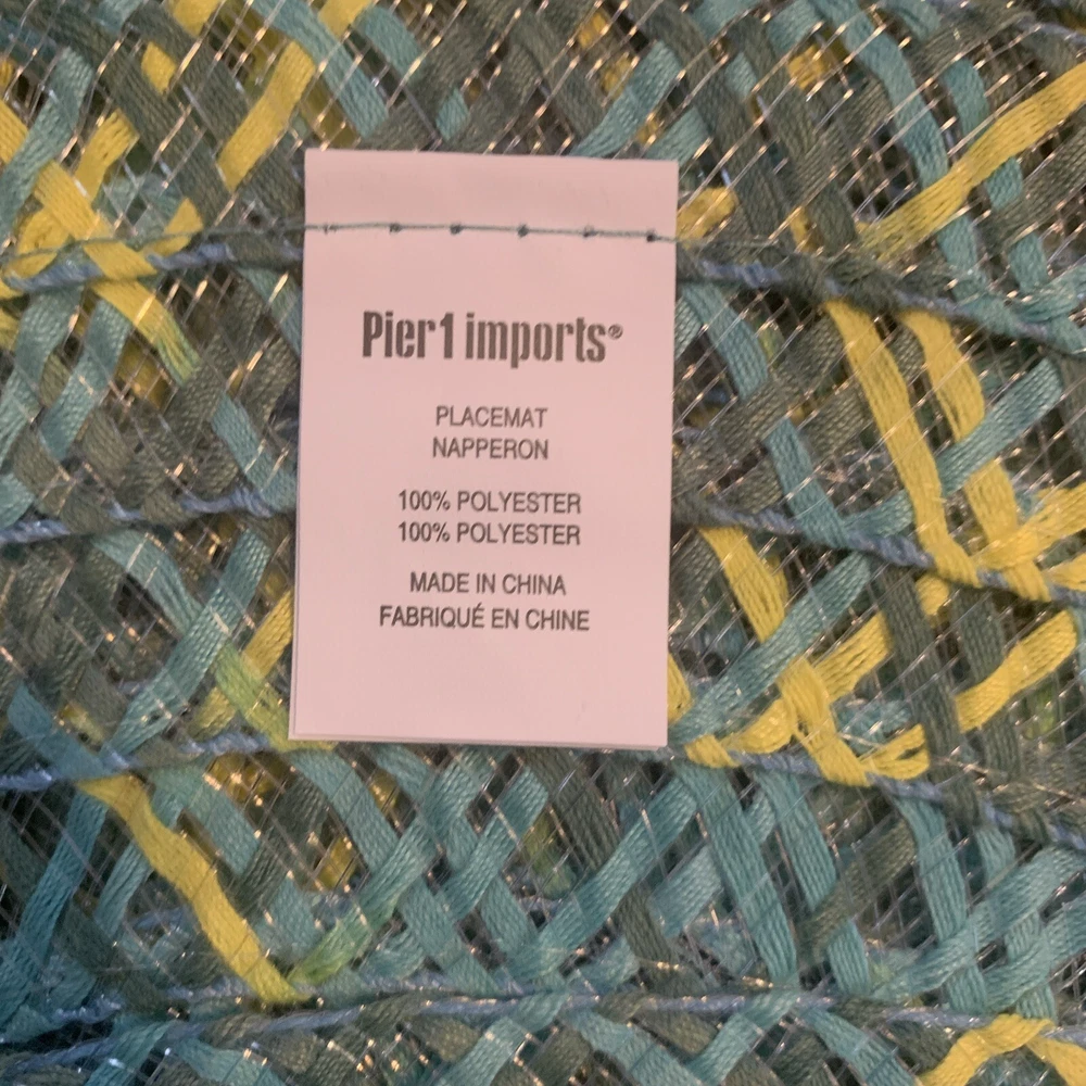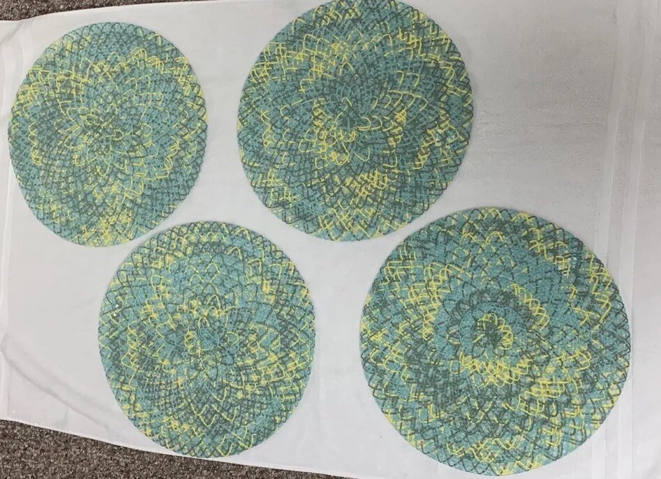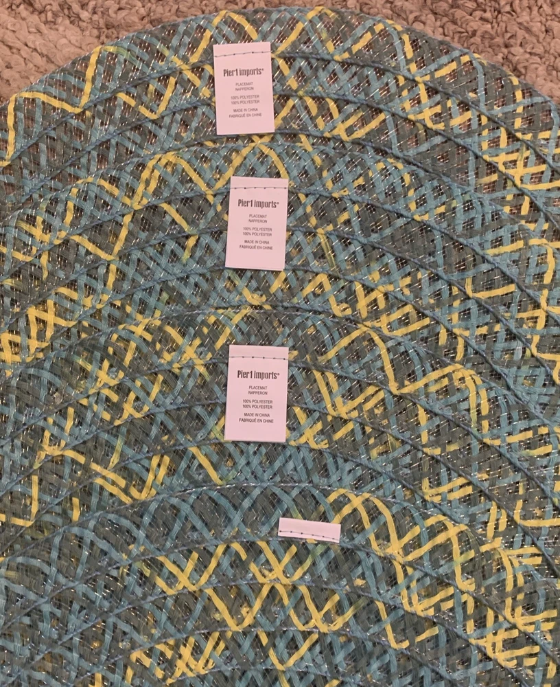 Preowned good condition. Pier 1 Imports Set of 4 beautiful multi colored Round placements. 100% polyester. Size approximately 14.75x15. Woven/weaved pattern. These are very lightweight see through mats. One of the mats does not have the white Pier 1 Imports tag but the other 3 do. See photos for condition Thank you