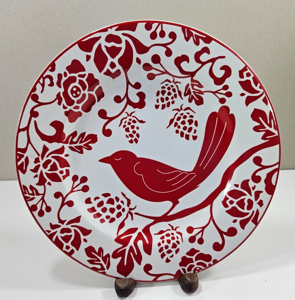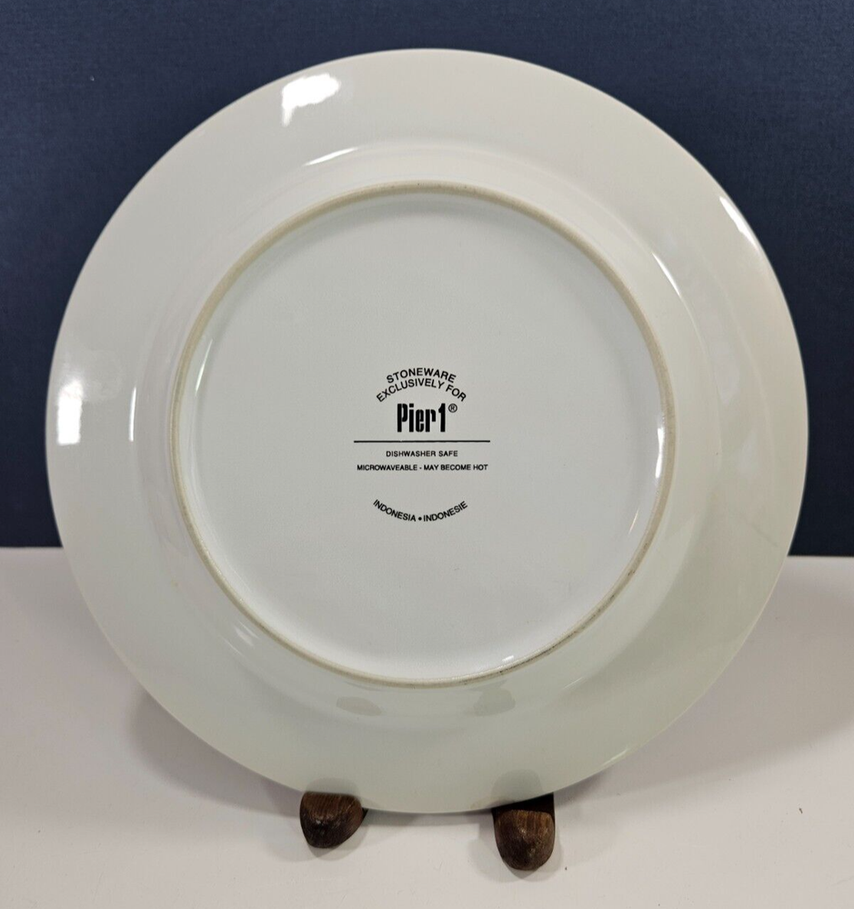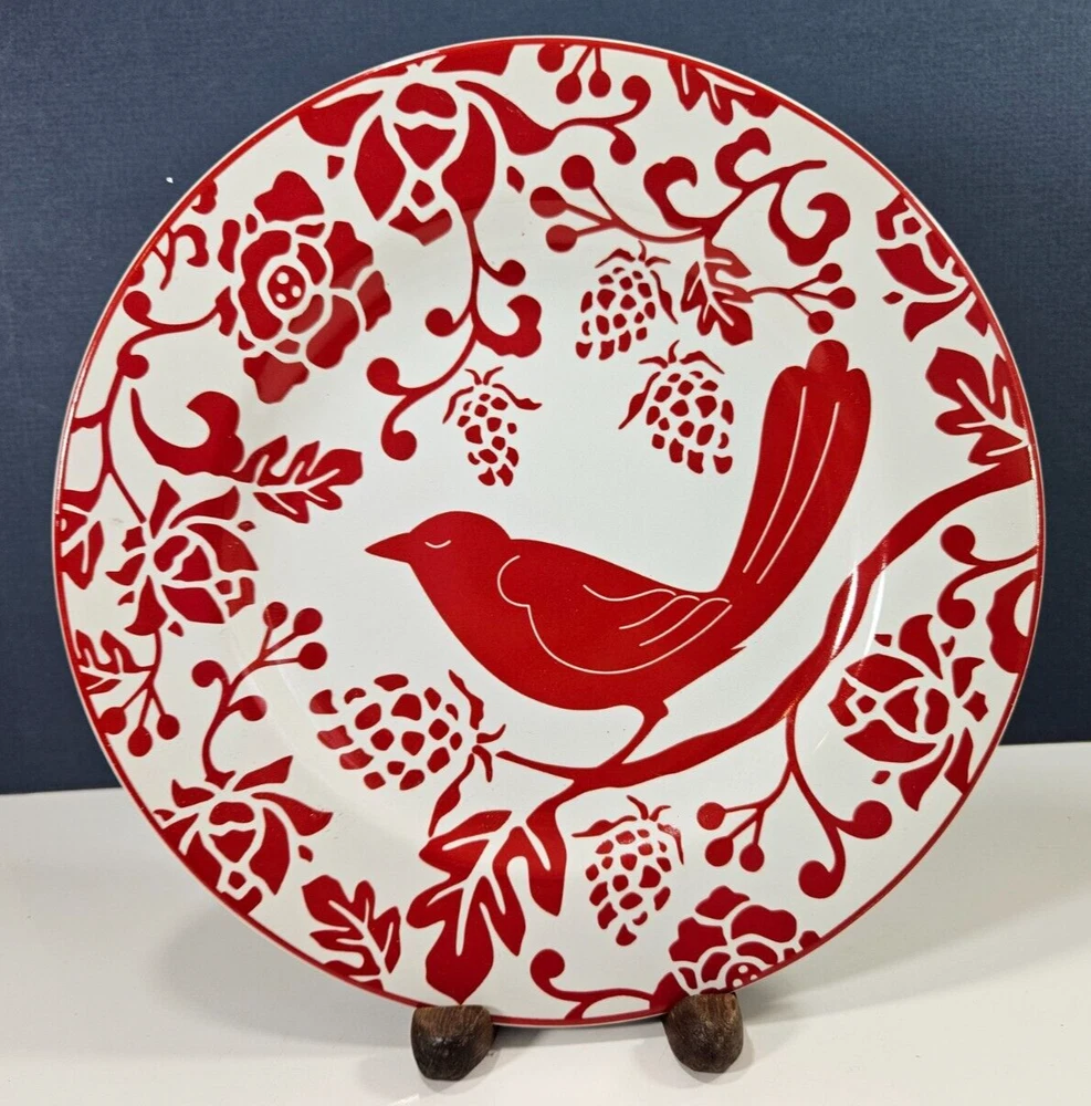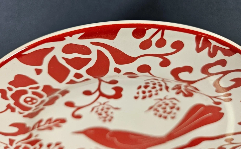 Add a touch of nature to your dining table with this charming Pier 1 dessert plate. The plate features a contemporary design with a red bird perched on a white branch surrounded by flowers and fruit. Crafted from glossy stoneware and printed with a backstamp, this plate is both microwave and dishwasher safe for your convenience. Perfect for all occasions, this dessert plate is ideal for serving sweet treats or fresh fruits. It measures 8.125" in diameter and comes from Indonesia. This contemporary original dessert plate is a must-have for any bird or nature lover and will make a lovely addition to your dinnerware collection.