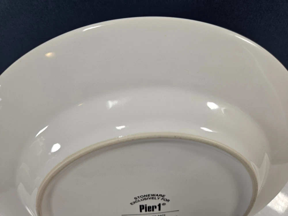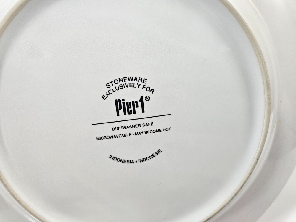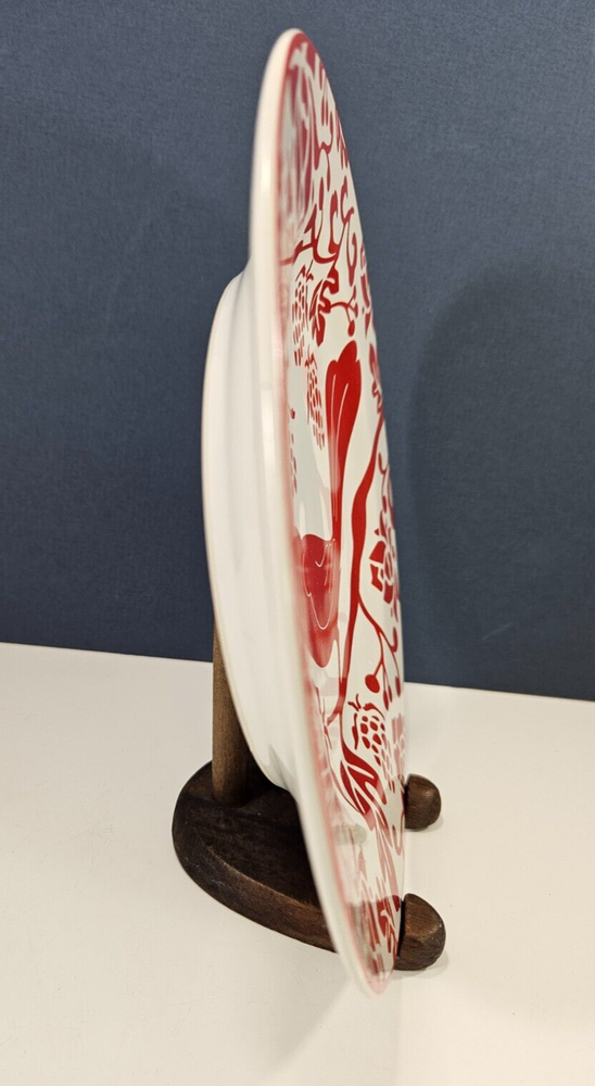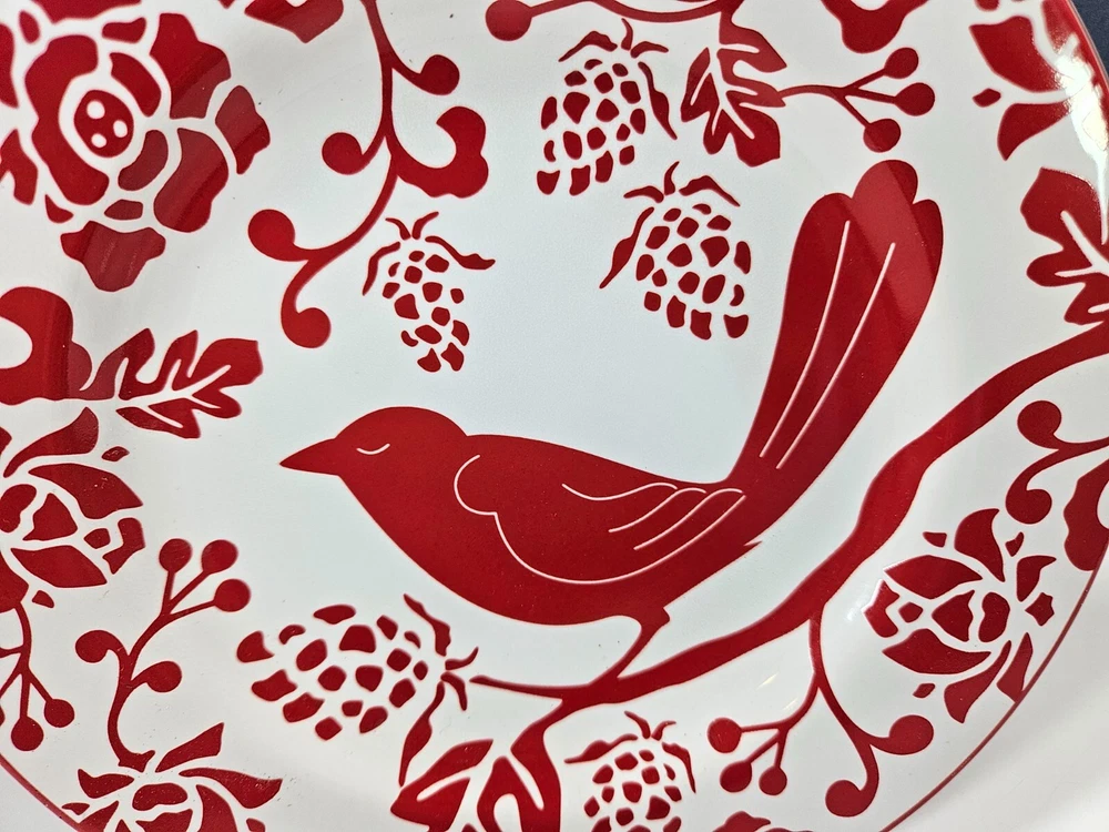Add a touch of nature to your dining table with this charming Pier 1 dessert plate. The plate features a contemporary design with a red bird perched on a white branch surrounded by flowers and fruit. Crafted from glossy stoneware and printed with a backstamp, this plate is both microwave and dishwasher safe for your convenience. Perfect for all occasions, this dessert plate is ideal for serving sweet treats or fresh fruits. It measures 8.125" in diameter and comes from Indonesia. This contemporary original dessert plate is a must-have for any bird or nature lover and will make a lovely addition to your dinnerware collection.