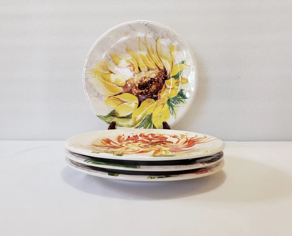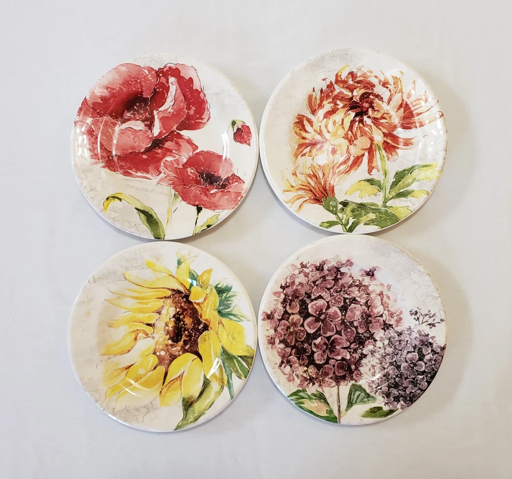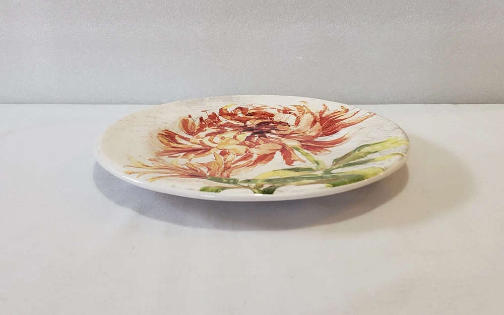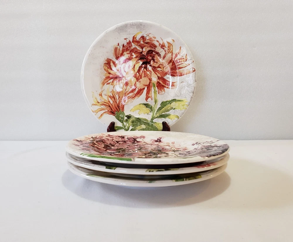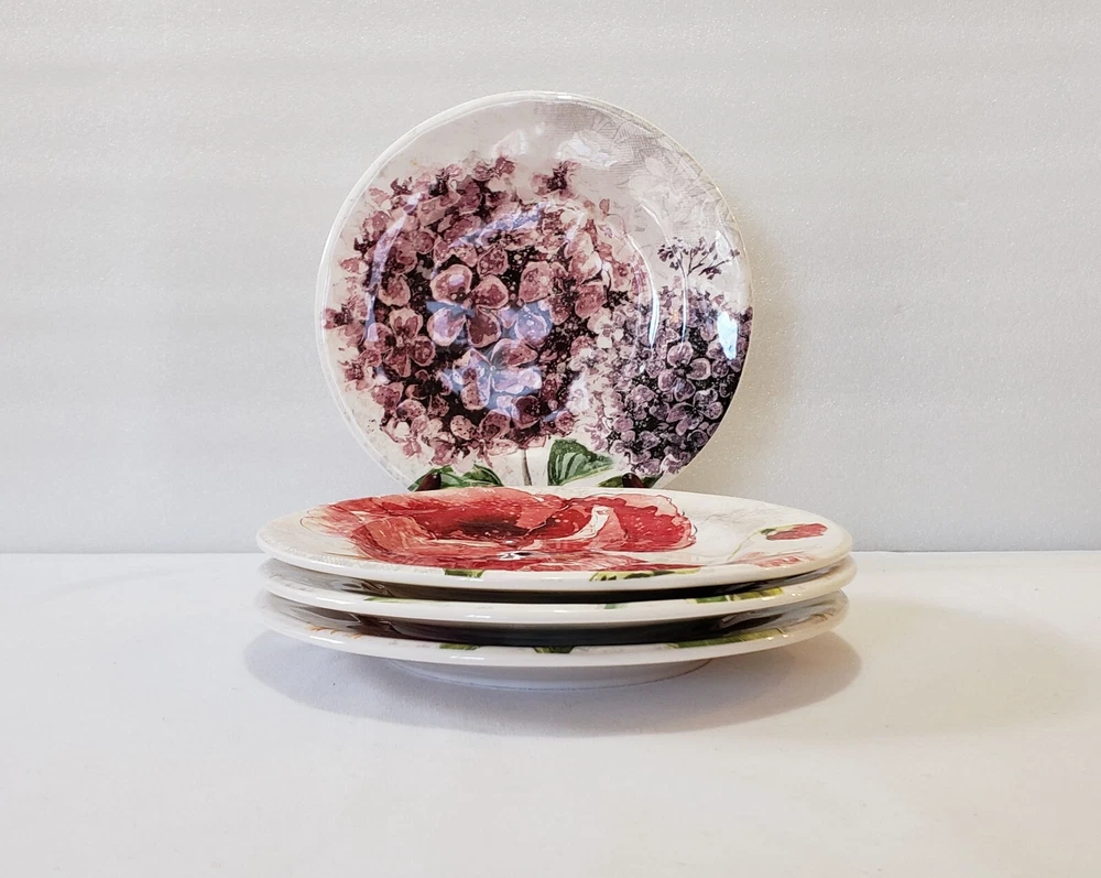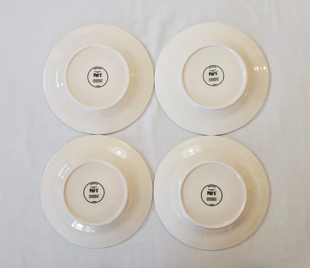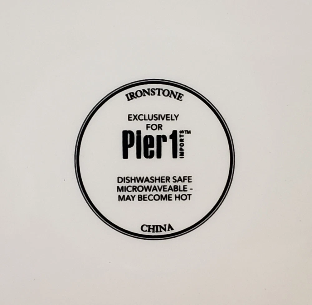 4 Pier 1 Imports Salad Dessert Plates - Floral Ironstone Exclusive For your consideration are four Pier 1 Imports salad or dessert plates. The plates are made of Ironstone and made exclusively for Pier 1 Imports. Each plate portrays a different flower. Gorgeous plates! The bottoms are marked Ironstone Made Exclusively For Pier 1 Imports. The salad plates are 8 7/8" in diameter. The condition is very good with light utensil wear and light wear on the bottoms. There are no chips or cracks. Check out my other interesting and unique items! My eBay Store name is tradewinds247 https://stores.ebay.com/tradewinds247 Thanks for Looking and Good Luck Bidding! Sign up for my email newsletters add my eBay Store to your Favorites https://stores.ebay.com/tradewinds247