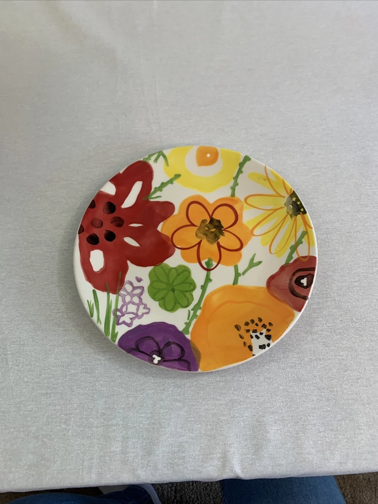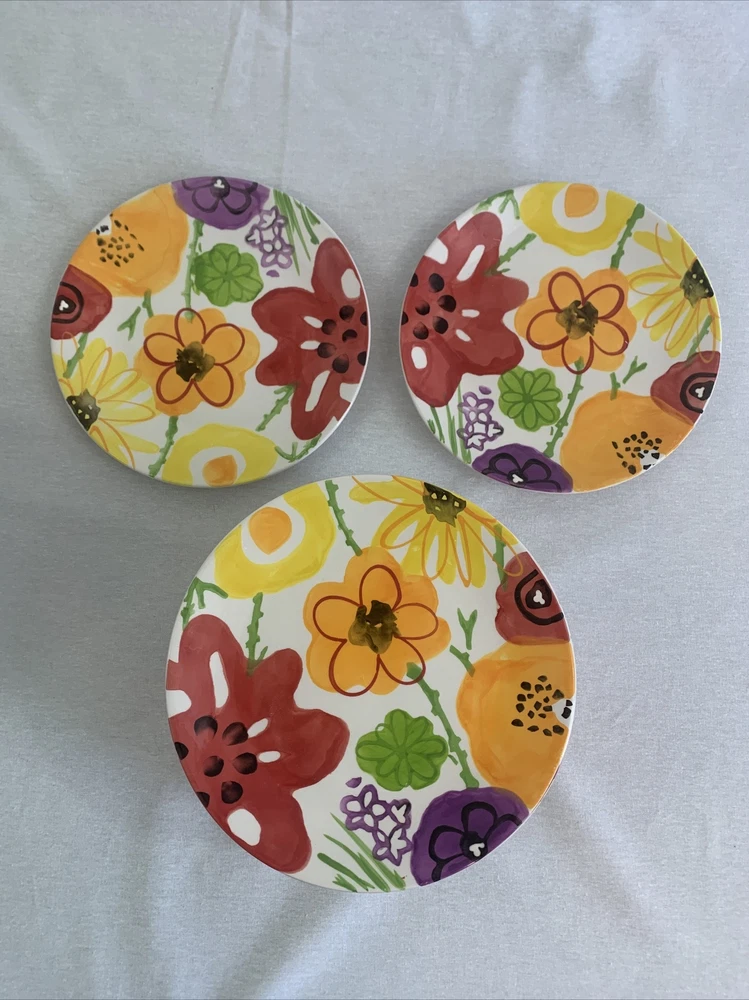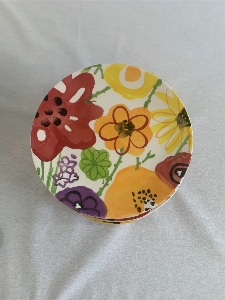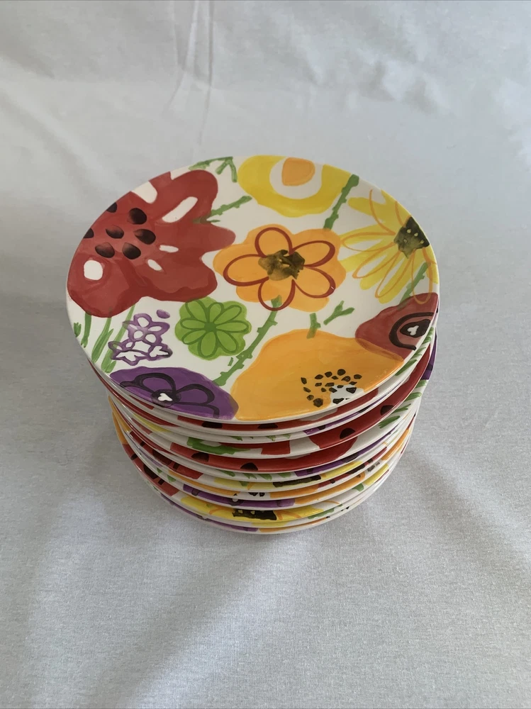 Add a touch of elegance to your dining table with this set of 12 Pier 1 Garden Floral Collection accent dessert/salad plates. These round plates measure 8.5 inches in length and feature a beautiful multicolor floral pattern that's perfect for any occasion. Made of lead-free glazed stoneware, these plates are durable and easy to clean. The set includes salad/dessert plates and is ideal for adults. The backstamp is printed, and the plates were manufactured in China. The Pier 1 brand is known for its quality products, and these plates are no exception. Bring some flower-themed charm to your dining table with this set.