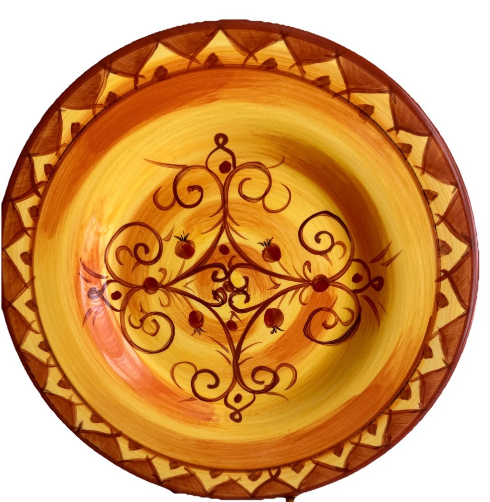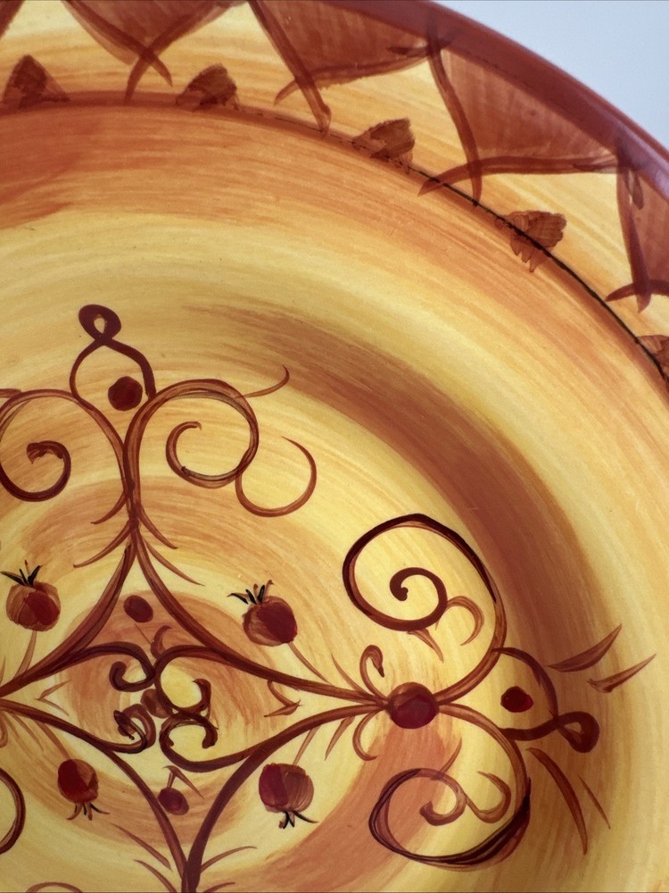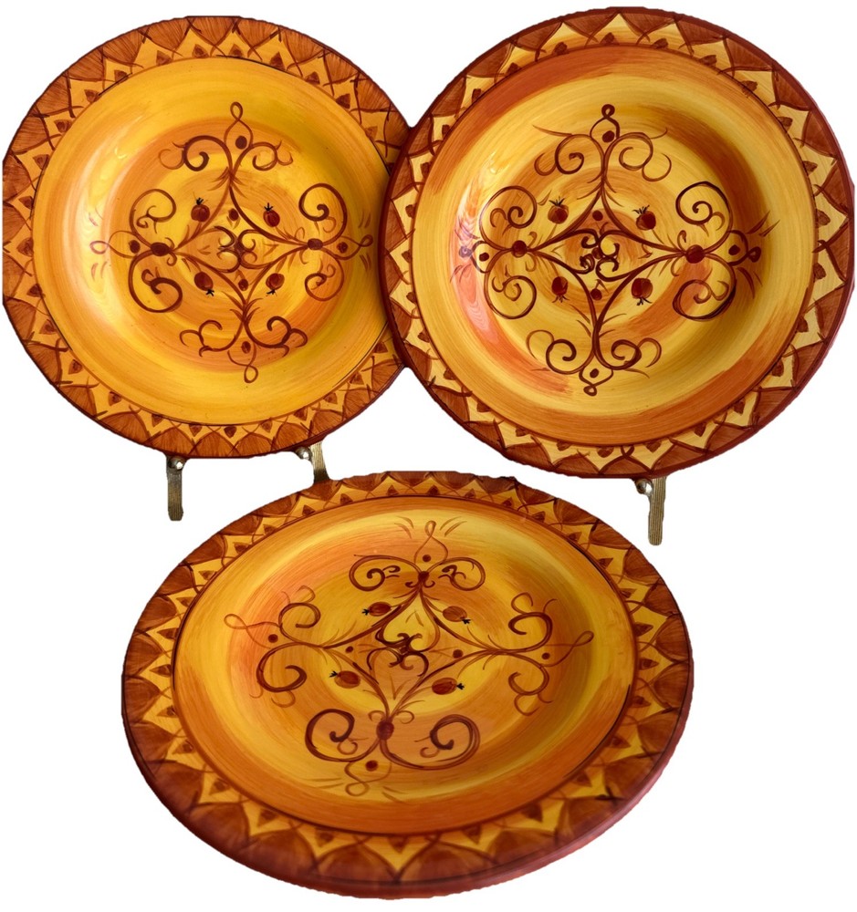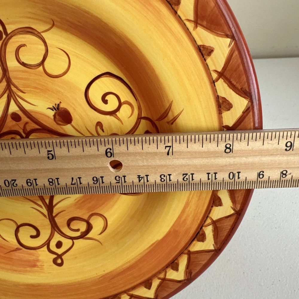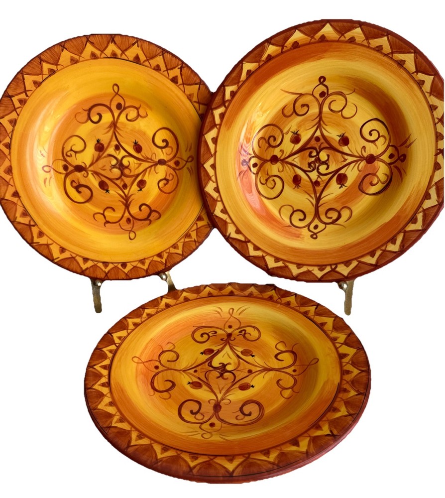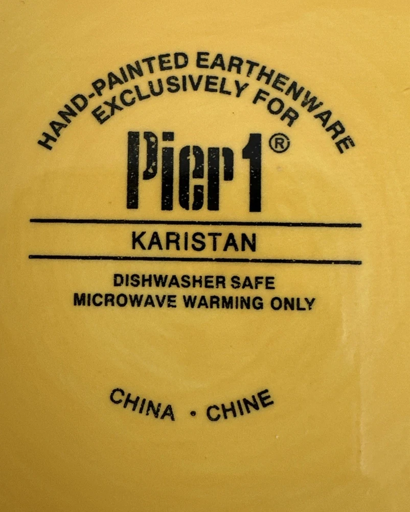 Elevate your dining experience with this set of three Pier 1 Imports dessert and salad plates, each measuring 8 1/2 inches. The Karistan pattern boasts a vibrant mix of orange, brown, and yellow hues, adding a splash of color to any table setting. These plates are crafted from high-quality earthenware, ensuring both durability and a touch of elegance. Designed with both form and function in mind, these plates feature a glossy finish that's both hand-painted and dishwasher-safe. They are also microwave safe, allowing for easy reheating. Whether for everyday use or special occasions, this eclectic set will complement your meals and impress your guests.