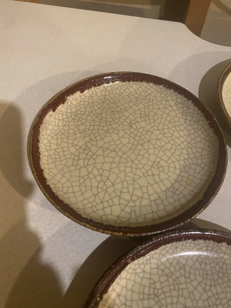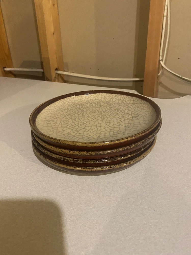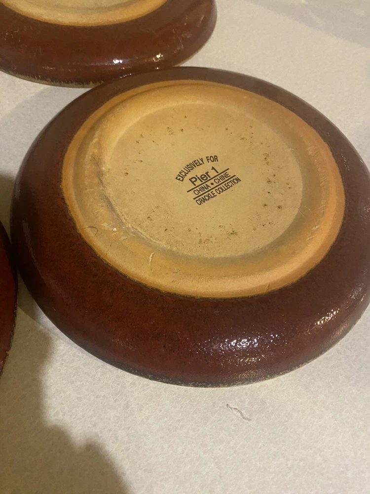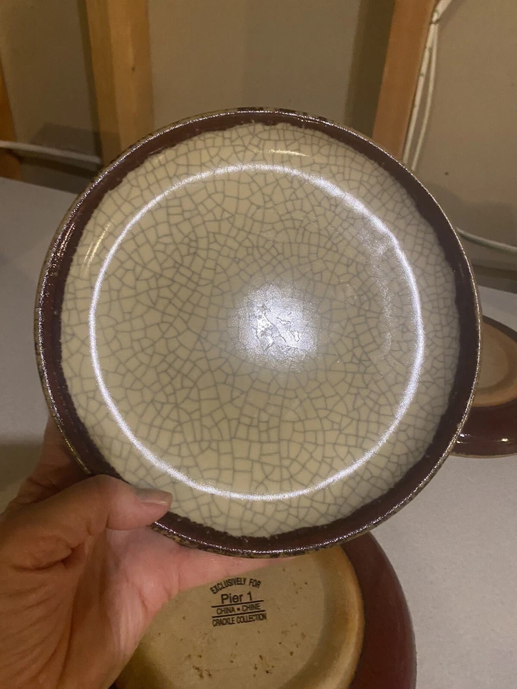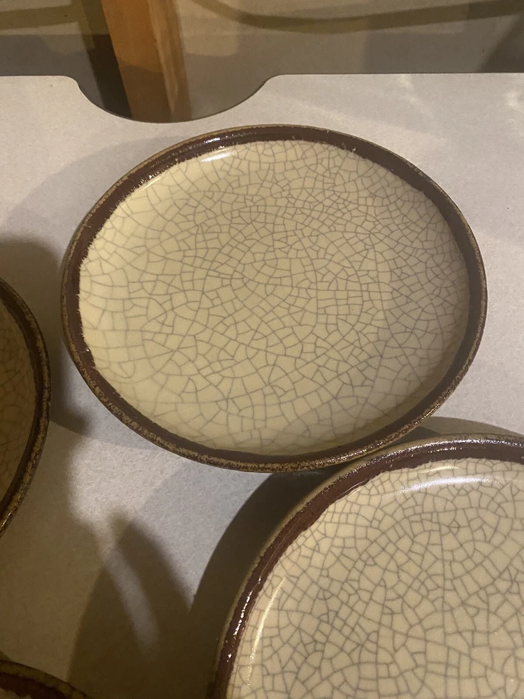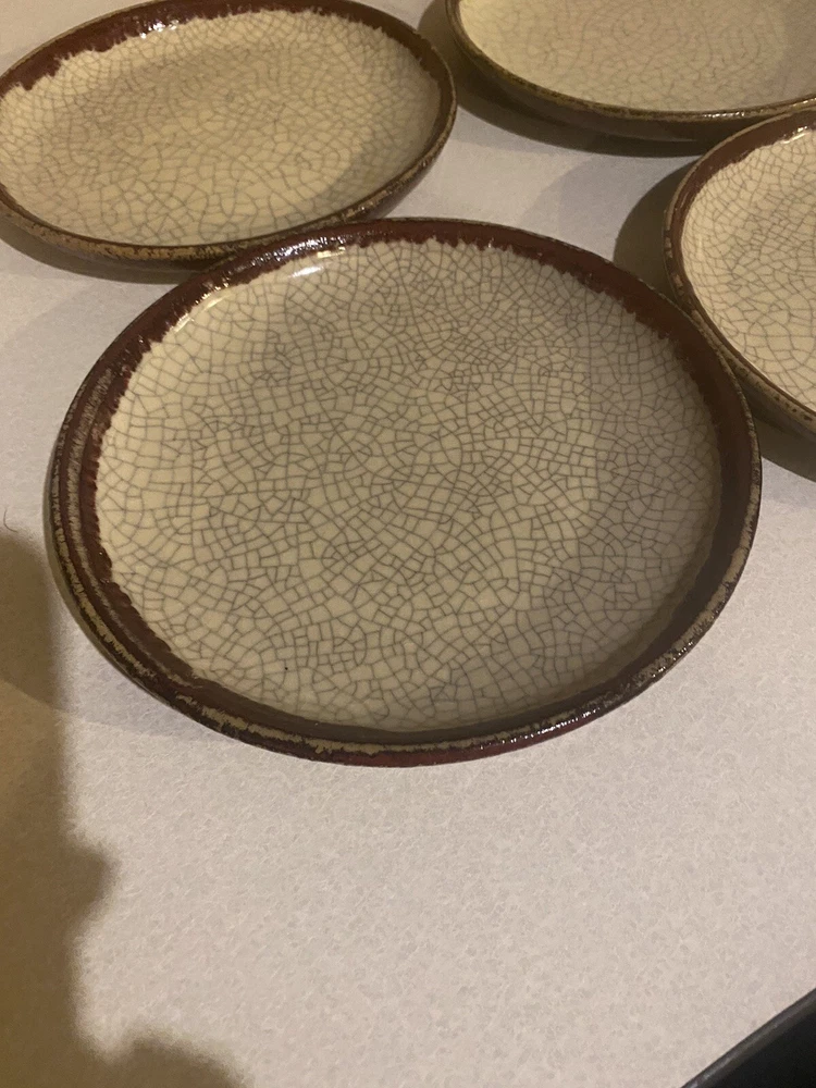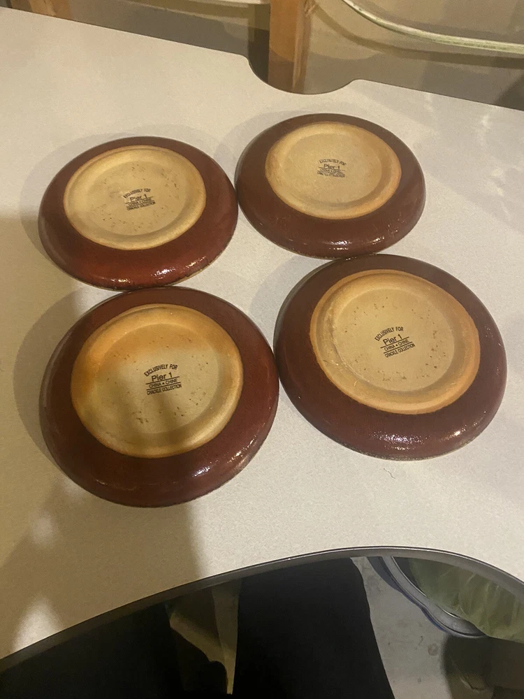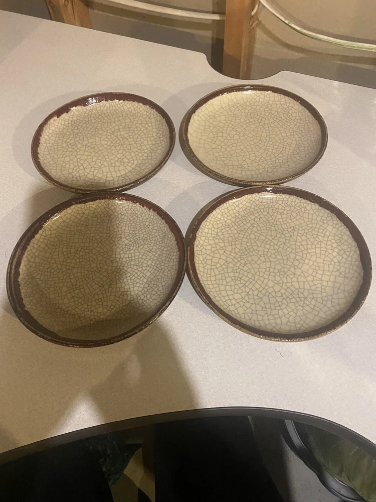 Add a touch of rustic charm to your dinner table with this four-piece round plate set from Pier 1's Crackle Collection. The plates feature a beautiful crackle pattern in beige and brown, adding a vintage feel to any occasion. Made of high-quality stoneware and measuring 9.5 inches in diameter, these dinner plates are perfect for serving your favorite meals with a touch of sophistication. The Pier 1 Crackle Collection plate set is ideal for food and drink-themed occasions, and their art pottery production style and technique make them a unique addition to any dinnerware collection. The printed backstamp and vintage production style add to the charm of these plates. This dinner plate set is perfect for adults and can be used for all occasions. No chips or cracks. Solid heavy plates.