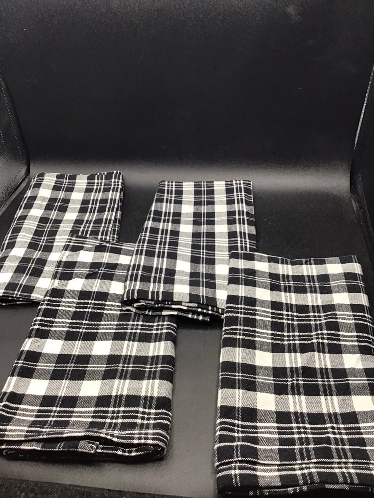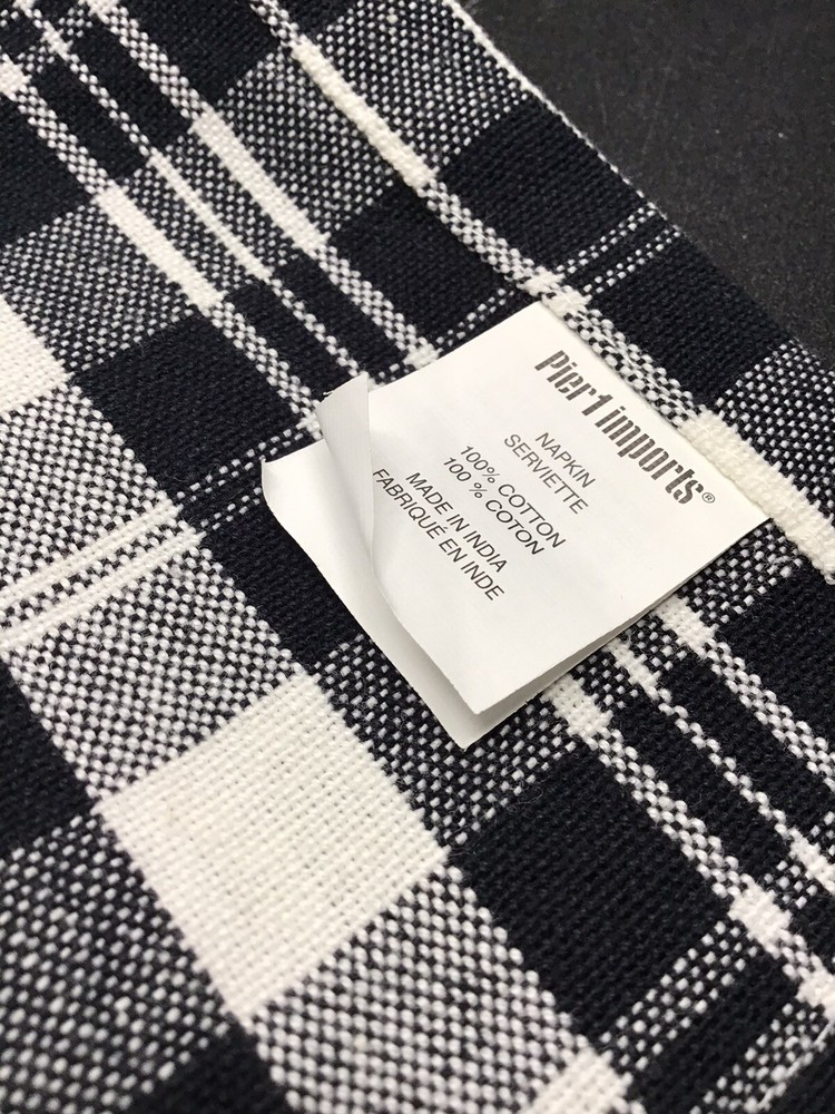 Add a touch of sophistication to your dining table with this set of 4 Pier 1 plaid cloth napkins. The black and white plaid pattern is perfect for any occasion, while the square shape and 100% cotton material ensure durability and comfort. These napkins are ideal for multipurpose use, whether you're hosting a dinner party or simply enjoying a casual meal with your family. The brand Pier 1 is synonymous with quality and style, making these napkins a must-have addition to your table setting. Each measures 20” x 20” I’m not sure these were ever used Please see pictures and ask any questions