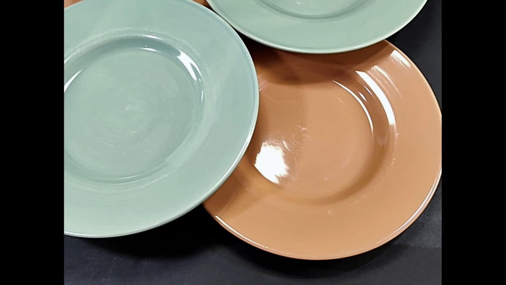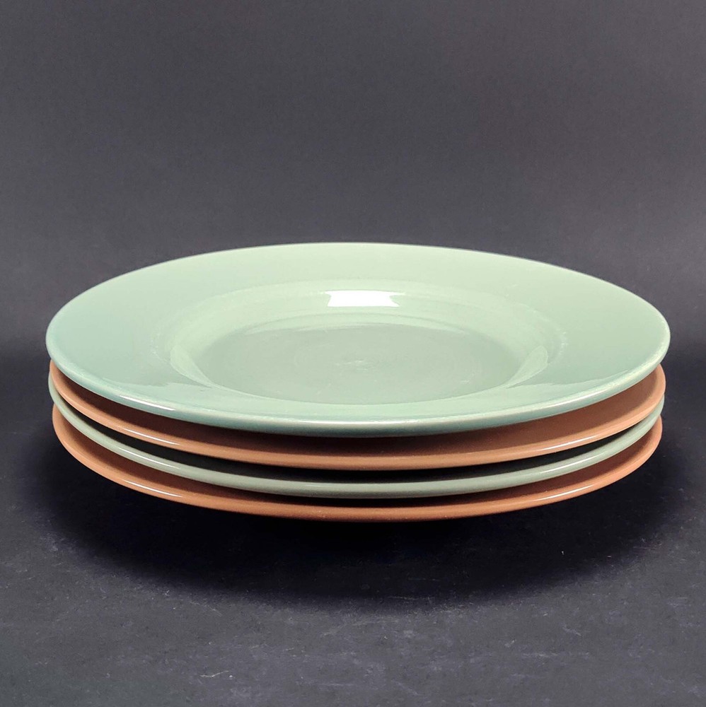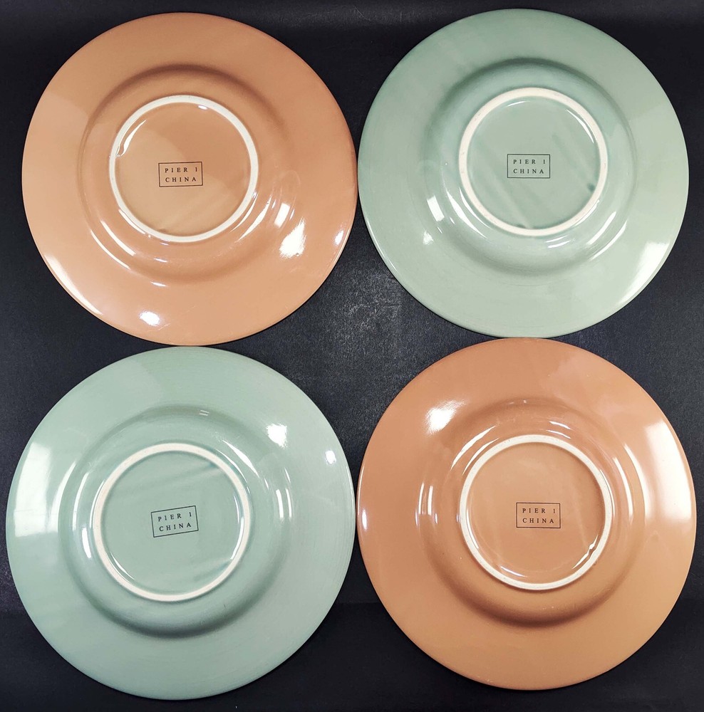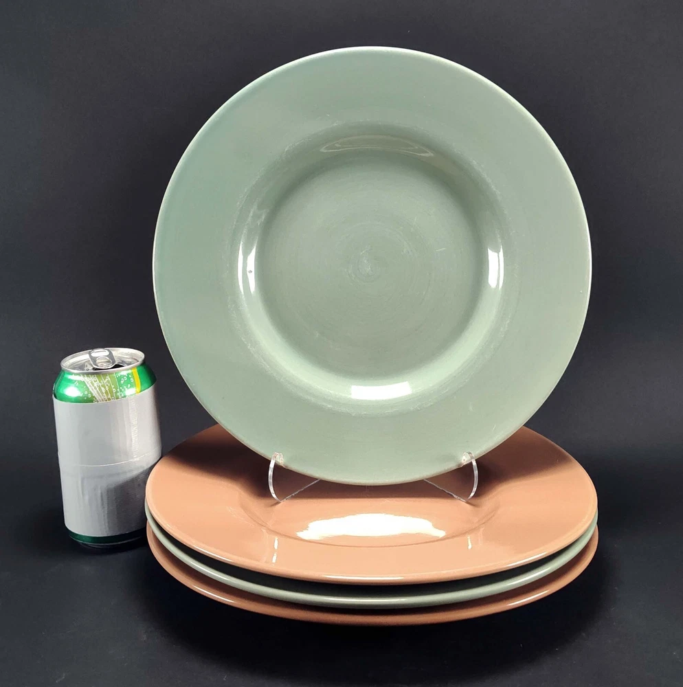 Pier 1 Solid Color Dinner Plates Earthy Sage Green and Coral Brown Desert Chic 11" Set of 4 There is some surface scratching but no chips, cracks, or crazing. Each measures approximately 11" wide. See my store for more vintage, antique, and discontinued dinnerware!! Please note, pre-owned items may have some visible imperfections such as minor scratches, trim wear, light staining, or crazing due to normal use and age.