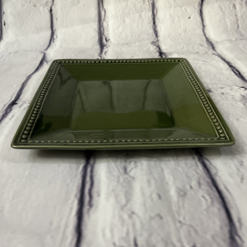 This is a Pier 1 Imports Salad Plate from the Spice Route Clove collection. It is a square-shaped plate with a green color and beaded design. The plate is made of stoneware, has a diameter of 8 inches, and is suitable for all occasions. The backstamp is printed on the plate, which is made in China.