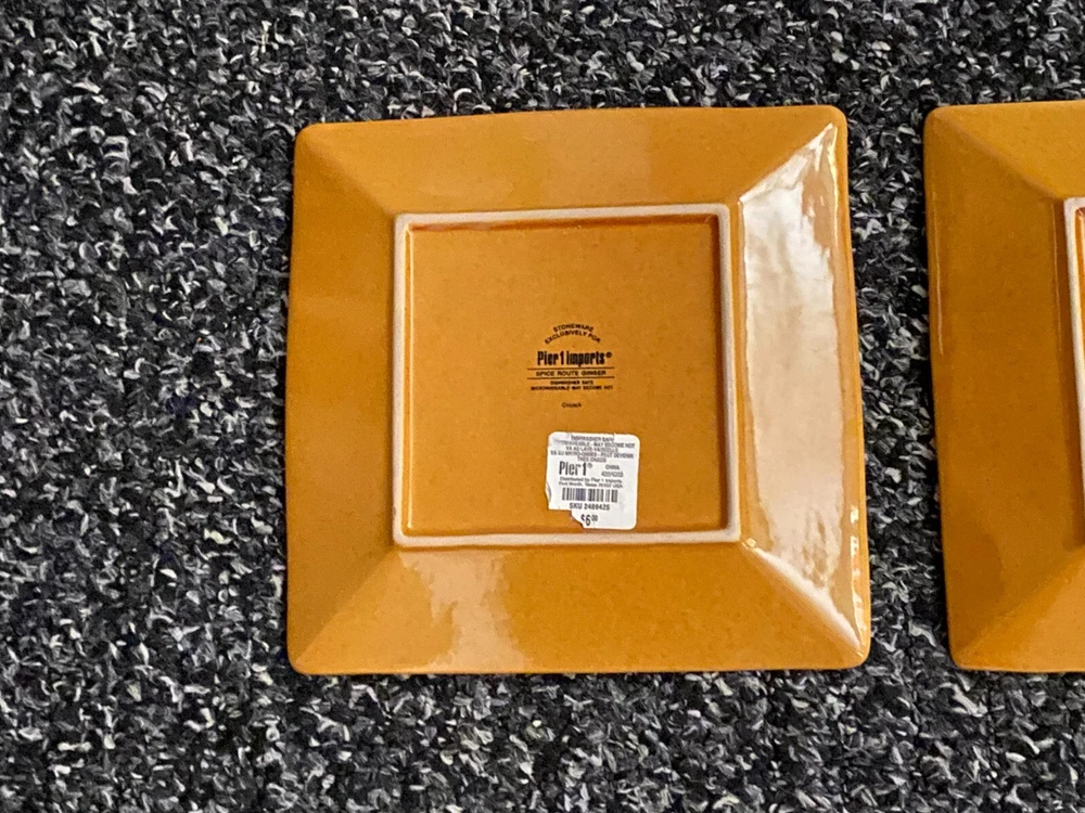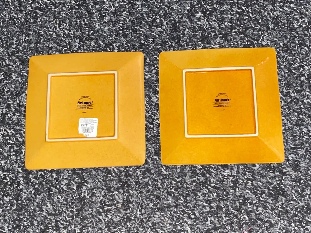 Set of 2 Pier 1 Imports Spice Route Ginger square salad plates Brand NEW-one has tags Beaded edge Discontinued in 2018 8 1/4" edge to edge, 11 1/2" corner to corner Beautiful design and color- See photos as part of description I have 2 sets of two available, if you buy both shipping will auto adjust If you have any questions about this item, please reach out