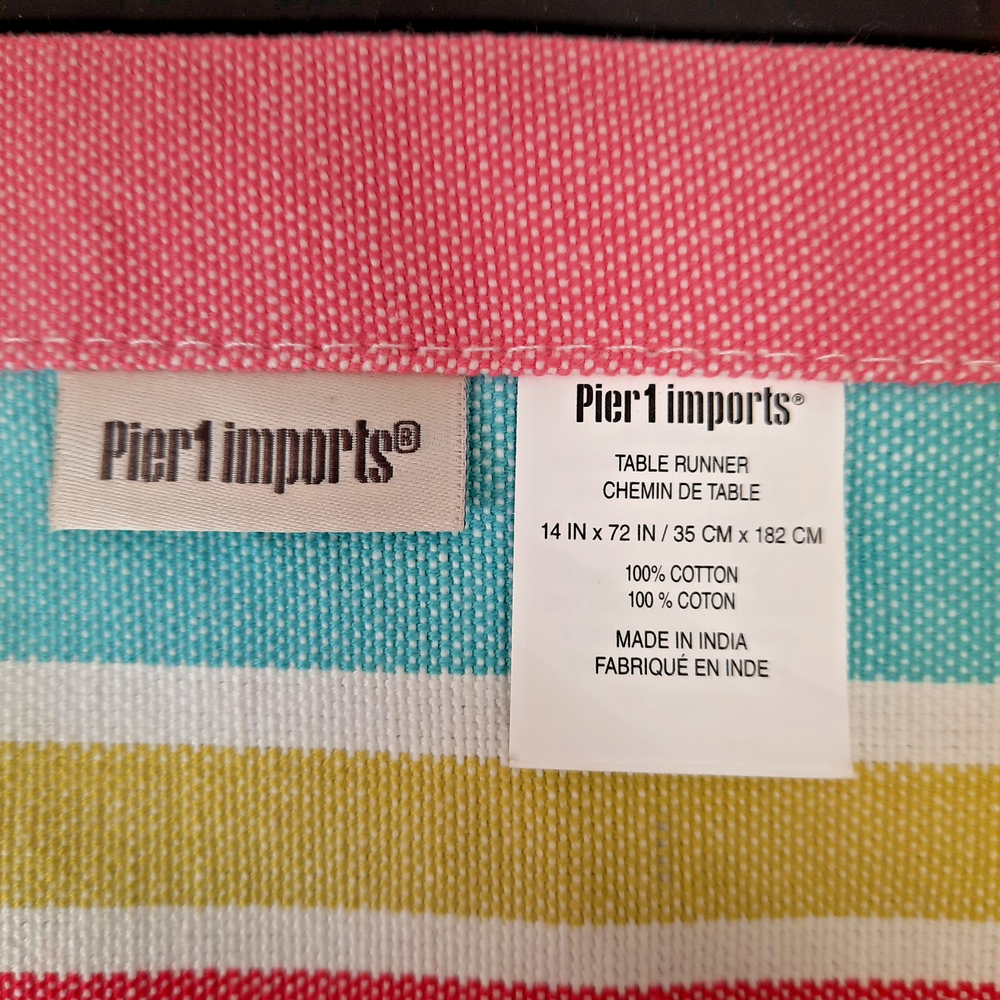Good condition. 100% cotton, multi-color stripes, perfect for a summer table. Measures approximately 76 inches long with the fringe, and approx. 14 1/2 inches wide. Machine wash cold....