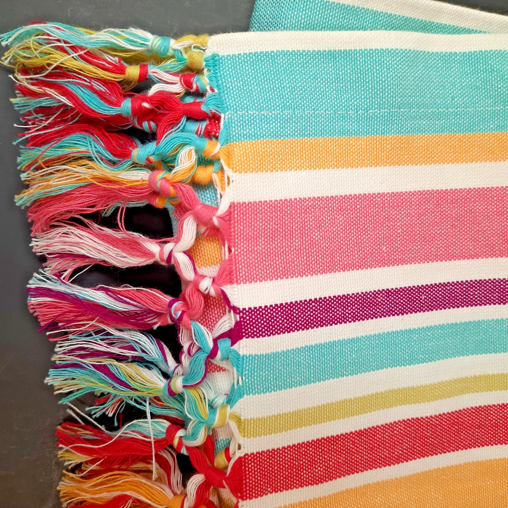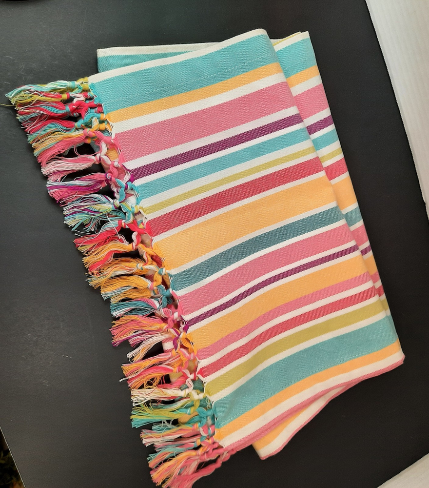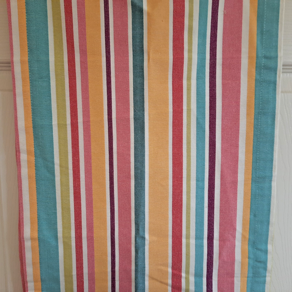 Good condition. 100% cotton, multi-color stripes, perfect for a summer table. Measures approximately 76 inches long with the fringe, and approx. 14 1/2 inches wide. Machine wash cold.