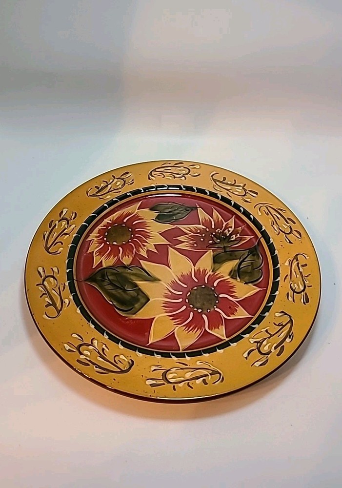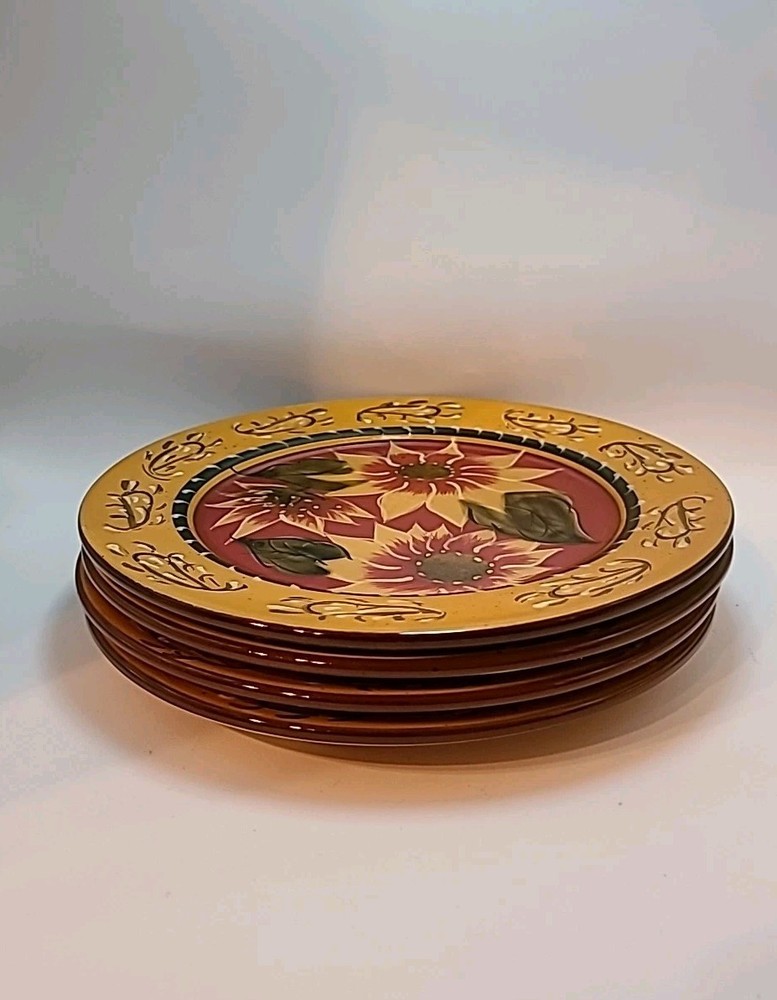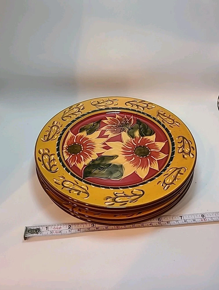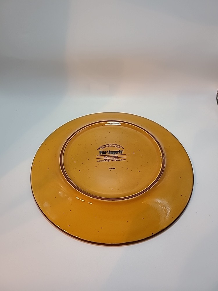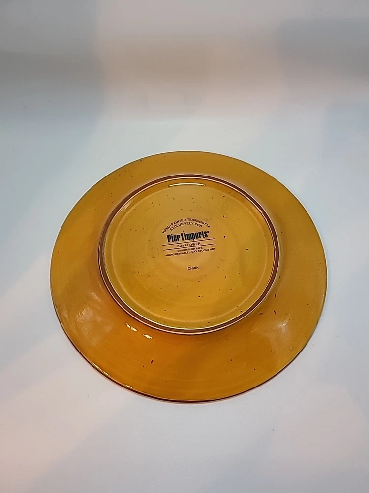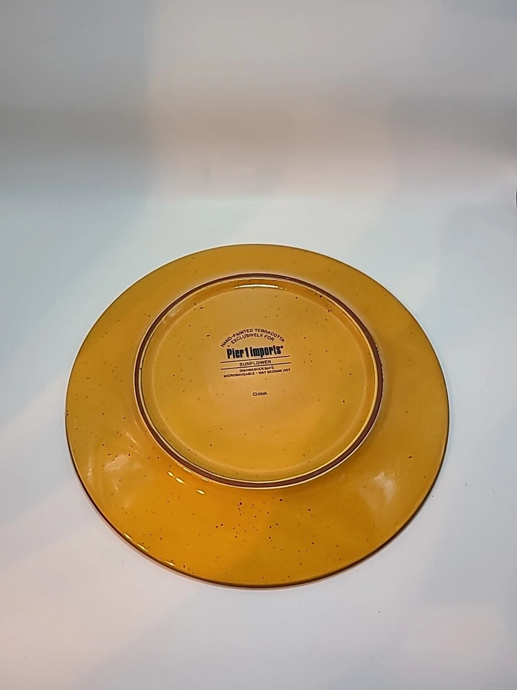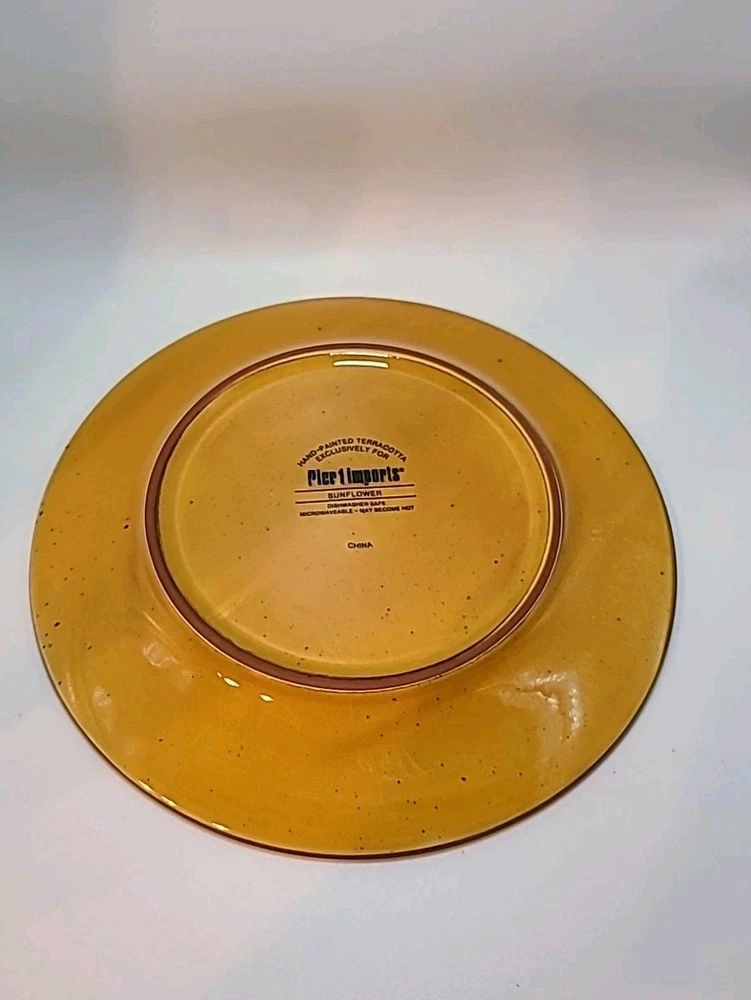 Pier 1 Imports Sunflower Salad Plates set of 4. Key details include: Brand: Pier 1 Imports Material: Ceramic/Terracotta Design: Features hand-painted sunflowers with a paisley patterned yellow rim Color: Predominantly yellow with red, green, and black accents Size: Approximately 8 inches in diameter Special Feature: Microwave safe Style: Americana Set of 4 Pre-owned good condition. No chips or cracks found. See pictures for details. No international shipments.