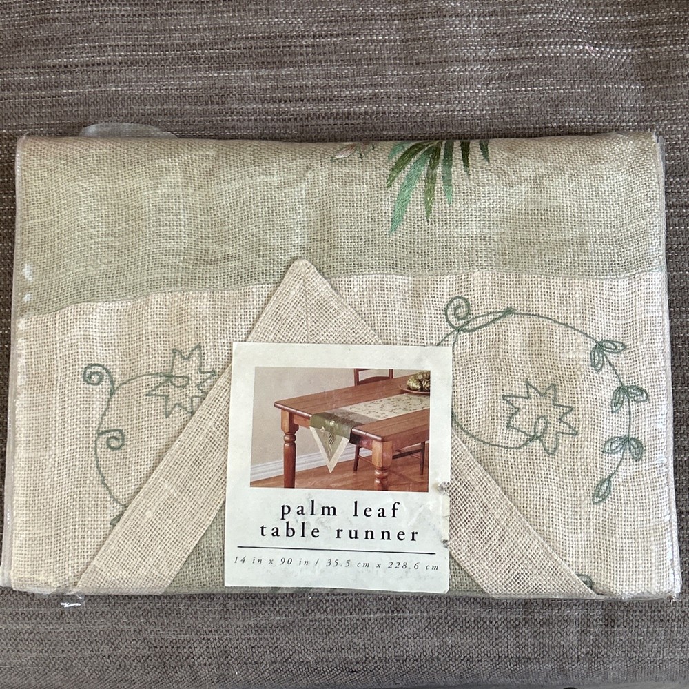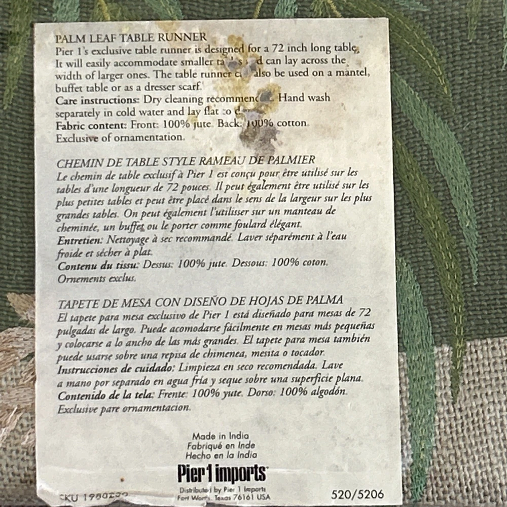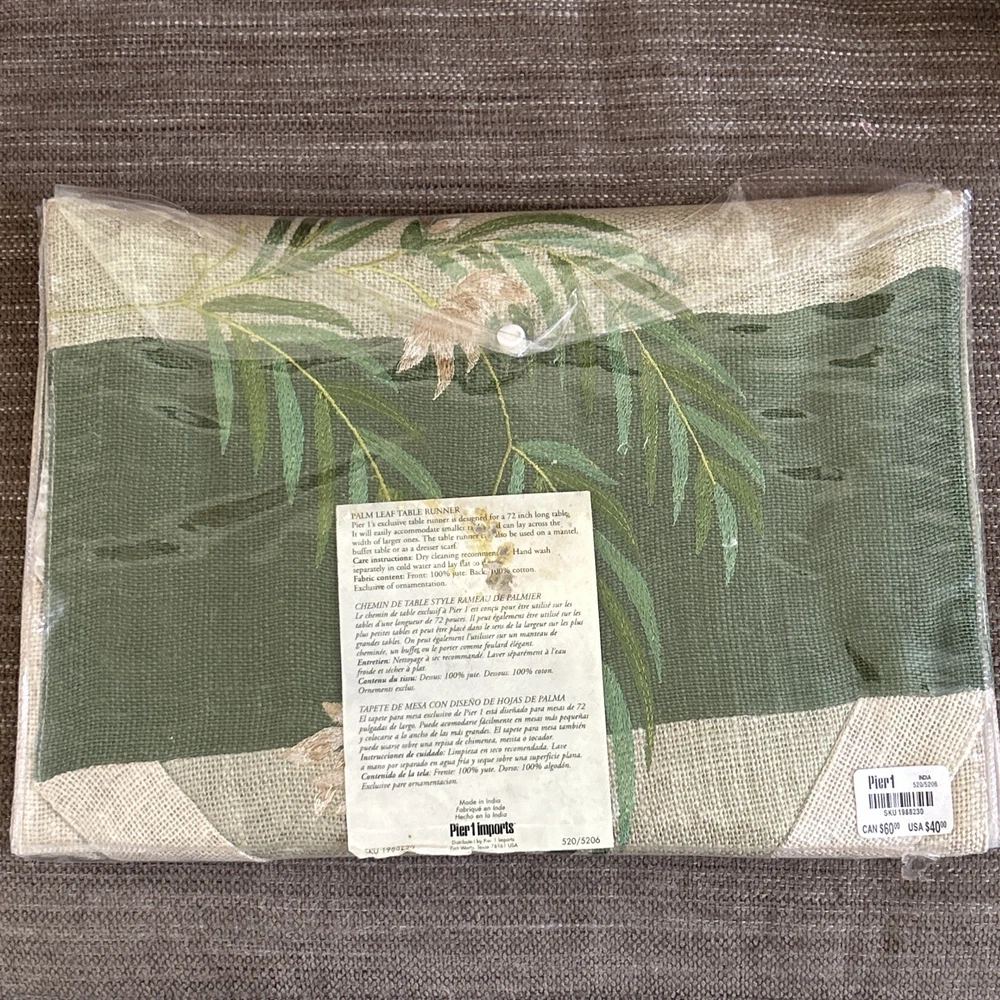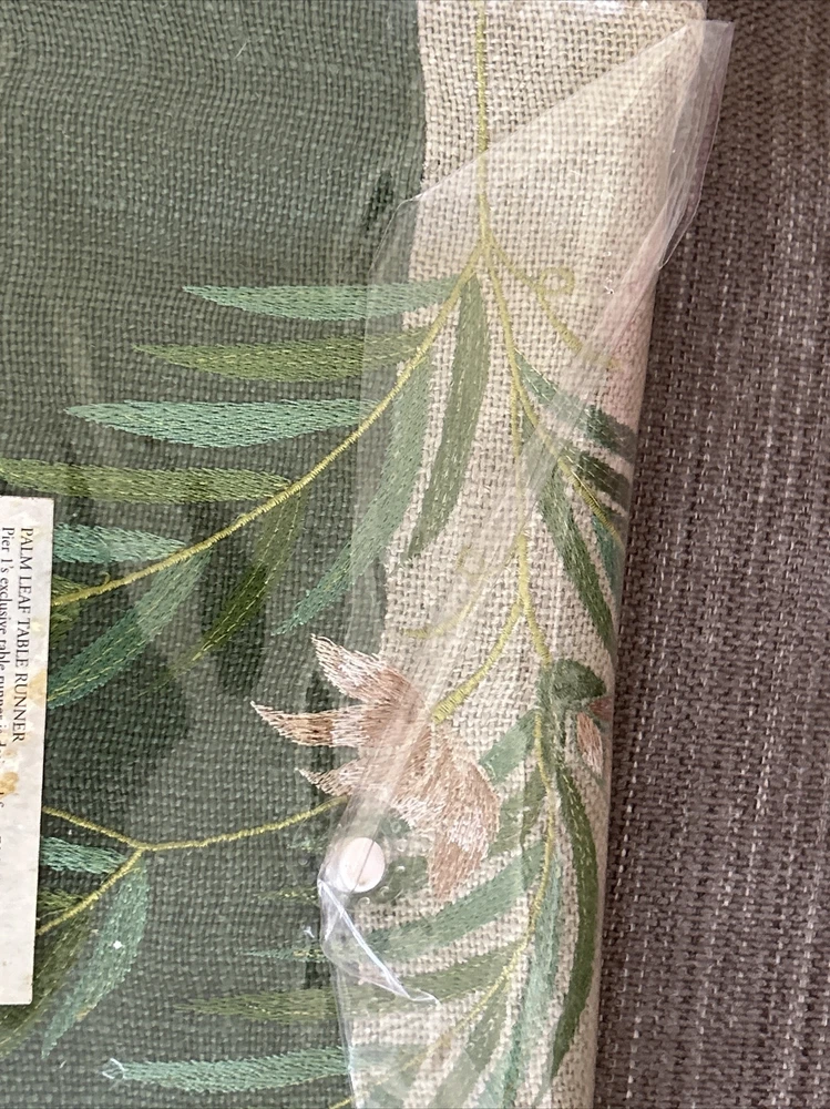 Pier 1 embroidered jute table runner Measuring 14x90” leaf pattern embroidered in shades of greens and tans. 100 % cotton backing Please note that the packaging is in rough shape but I did check the item and it is undamaged. Please see photos for details.