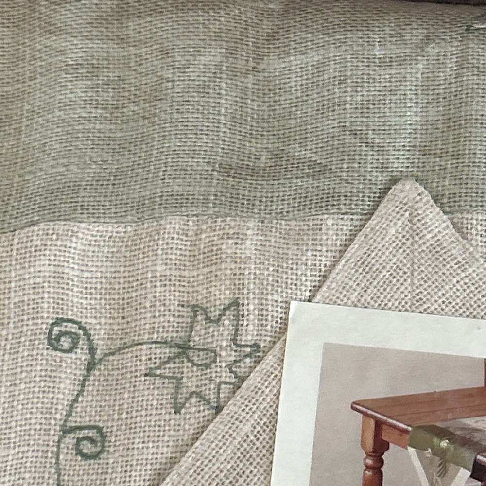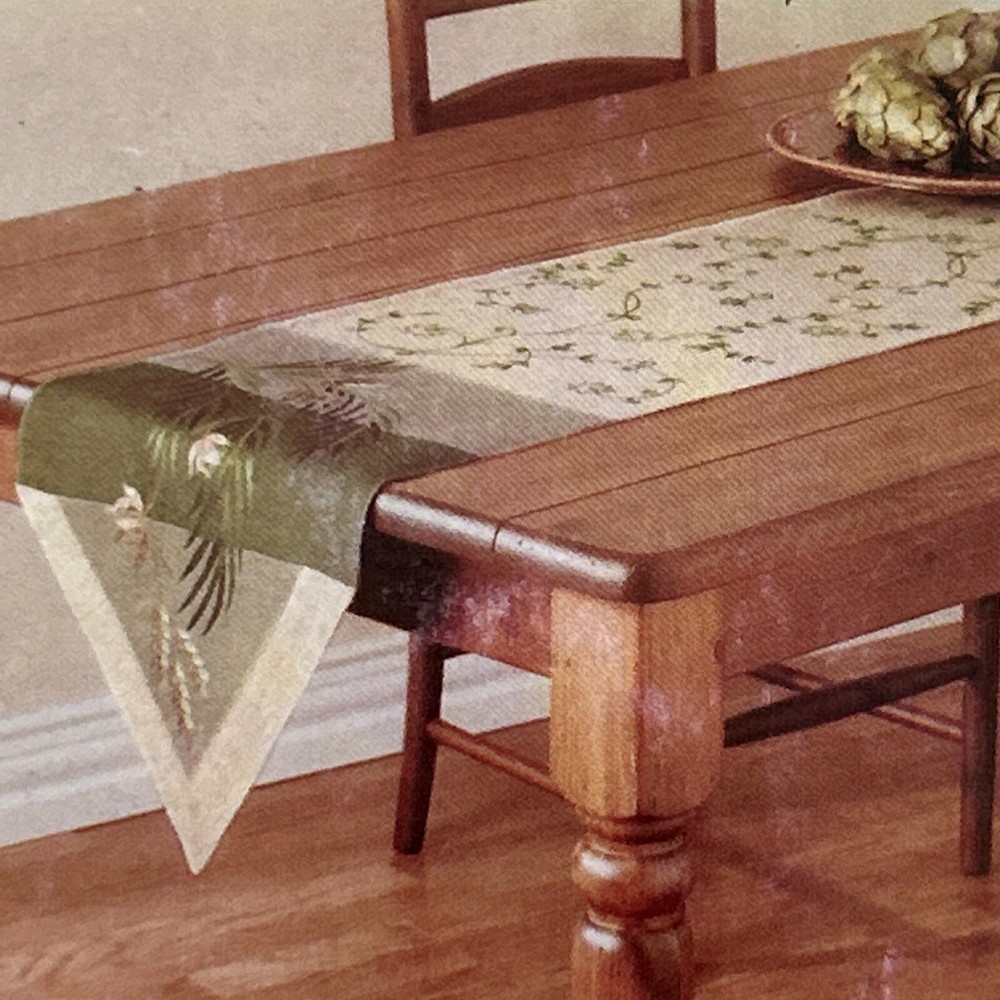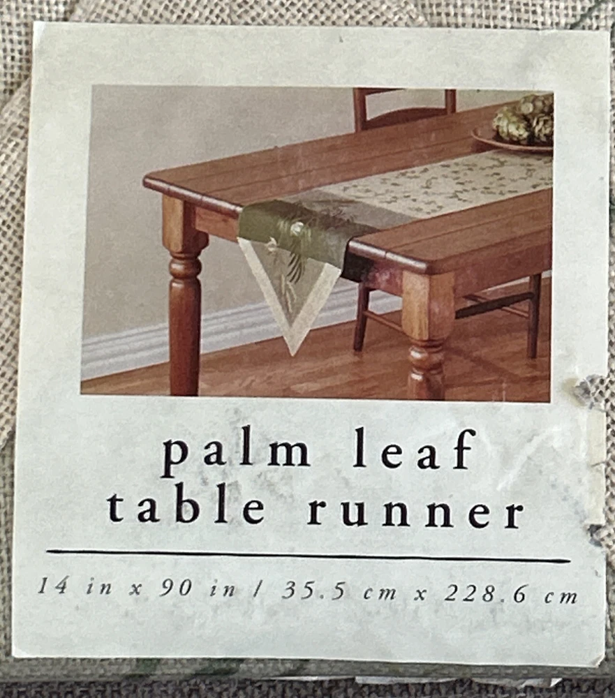 Pier 1 embroidered jute table runner Measuring 14x90” leaf pattern embroidered in shades of greens and tans. 100 % cotton backing Please note that the packaging is in rough shape but I did check the item and it is undamaged. Please see photos for details.