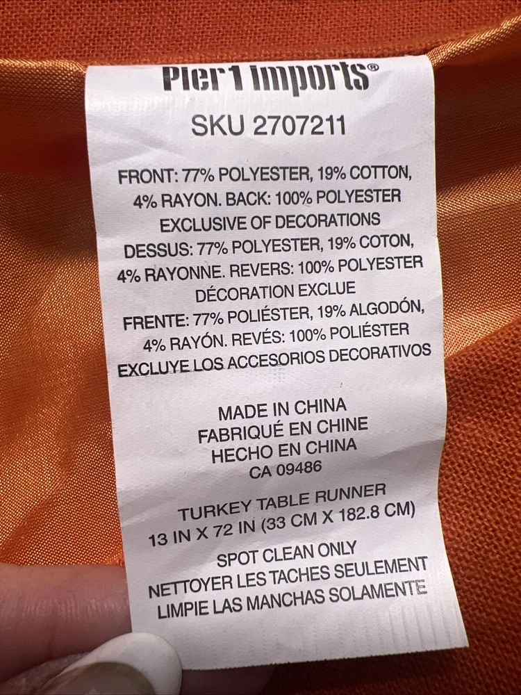 Add a touch of fall festivity to your dining table with this Pier 1 Table Runner. Featuring a pumpkin pattern and a classic style, this rectangular runner is perfect for a party or multipurpose occasion. The orange color and beaded features give it a fun and festive vibe, while the rayon and 100% polyester material ensure durability and easy maintenance. Measuring 71-90 inches in length and 10-15 inches in width, this table runner is a must-have for any fall-themed dinner party. Very nice gently used preowned condition. No tears holes or stains.