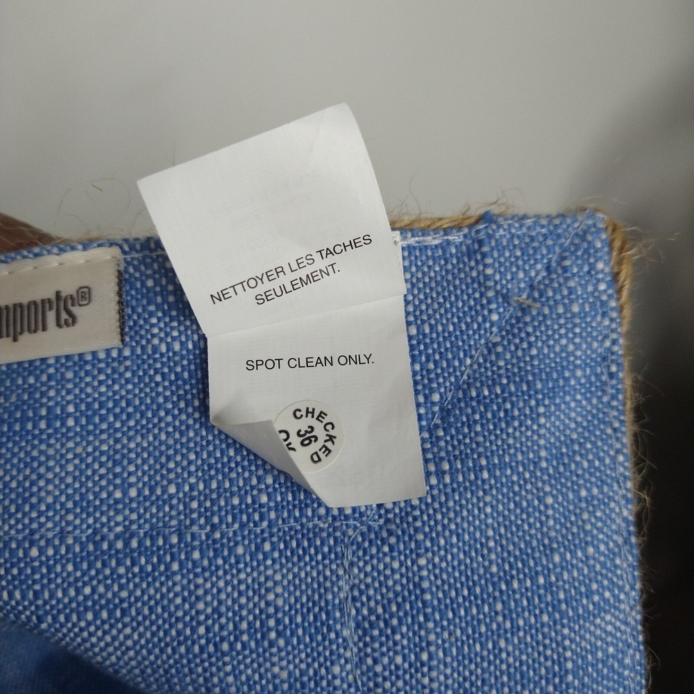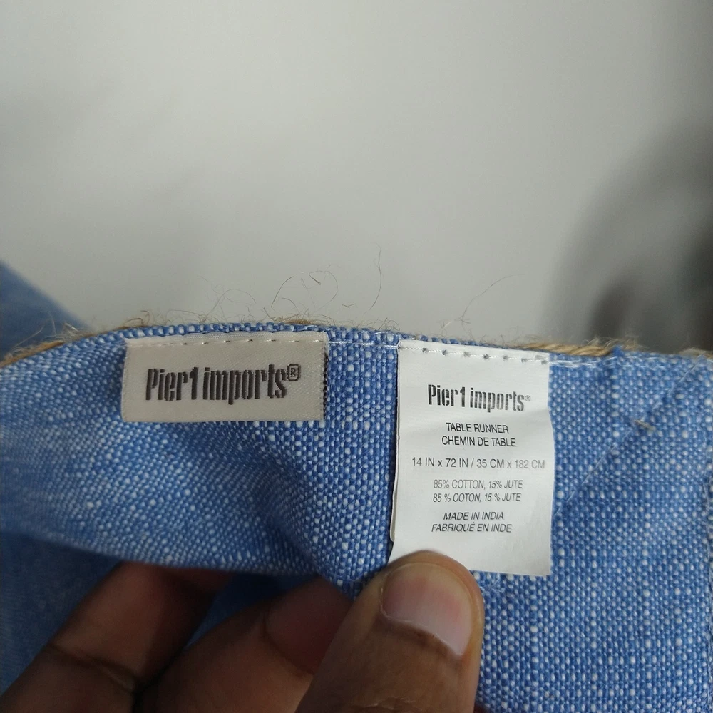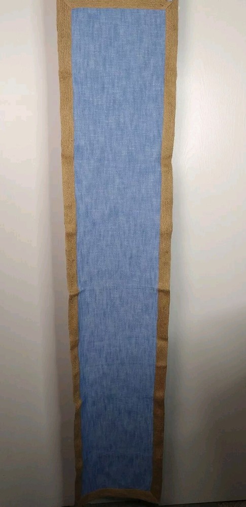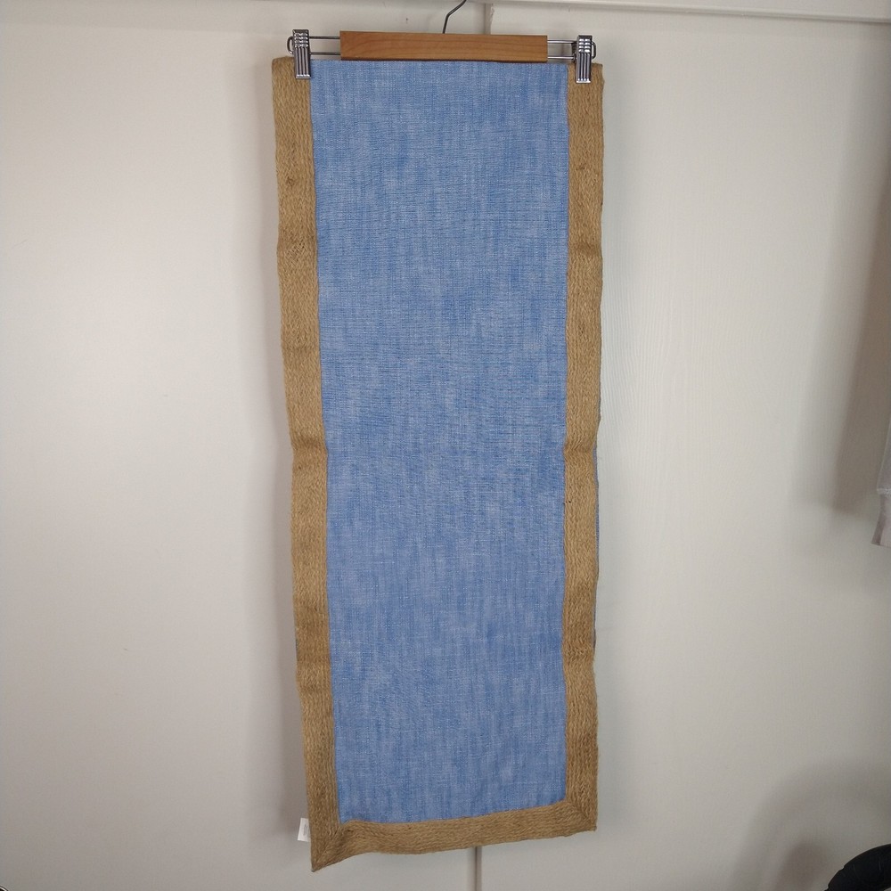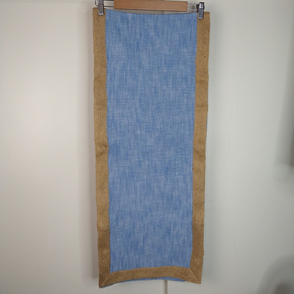 This Pier 1 table runner features a woven design with jute trim, giving it a beach house coastal vibe. The rectangular runner is made from a blend of cotton and jute, adding a natural touch to the piece. The blue denim color and chambray pattern enhance the beach theme, making it a versatile piece suitable for various occasions in a home setting. Measuring 14 inches wide by 72 inches long, this table runner is perfect for adding a touch of seaside charm to your dining or decor. Good preowned condition no flaws to note