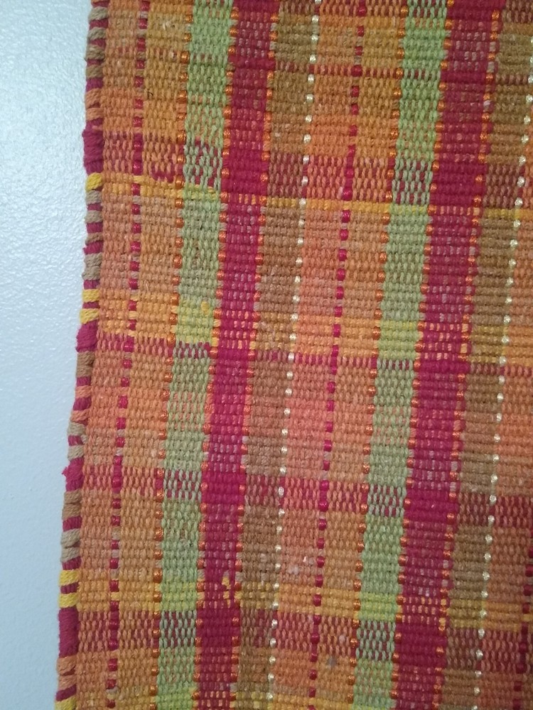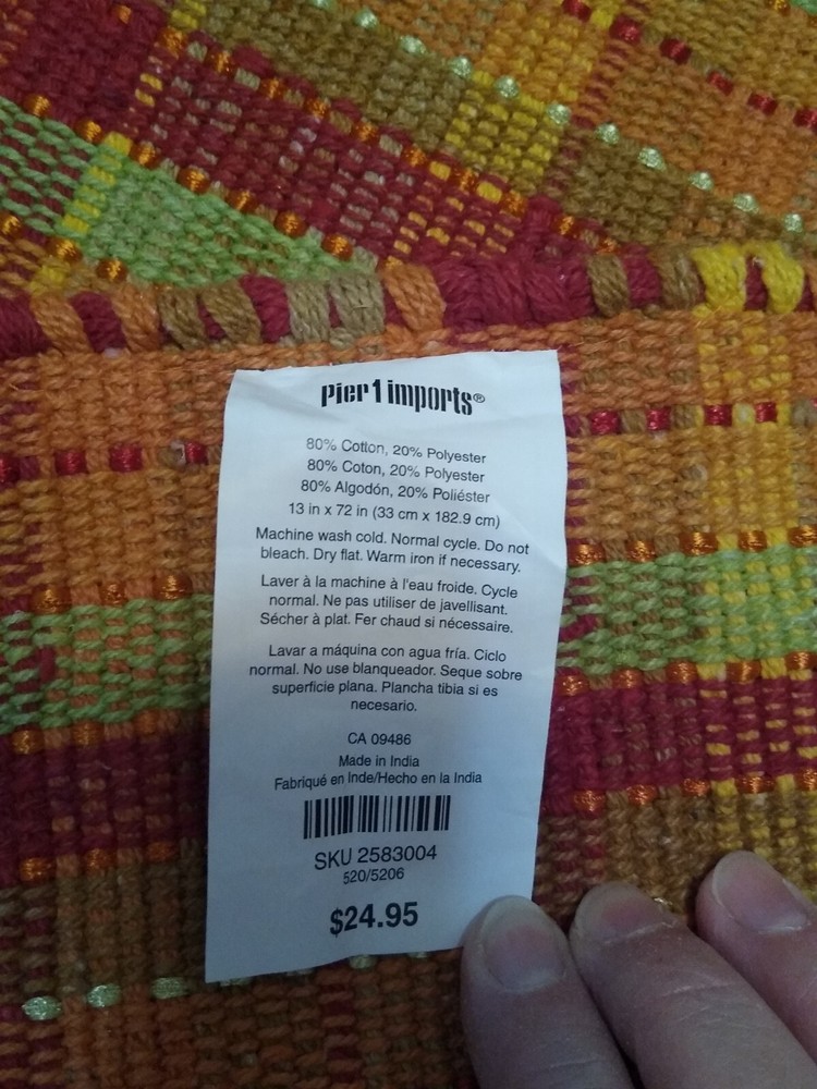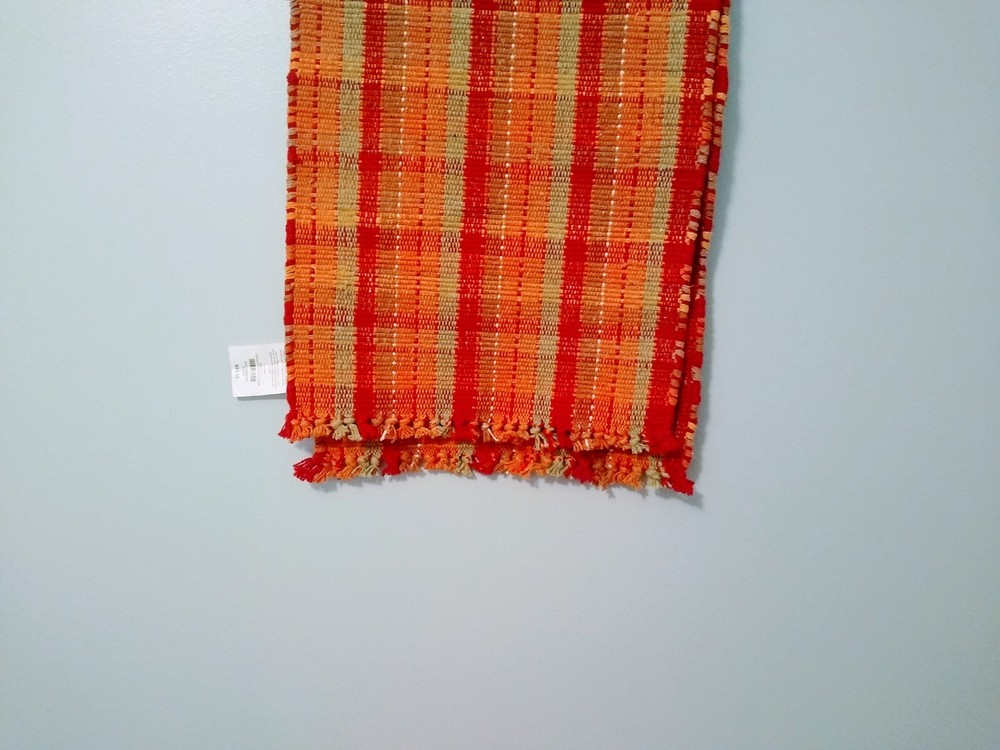 Add a pop of color to your dining table with this Pier 1 table runner. The woven design features bright red, orange, green, gold, and brown stripes, making it perfect for any occasion, from Christmas to fall. Measuring 72 inches in length and 13 inches in width, this modern-style table runner is made of 80% cotton and 20% polyester, making it machine washable and easy to care for. It also features a fringed edge for added texture and charm. This table runner is perfect for adults, but can also be used in children's play areas or craft rooms. Colors Are More Vibrant Than Pictures Show. Very Good Condition/Rarely Used Excess Shipping Will Be Returned. If You Have Any Questions Please Ask.