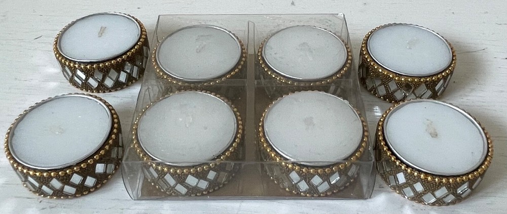Pier 1 Tea Light Candles & Holders Silver Beaded Mirror Cut Diamond Shape Design EXCELLENT NEW CONDITION 4 Still in original box 4 are out of the box but never used!!!!! Email me with any questions.