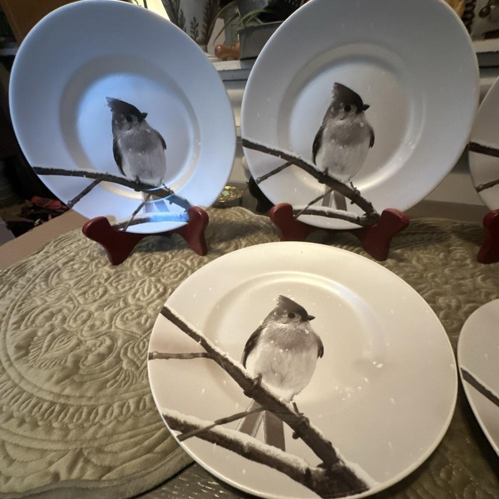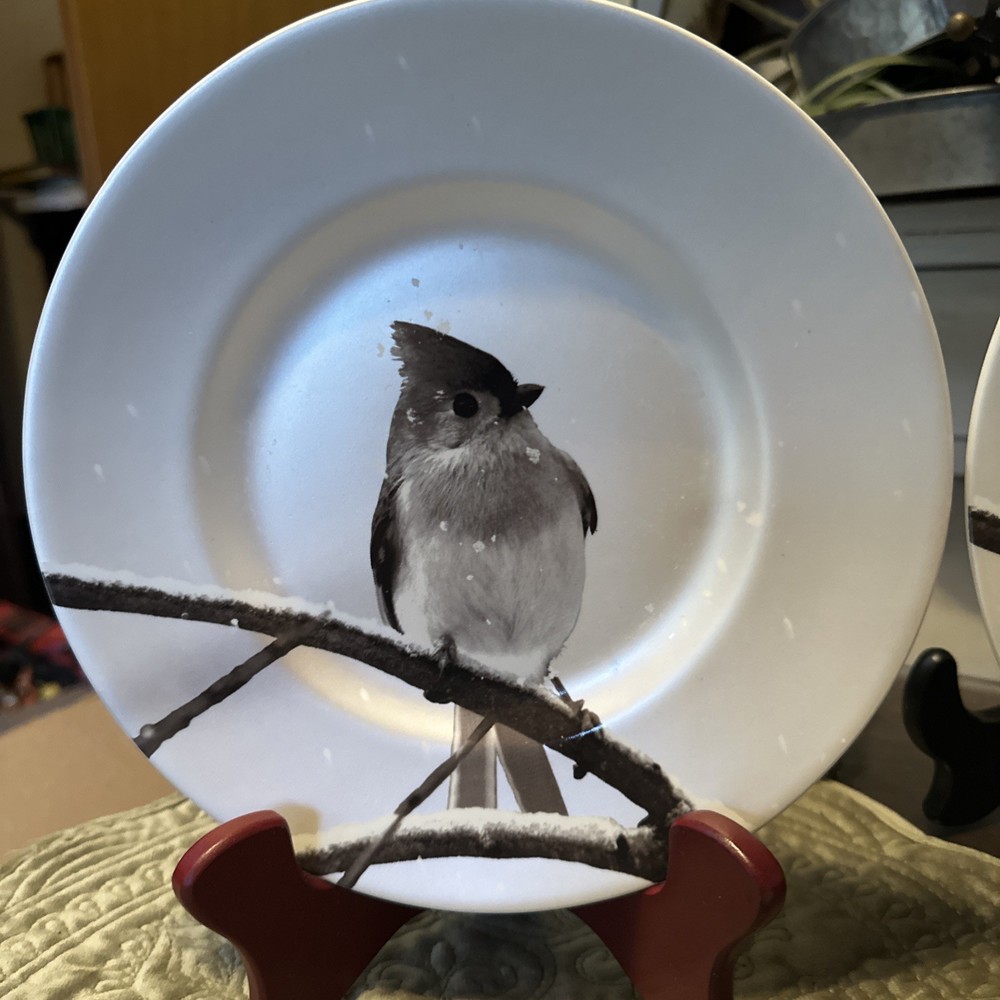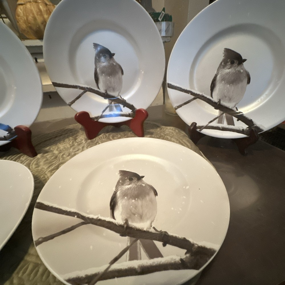 Set the winter scene with Pier 1's Titmouse bird dessert plates. This set of 6 round porcelain plates features a pearlescent finish with a multicolor bird pattern. Each plate measures 8 5/8" in diameter and is perfect for adding a touch of nature to your table setting during the winter season. Made in Indonesia, these original Pier 1 plates are a delightful addition to your collection.