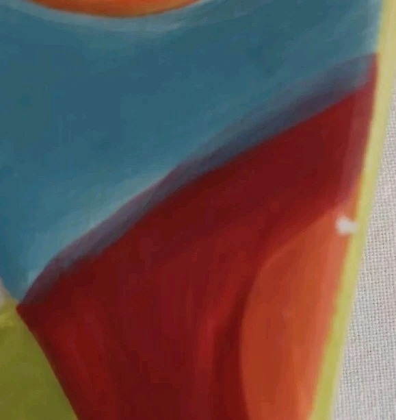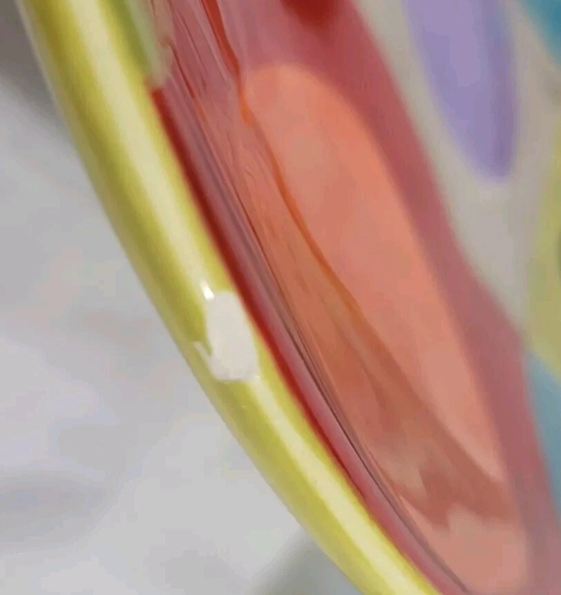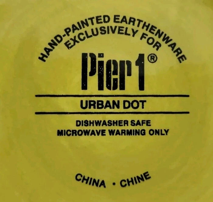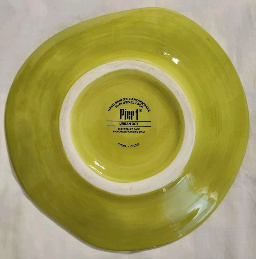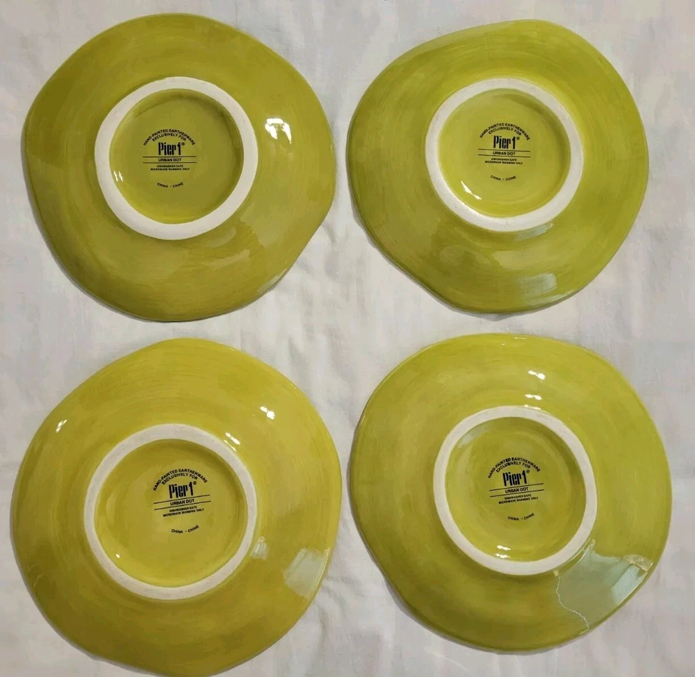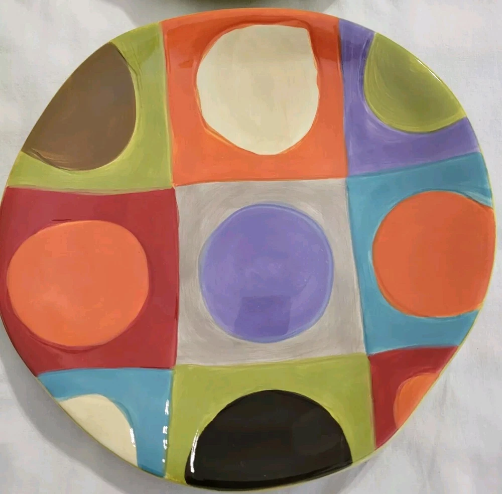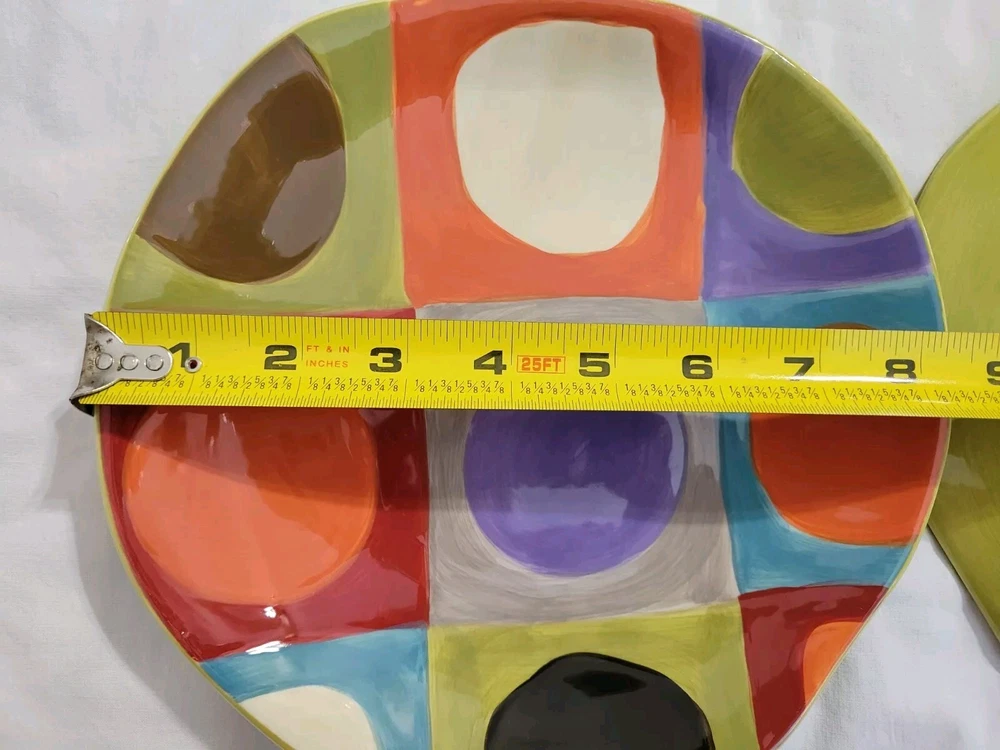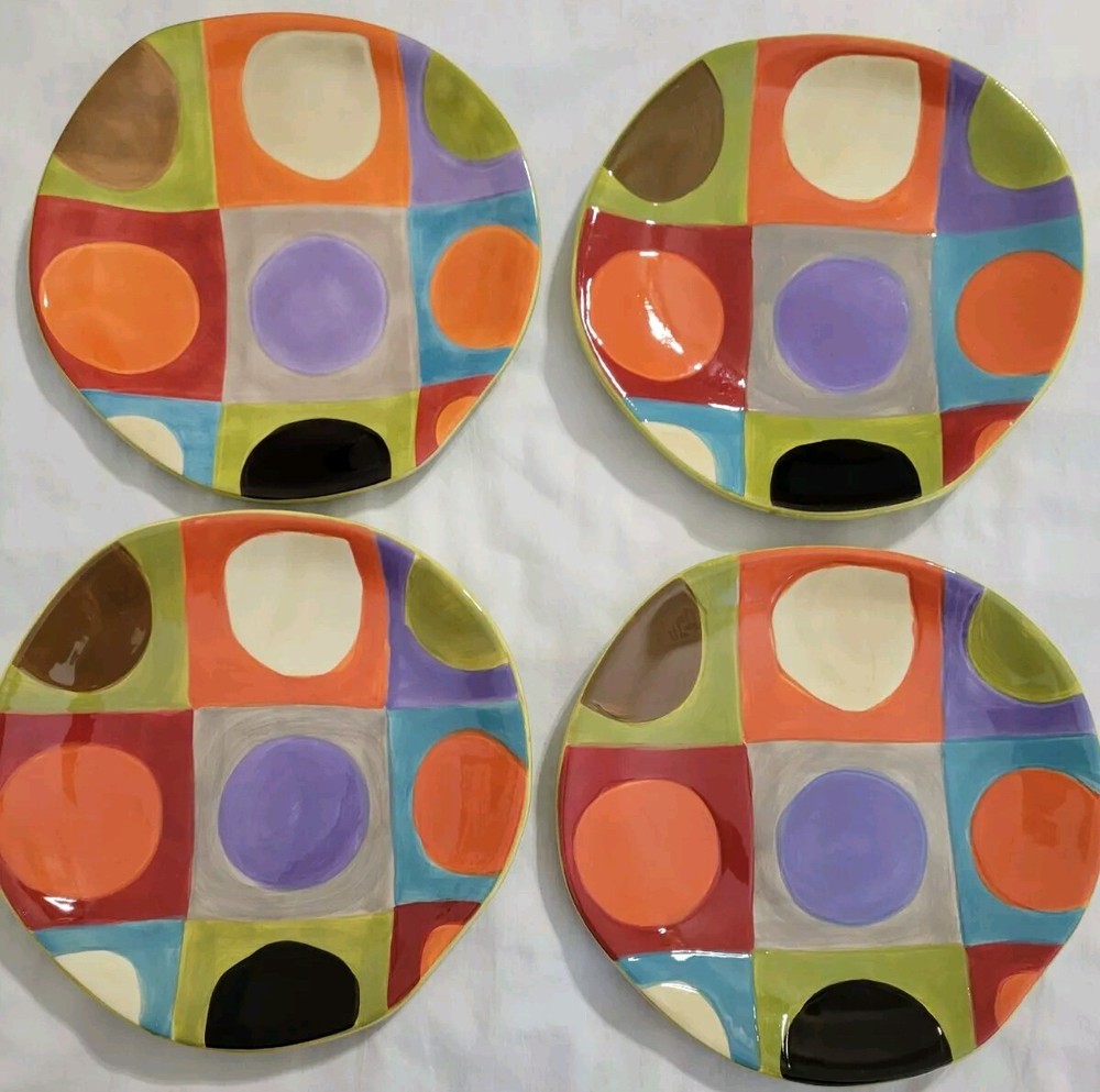 Plates are decorated with colorful circles. 2 plates are without flaws, one has a tiny glaze chip and one has a small rim chip. Please see photos. Plates are luncheon size or would make great salad or dessert plates. Their shape is approximately round, irregular edge.