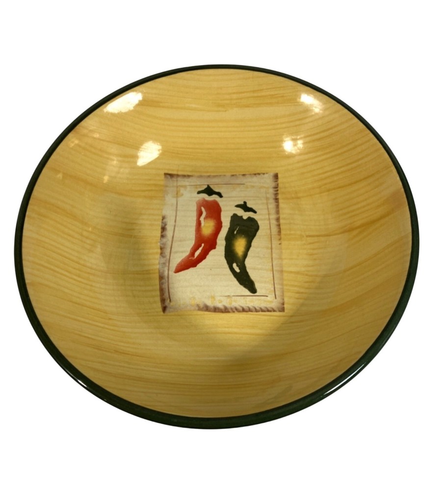 This Pier 1 Verdura pasta bowl, crafted in Italy, features a charming pepper design. The handpainted earthenware exudes rustic sophistication, reminiscent of old-world charm. • 8.25"-inch diameter • Green rim accent • Handcrafted in Italy • Durable earthenware • Rustic chili pepper design