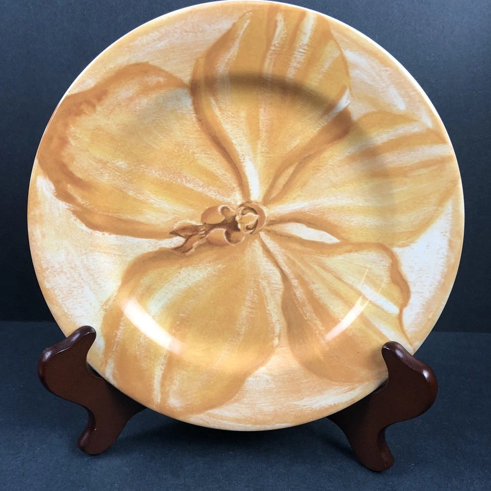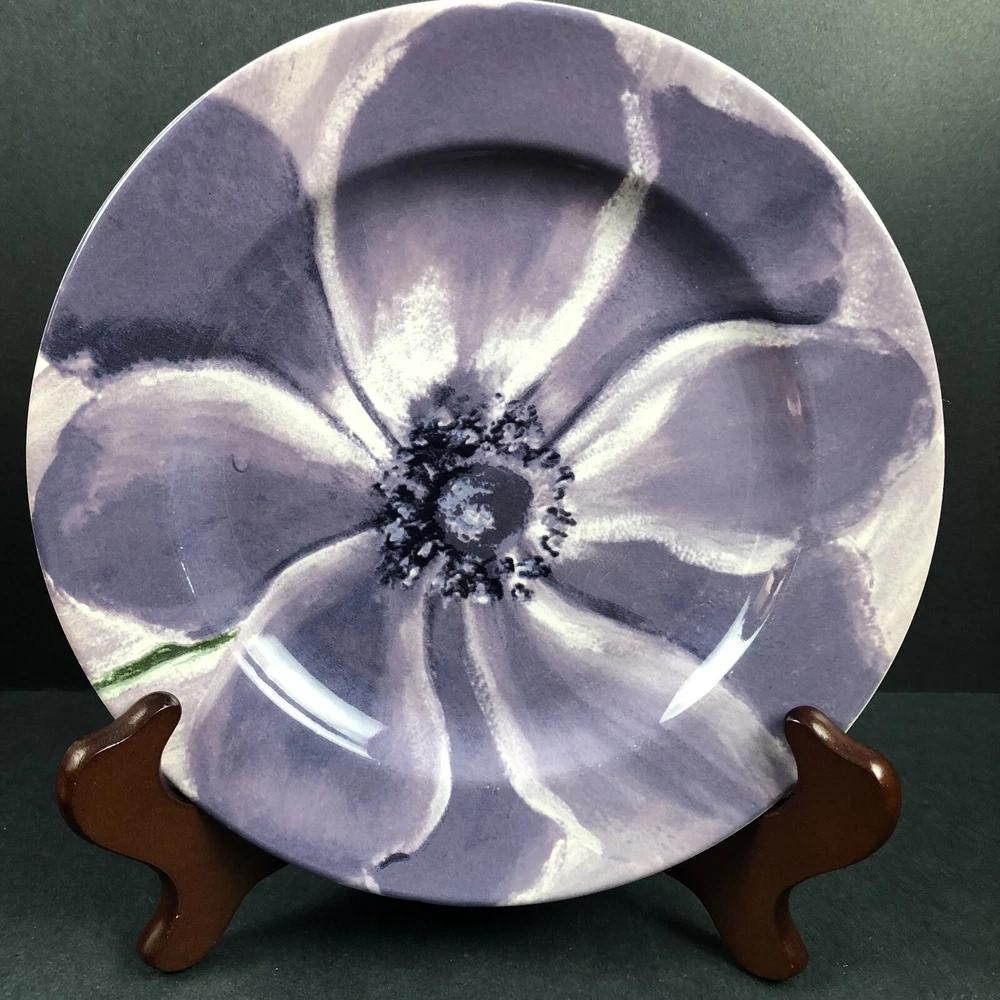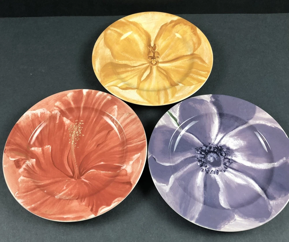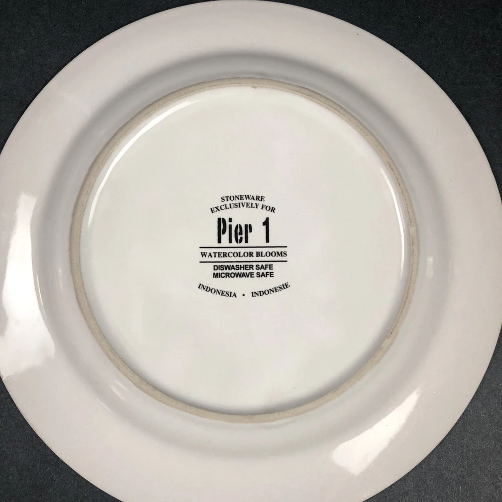 Add a touch of contemporary elegance to your dining table with this set of three Pier 1 Watercolor Blooms luncheon dessert salad plates. The round plates measure 8 inches in diameter and feature a beautiful floral pattern in a glossy, multi-color finish. Made of durable, dishwasher safe stoneware, these plates are perfect for all occasions and are microwave safe for easy reheating. The set includes 3 salad/dessert plates from the Watercolor Blooms collection, one red, one yellow and one purple with a printed back stamp. These plates are perfect for anyone who loves stylish and functional dinnerware. Add a touch of sophistication to your table setting with these beautiful plates made exclusively for Pier 1.