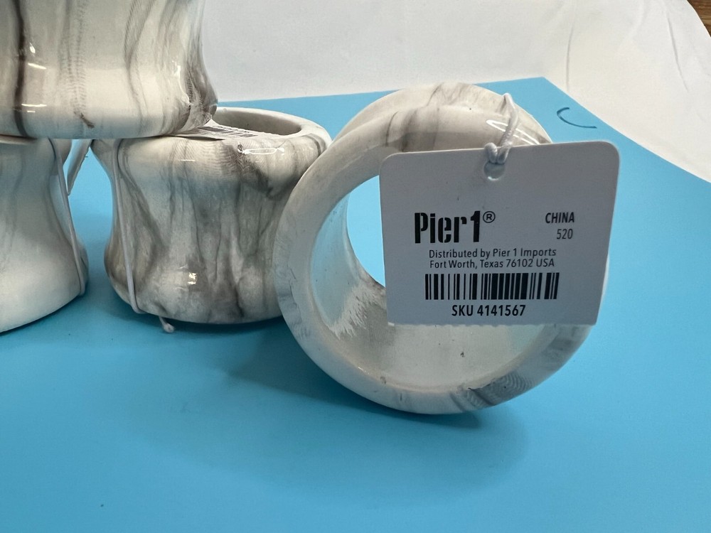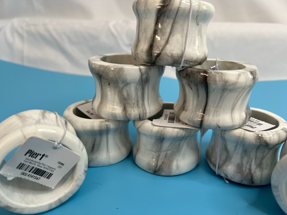 Add a touch of elegance to your dinner table with these Pier 1 napkin rings. The rings are designed with a beautiful white and gray marble pattern that will complement any table setting. Each pack includes 8 napkin rings, perfect for hosting dinner parties or any special occasion.Crafted from high-quality plastic and marble materials, these napkin rings are durable and long-lasting. The rings are easy to clean and maintain, making them a practical addition to your dining experience. Ideal for use in any home or office, these napkin rings are a must-have for anyone who loves to entertain guests. Pier 1 White Gray Marble Design 8 Count Napkin Rings Holders NWT.