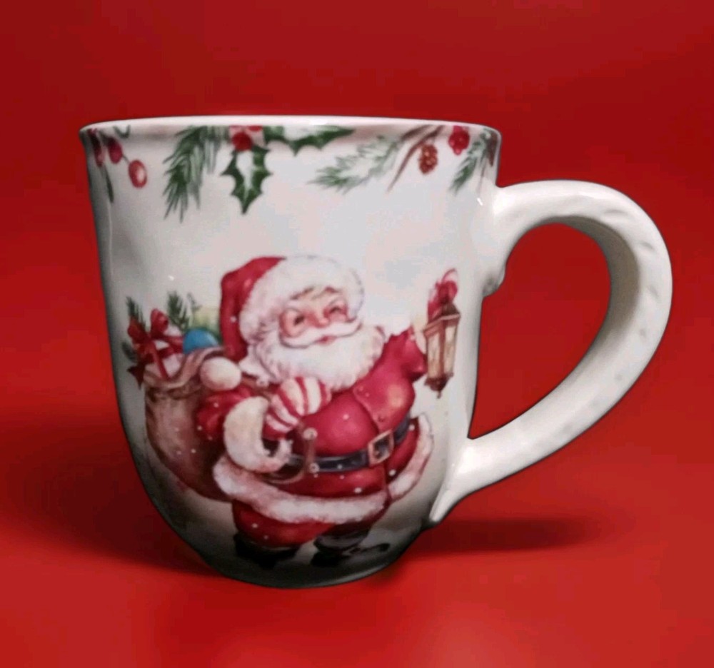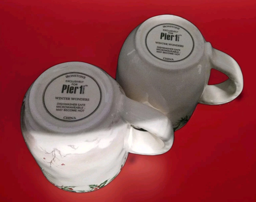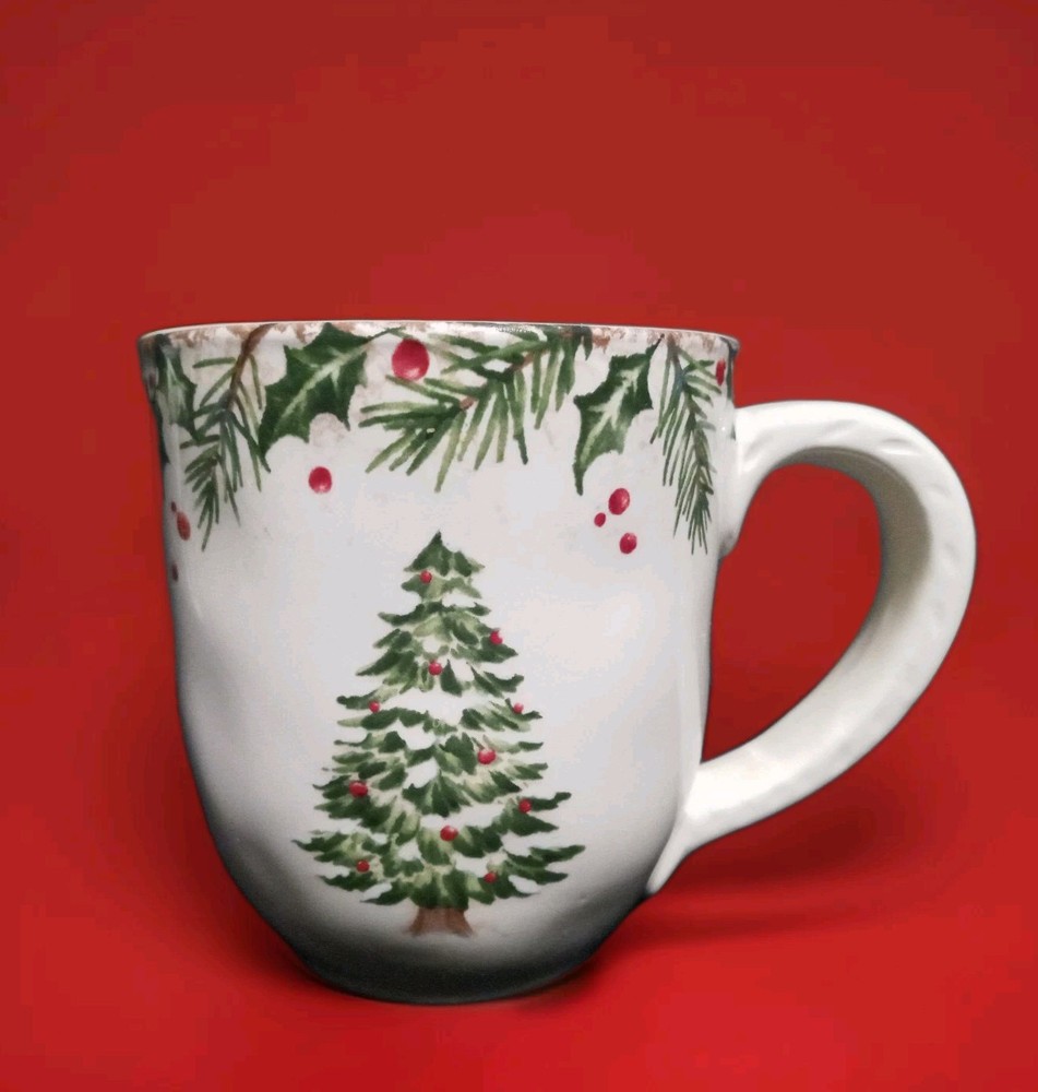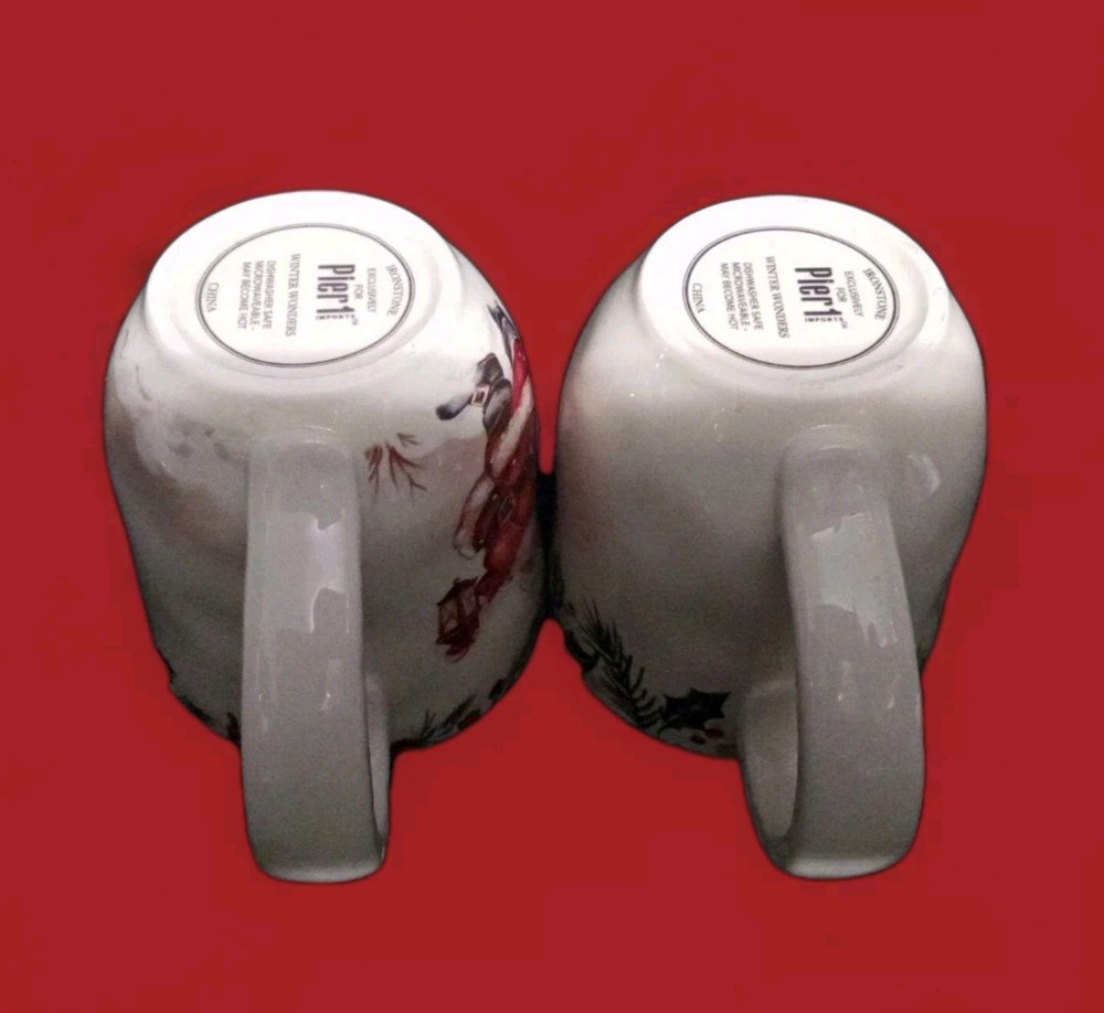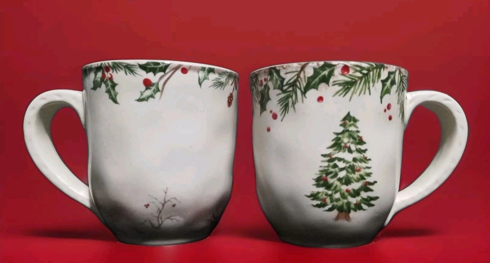 Elevate your holiday table with the Pier 1 Winter Wonders Santa Lantern Christmas Tree Coffee Tea Mugs Cups 2pc Set. These stoneware mugs feature a charming Christmas Berries Woodland pattern with a festive red, white, and green color scheme. The mugs are adorned with pinecones, berries, holly, and mistletoe, creating a whimsical and seasonal vibe. Ideal for Christmas morning coffee or evening tea, this set of two cups is sure to impress your guests. The mugs are part of Pier 1's Winter Wonders product line, which was manufactured between 2010 and 2019. Add these beautiful mugs to your collection and enjoy the holiday spirit they bring to your home. Condition Items are in excellent preloved condition Excellent replacement or backup mugs