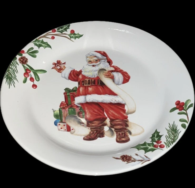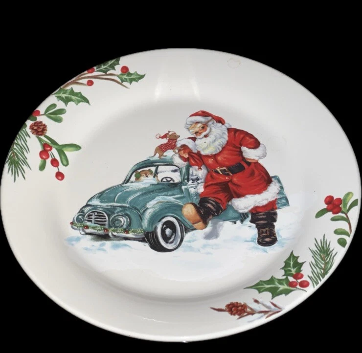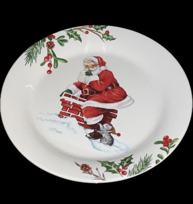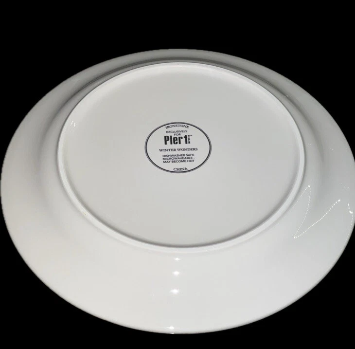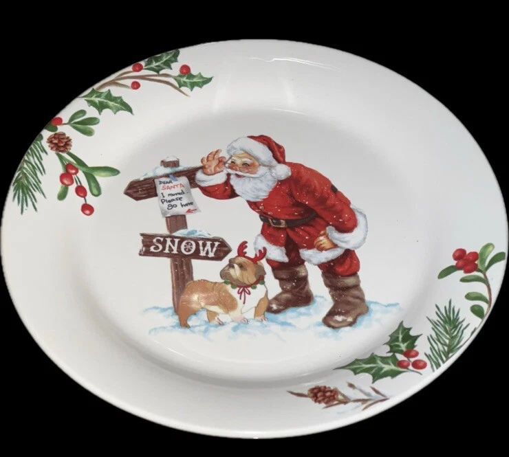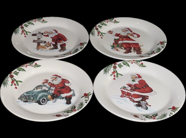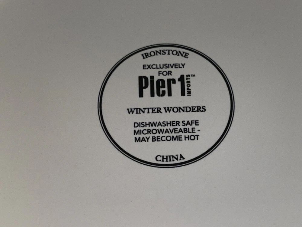 CONDITION; PRE- OWNED, NEVER USED - PRISTINE Add a touch of Christmas magic to your dining table with this set of four Pier 1 Winter Wonders Wonderland Santa Salad Plates. Each plate has a glossy finish and features a white ironstone base with a charming Santa pattern in the center. The round plates have a diameter of 8 7/8” and are microwave and dishwasher safe, making them perfect for everyday use. Ideal for your winter table setting, these plates are not only functional but also a beautiful addition to your home decor. Get ready to impress your guests with these original Pier 1 salad plates that are perfect for your Christmas-themed meals. SET INCLUDES; 1) SANTA & CAR 1) SANTA & DOG 1) SANTA & CHIMNEY 1) SANTA & LIST