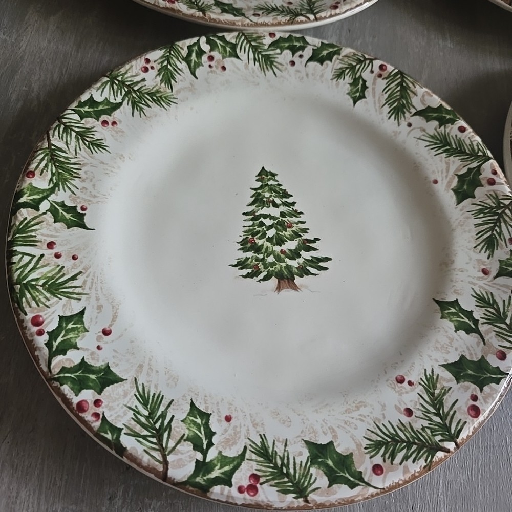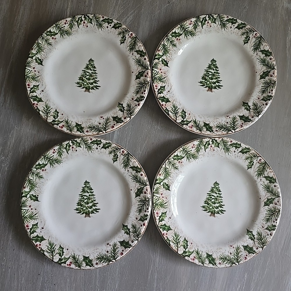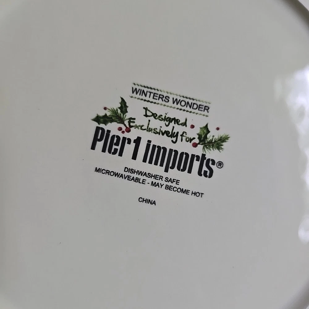 Winters Wonder Salad Plate Pier 1 Imports Christmas Tree with Pine Holly Border, set of 4. These cream colored salad plates by Pier 1 have a Christmas tree in the middle coated in snow and red balls shaped ornaments. The rim is decorated with a pine and holly border. It measures 8 5/8” across. This discontinued design was made from 2014 - 2021. In excellent condition. No chips or cracks.