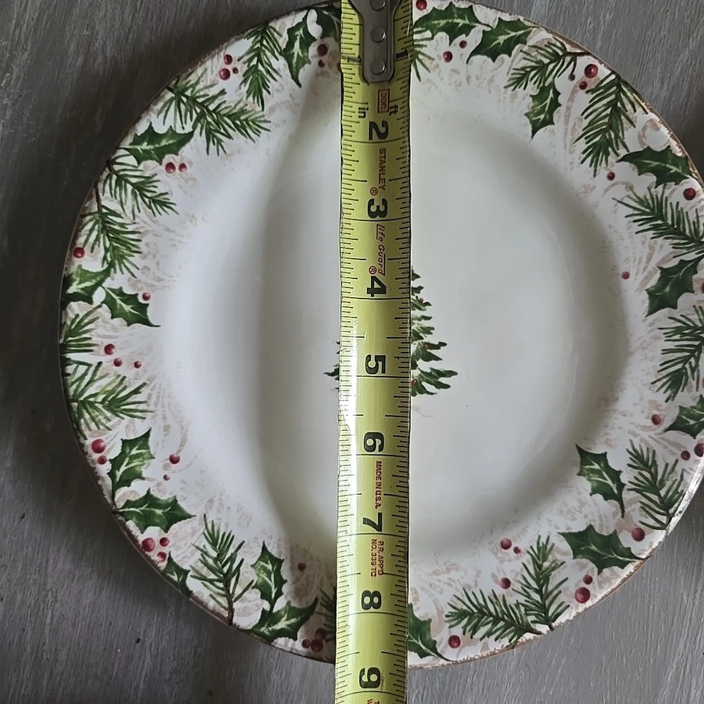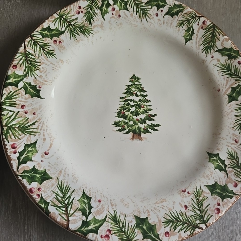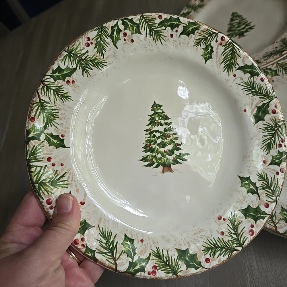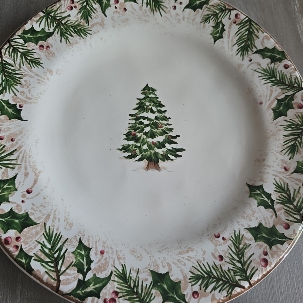 Winters Wonder Salad Plate Pier 1 Imports Christmas Tree with Pine Holly Border, set of 4. These cream colored salad plates by Pier 1 have a Christmas tree in the middle coated in snow and red balls shaped ornaments. The rim is decorated with a pine and holly border. It measures 8 5/8” across. This discontinued design was made from 2014 - 2021. In excellent condition. No chips or cracks.