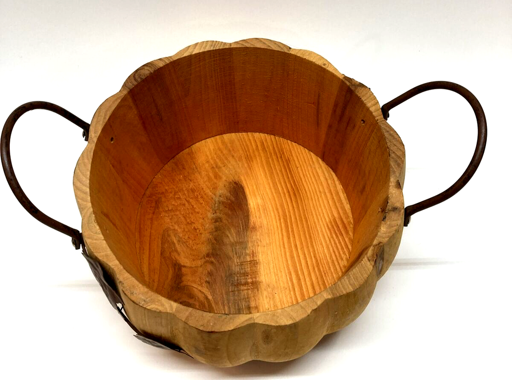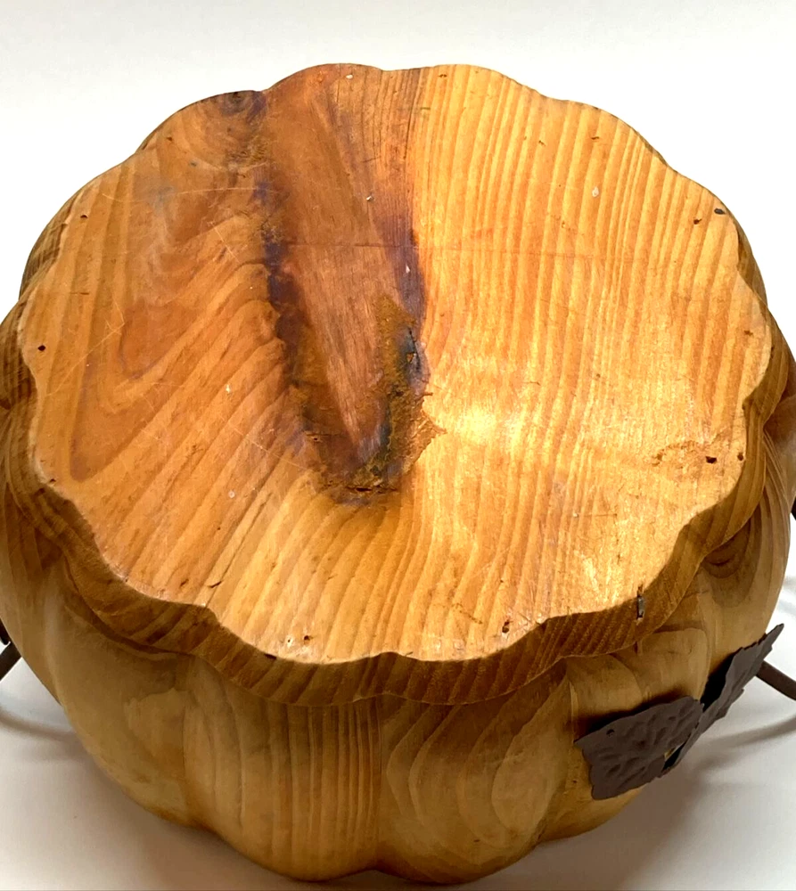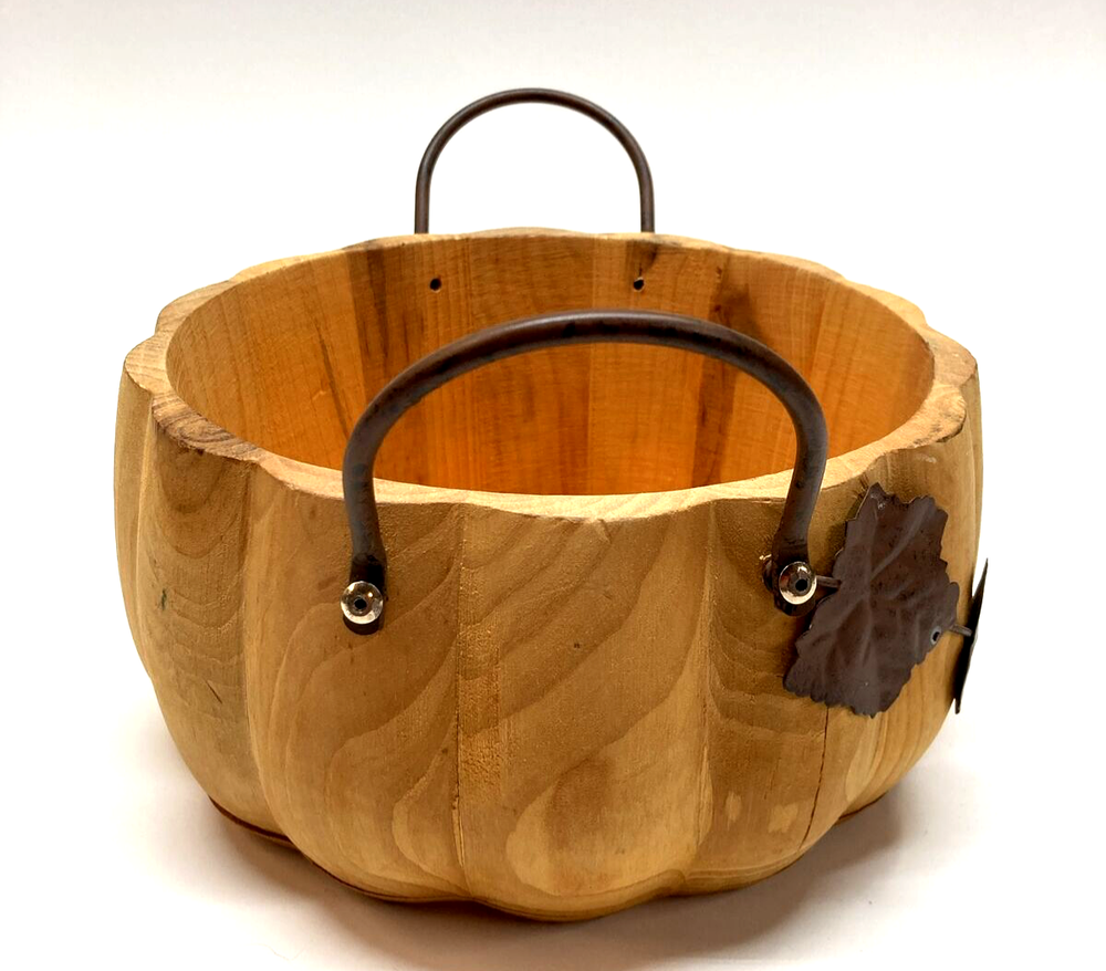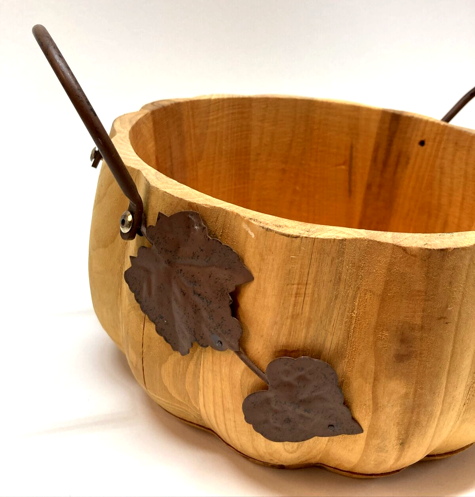 Pier 1 Wooden Pumpkin Bowl Basket Metal Handles and Leaf Fall Design Approx. 4.5” Tall X 8.5” Wide No stains, 2 minor cracks on side due to natural wood drying - does not affect the stability of bowl