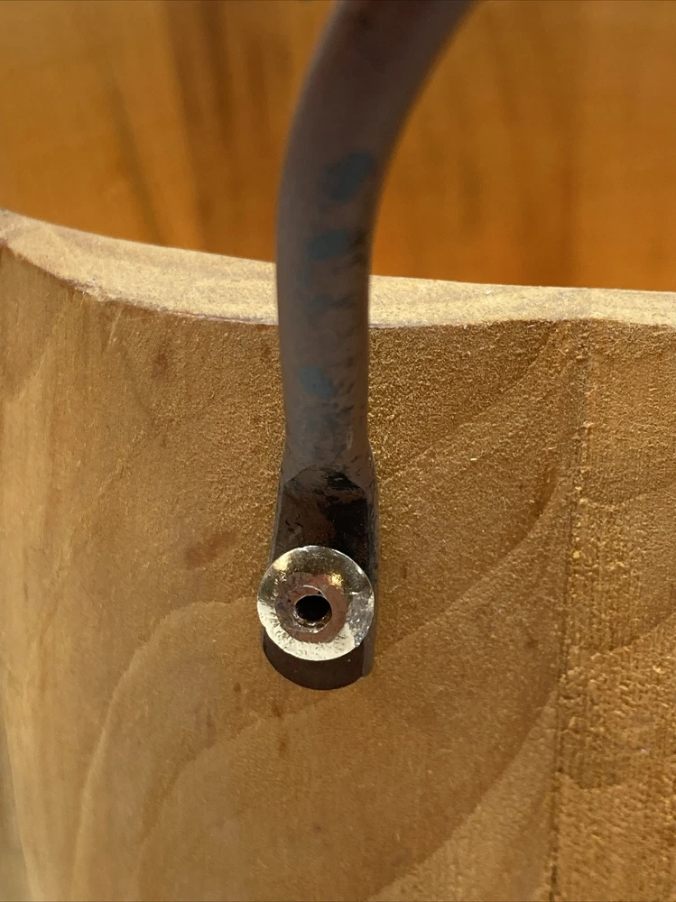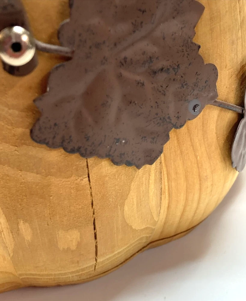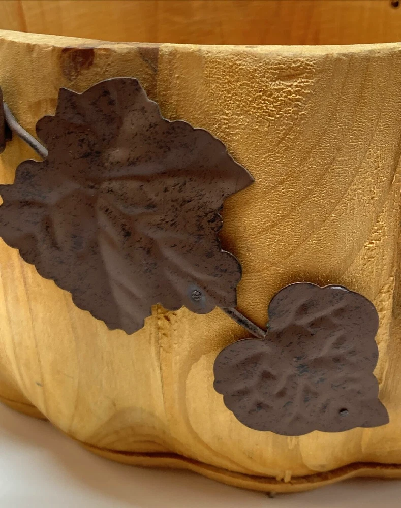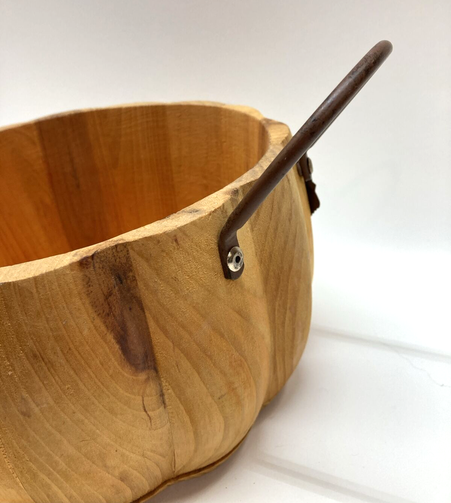 Pier 1 Wooden Pumpkin Bowl Basket Metal Handles and Leaf Fall Design Approx. 4.5” Tall X 8.5” Wide No stains, 2 minor cracks on side due to natural wood drying - does not affect the stability of bowl